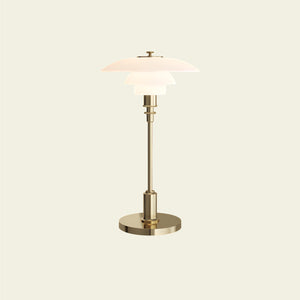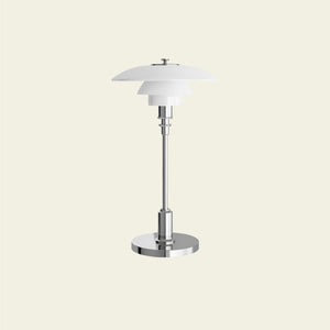 This portable lamp is a wireless version of the classic compact table lamp, featuring hand-blown opal glass shades with a high-gloss chrome or metallic brass-plated stem and base. It is ideal for both indoor and outdoor use, particularly in areas where access to a main power source is difficult, such as bookshelves or bedside tables.