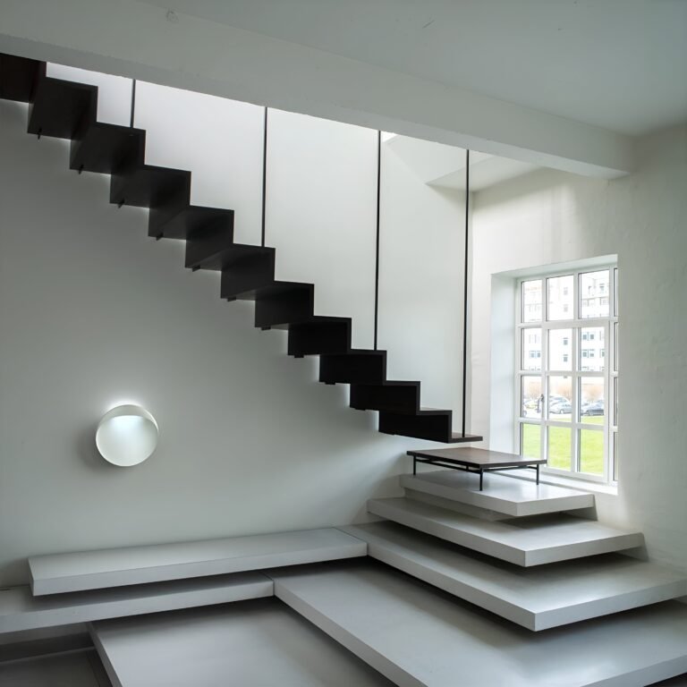 The Flat 5940 lamps are a creation by the designer. These disc-shaped lights descend from the ceiling to form a
