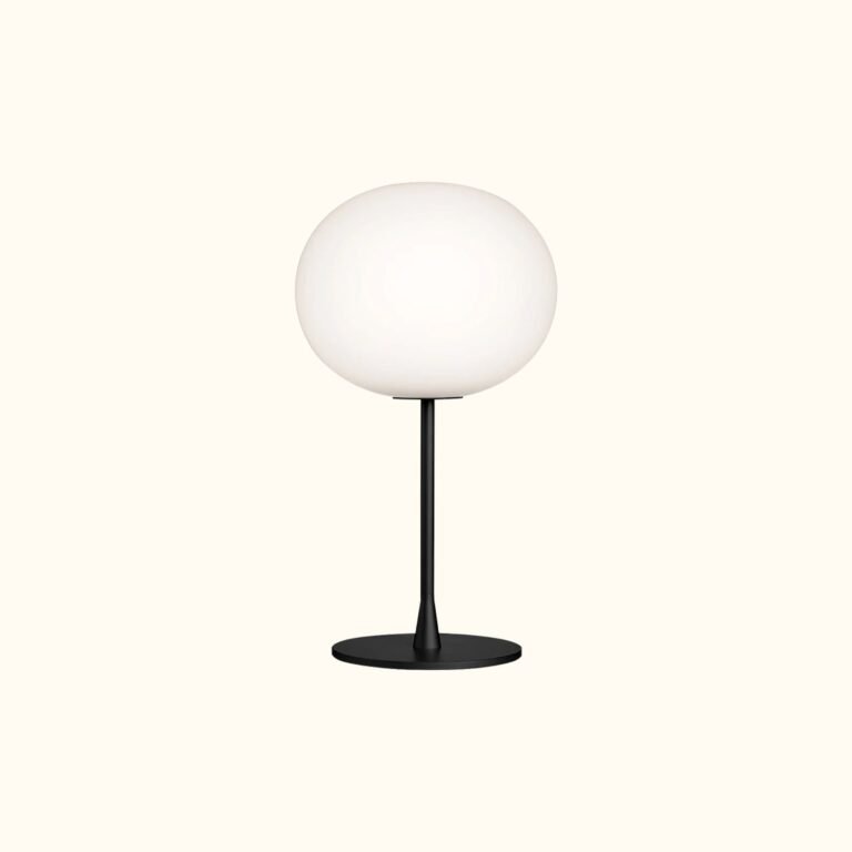 This table lamp is made of hand-blown opaline glass, providing diffused light, with a high-thickness steel base and stem painted