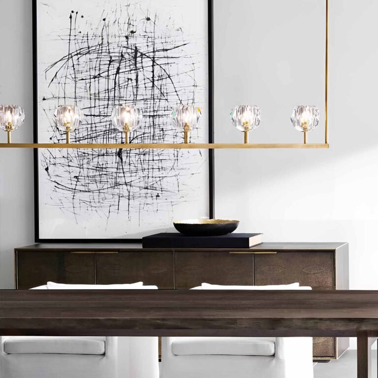 Designer Jonathan Browning’s sculptural fixture, crafted from solid brass and crystal glass, exemplifies his dedication to luxurious materials and exceptional