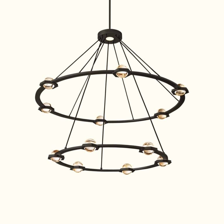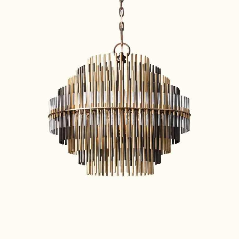 The profile of our chandelier is composed of ascending and descending concentric spires, inspired by a 1970s design. Multiple tiers