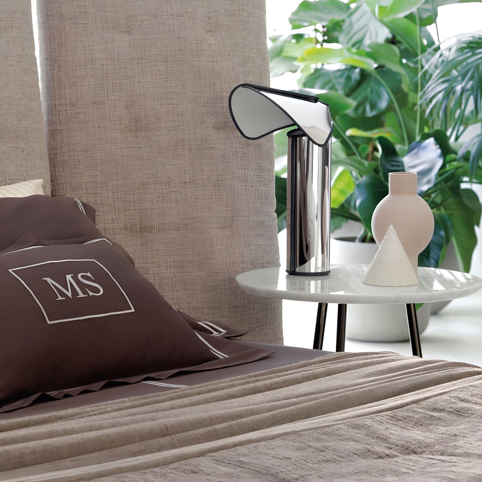 The structure of the Chiara table lamp conceals an LED lighting source that bounces off the top hat-like structure, casting a diffuse light.