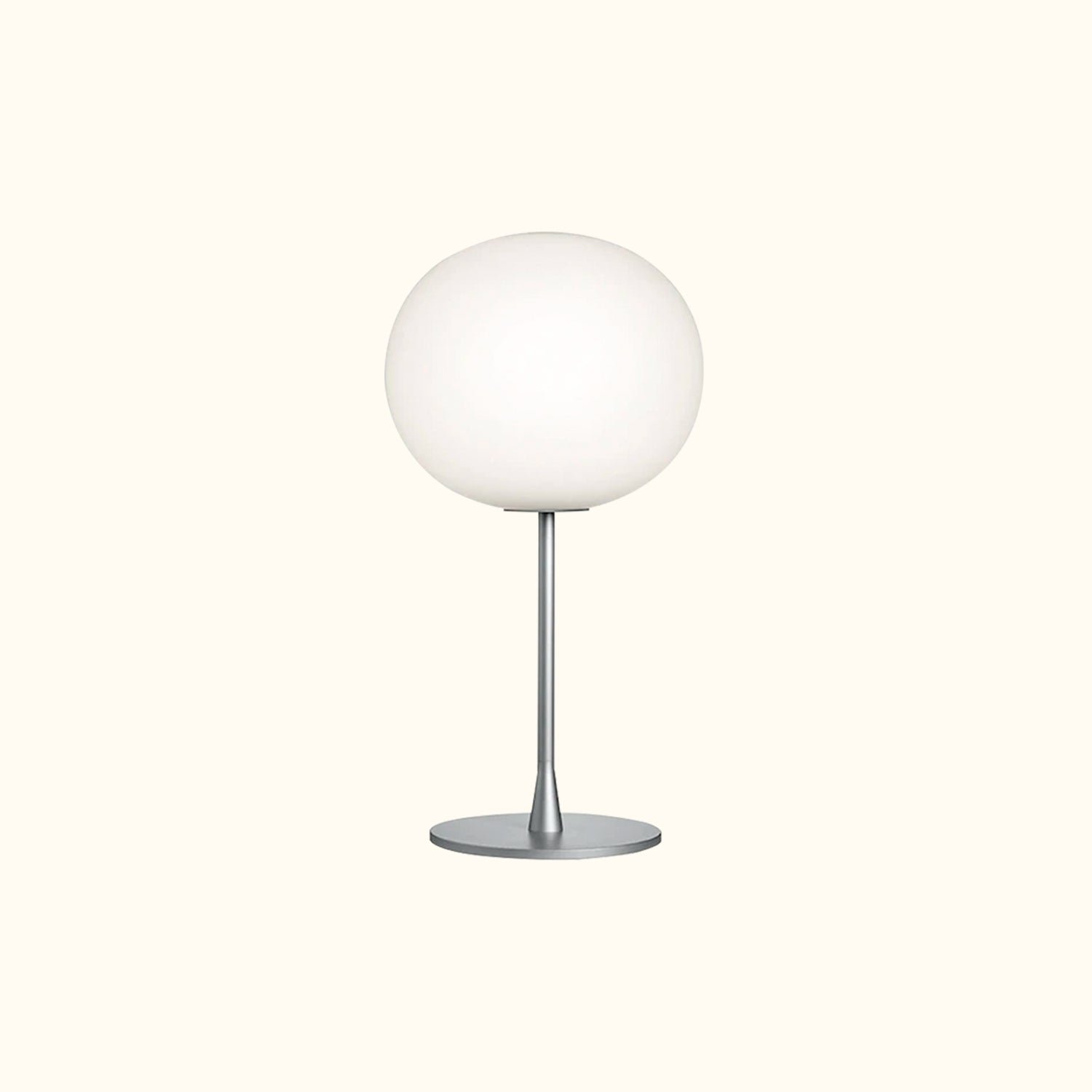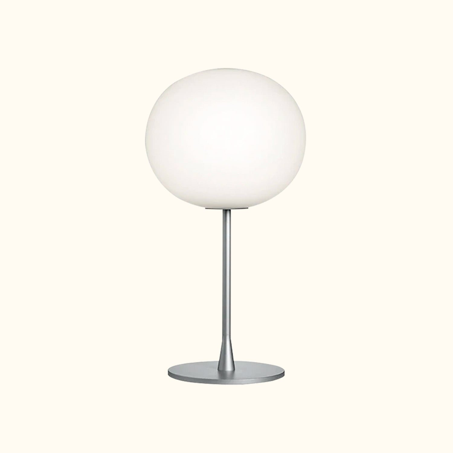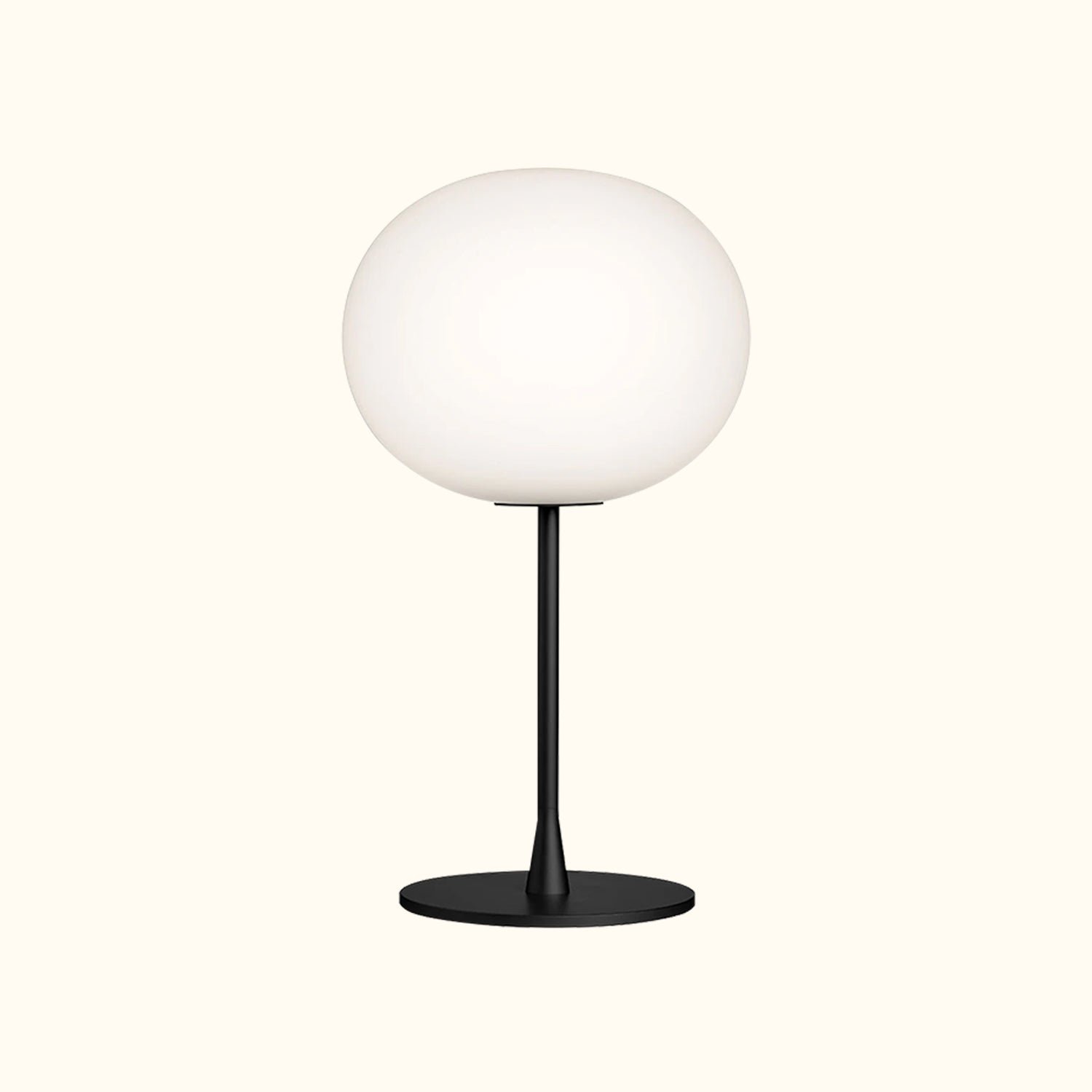 This table lamp is made of hand-blown opaline glass, providing diffused light, with a high-thickness steel base and stem painted in gray or black.