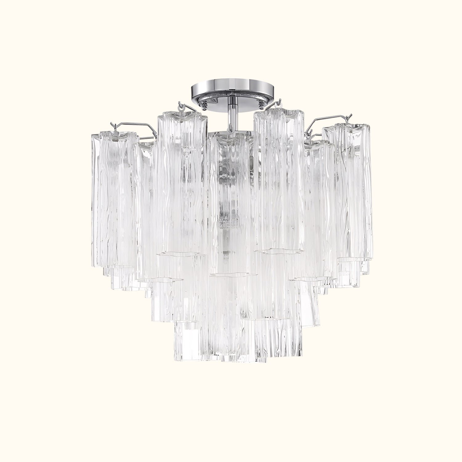 The charming lighting series is a modern interpretation of the iconic mid-century chandelier. Inspired by the fluid lines and geometric shapes of its predecessor, this series features a polished chrome or antique bronze metal frame that exudes sophistication and style. Its unique design showcases transparent textured glass tubes arranged in a captivating five-pointed star shape. A variety of glass colors are available, including clear, amber, smoke, and white, as well as stunning autumn options with a delightful mix of amber, clear, and smoke glass. The lighting series offers various sizes and finishes, allowing you to find the perfect match for your space while adding a touch of timeless elegance.