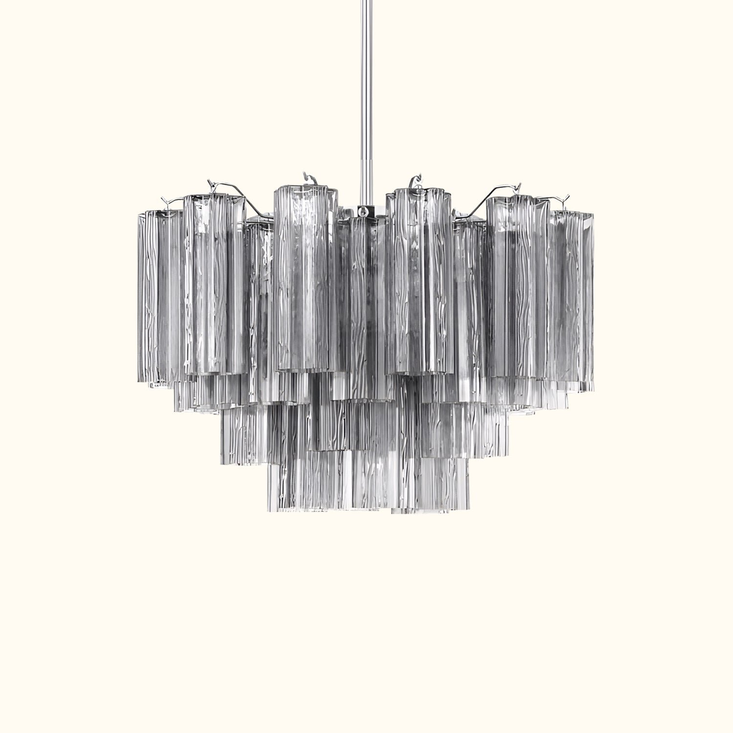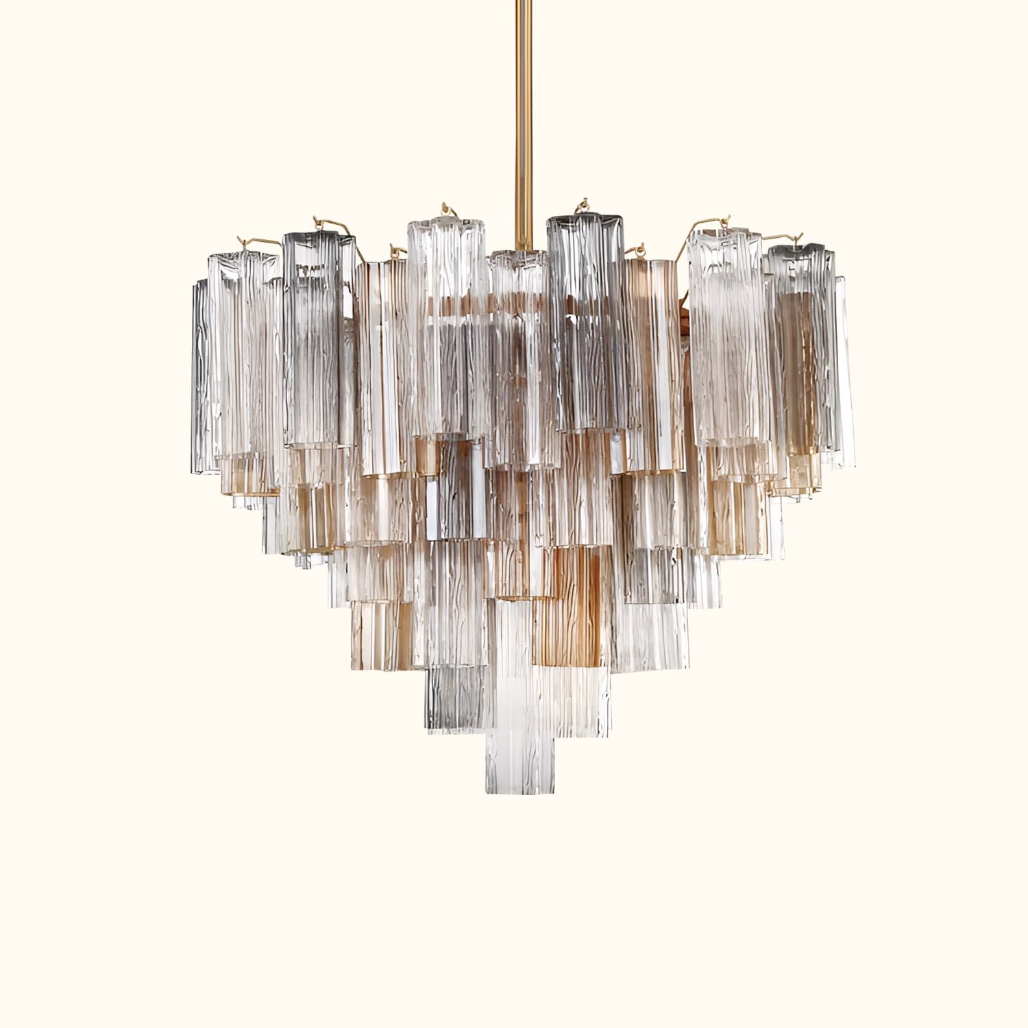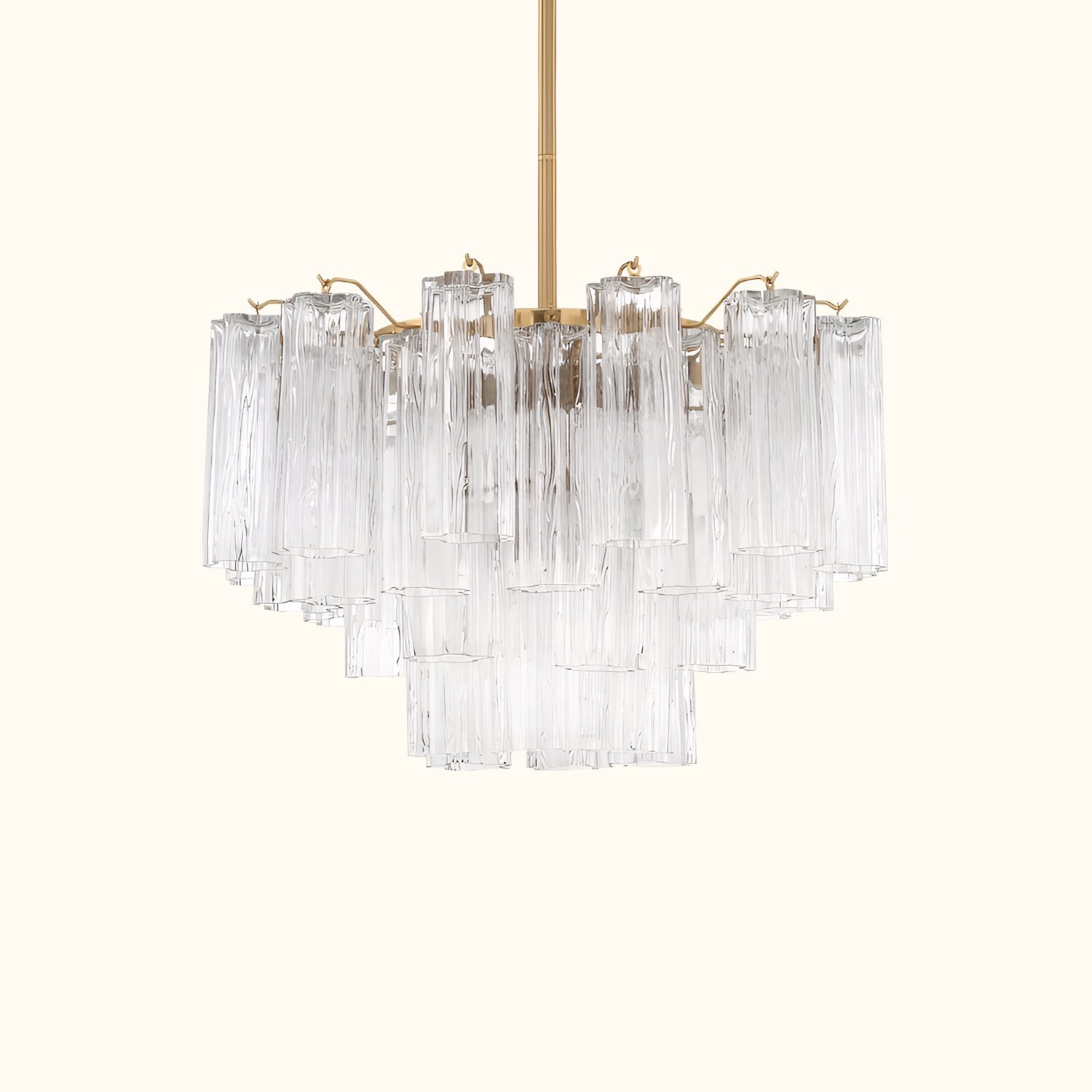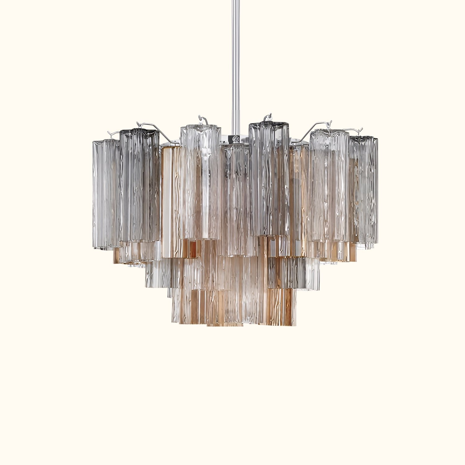 The captivating lighting collection is a modern interpretation of the iconic mid-century chandelier. Inspired by the smooth lines and geometric shapes of its predecessor, the design features a polished chrome or antique brass metal frame that exudes sophistication and style. The unique design showcases transparent textured glass tubes arranged in a mesmerizing five-point star shape. There are various glass color options available, including clear, amber, smoke, and white, as well as a stunning autumn option featuring a multi-colored configuration of amber, clear, and smoke glass. The collection is available in a range of sizes and finishes, allowing you to find the perfect fit for your space while adding a touch of timeless elegance.