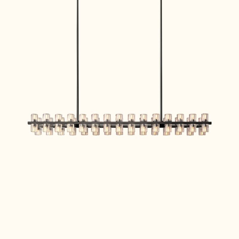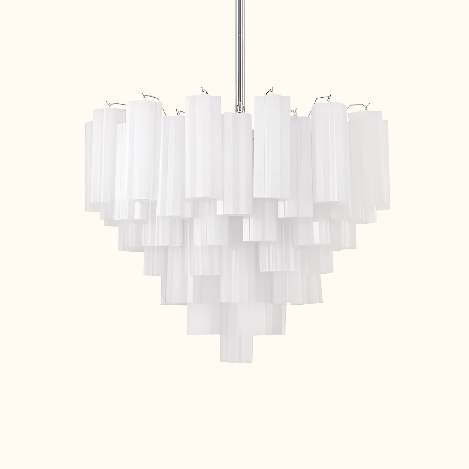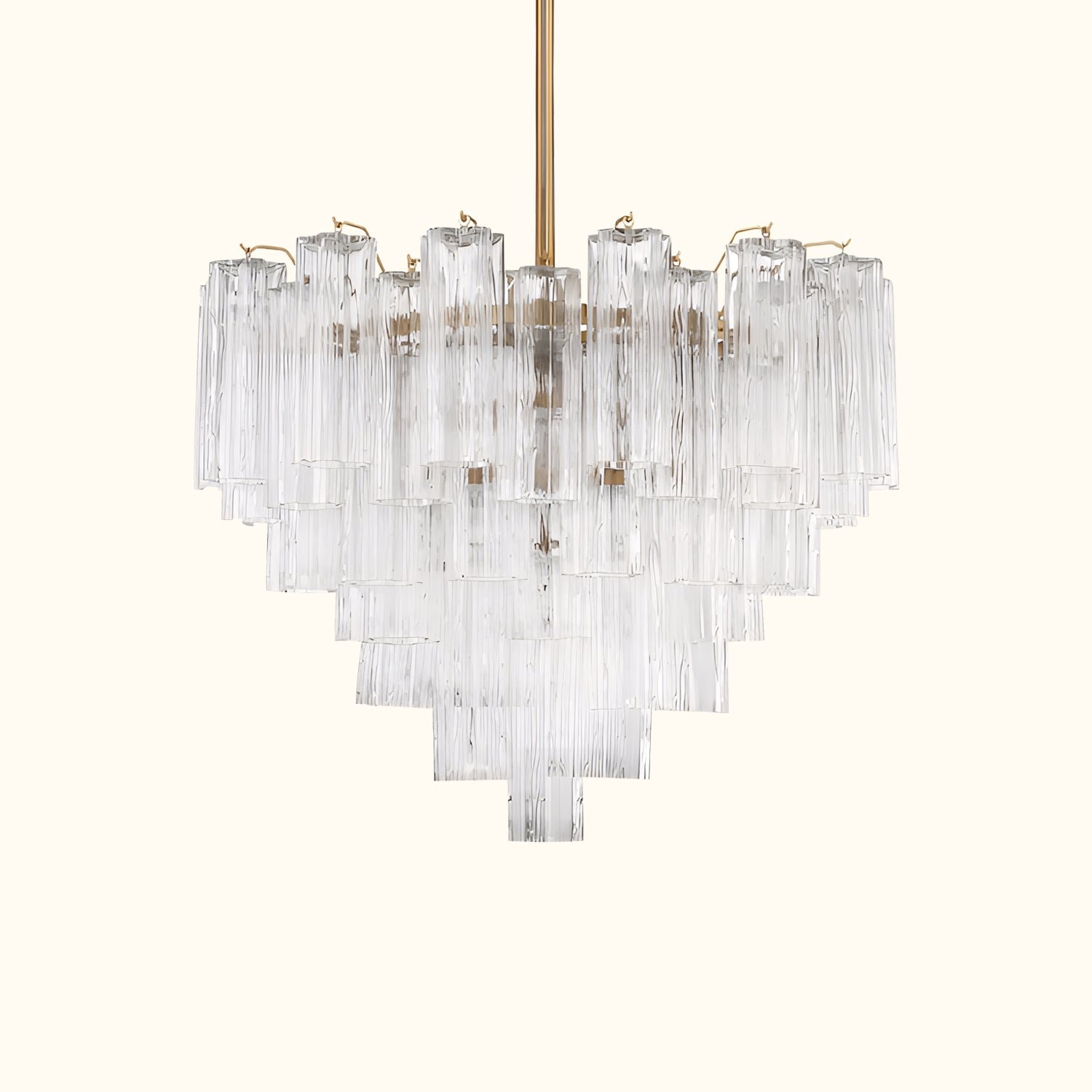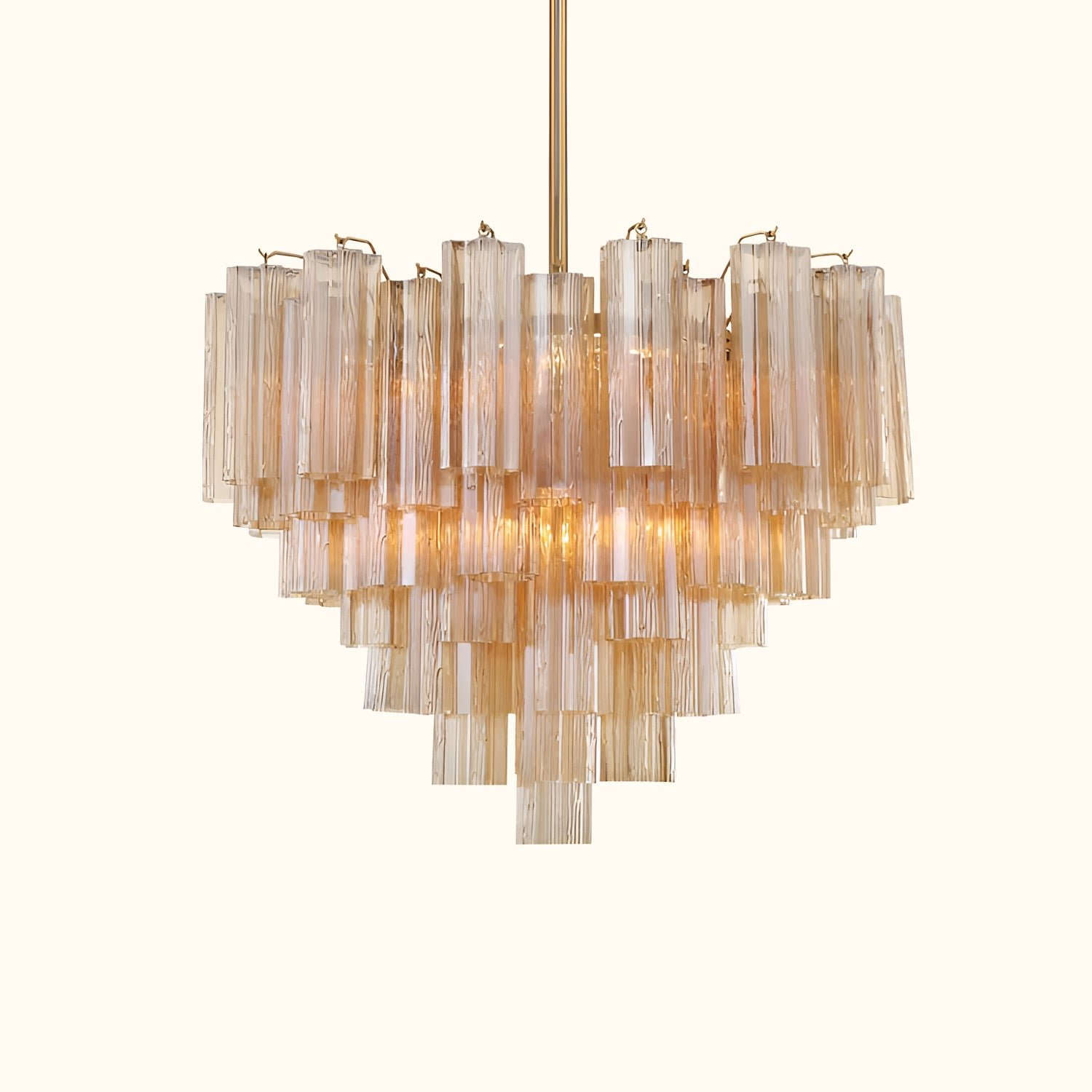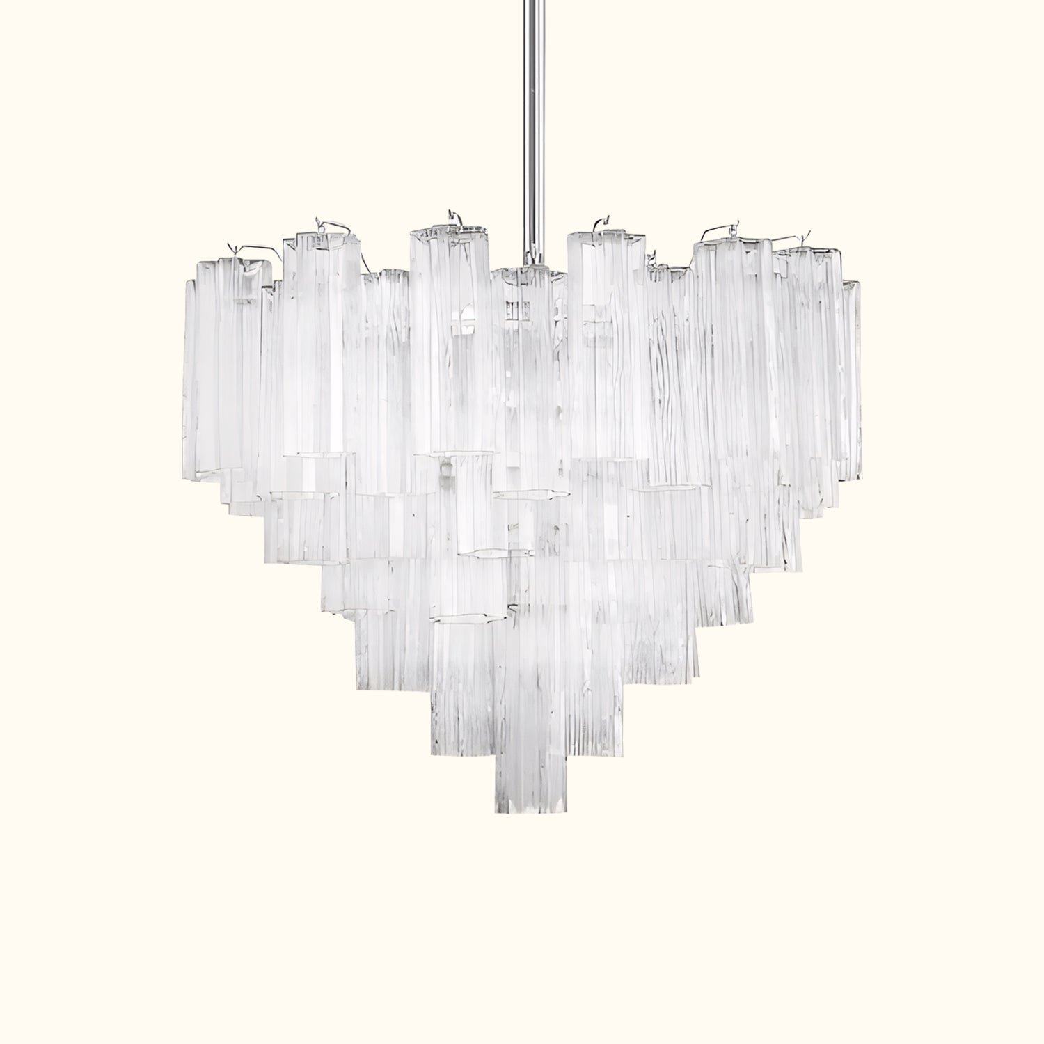 The captivating lighting collection is a modern interpretation of the iconic mid-century chandelier. Inspired by the smooth lines and geometric shapes of its predecessor, the design features a polished chrome or antique brass metal frame that exudes sophistication and style. The unique design showcases transparent textured glass tubes arranged in a mesmerizing five-point star shape. There are various glass color options available, including clear, amber, smoke, and white, as well as a stunning autumn option featuring a multi-colored configuration of amber, clear, and smoke glass. The collection is available in a range of sizes and finishes, allowing you to find the perfect fit for your space while adding a touch of timeless elegance.