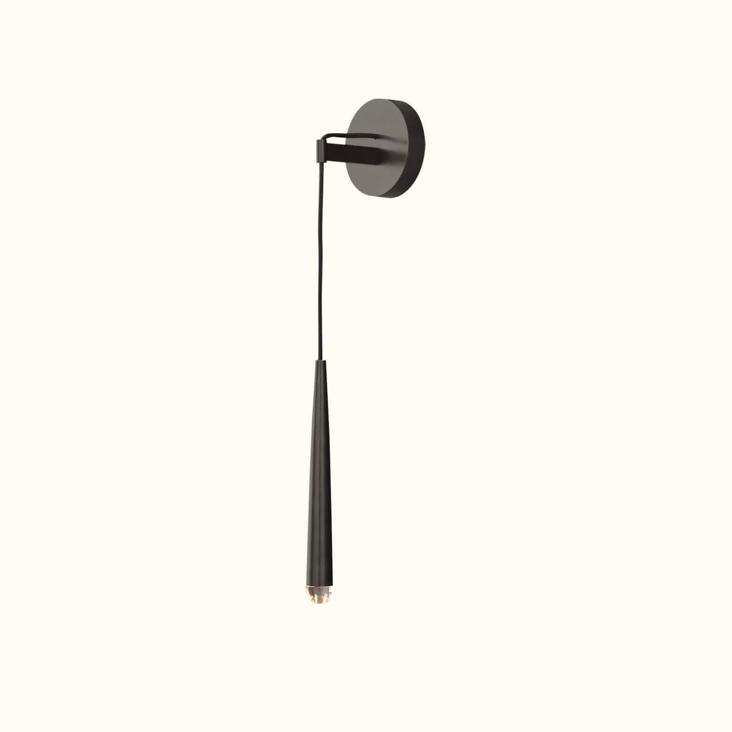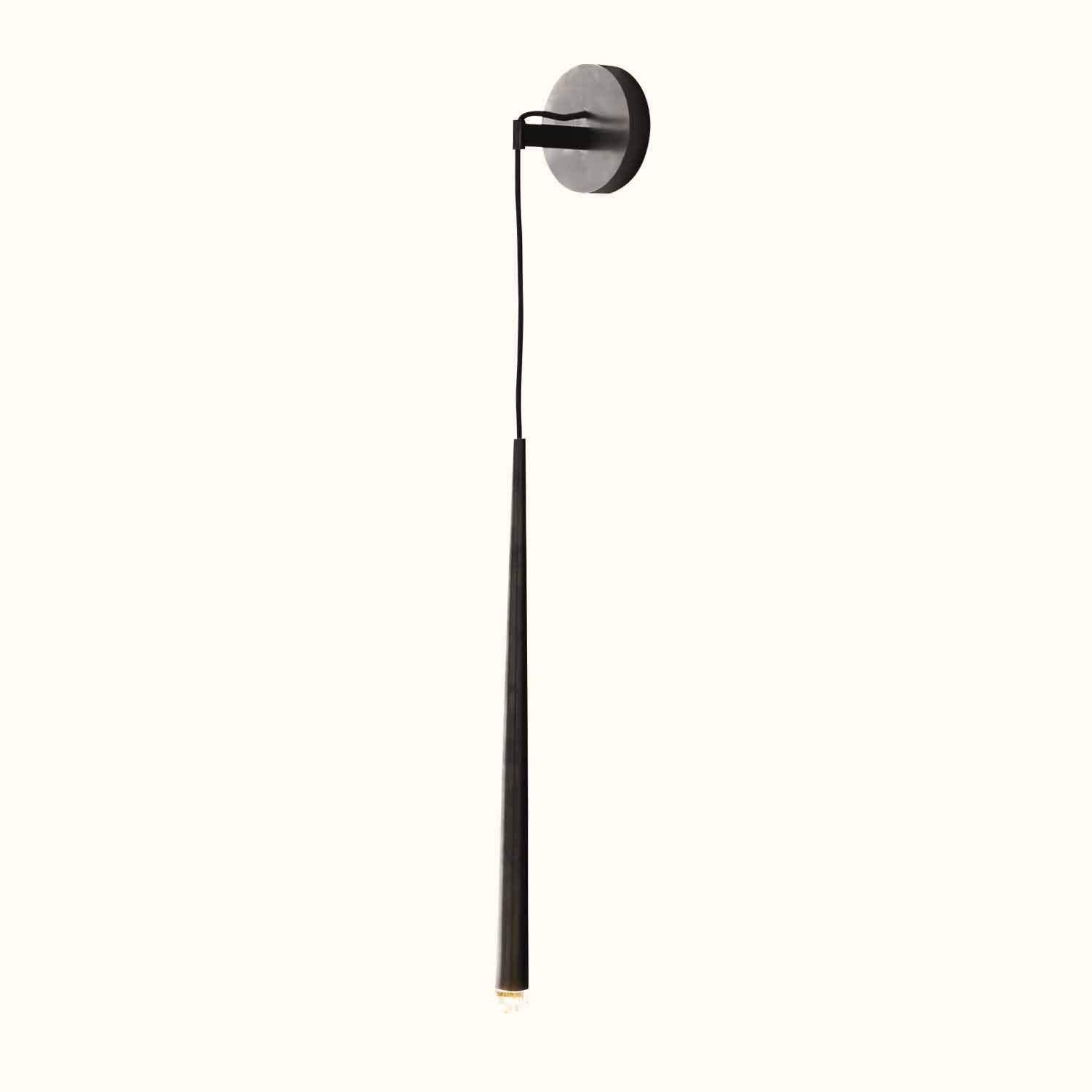 Inspired by French minimalist lighting of the 1960s, lighting designer elegant design features a solid brass form suspended from a slender black cord. An inset LED at the tip offers warm, glowing light.