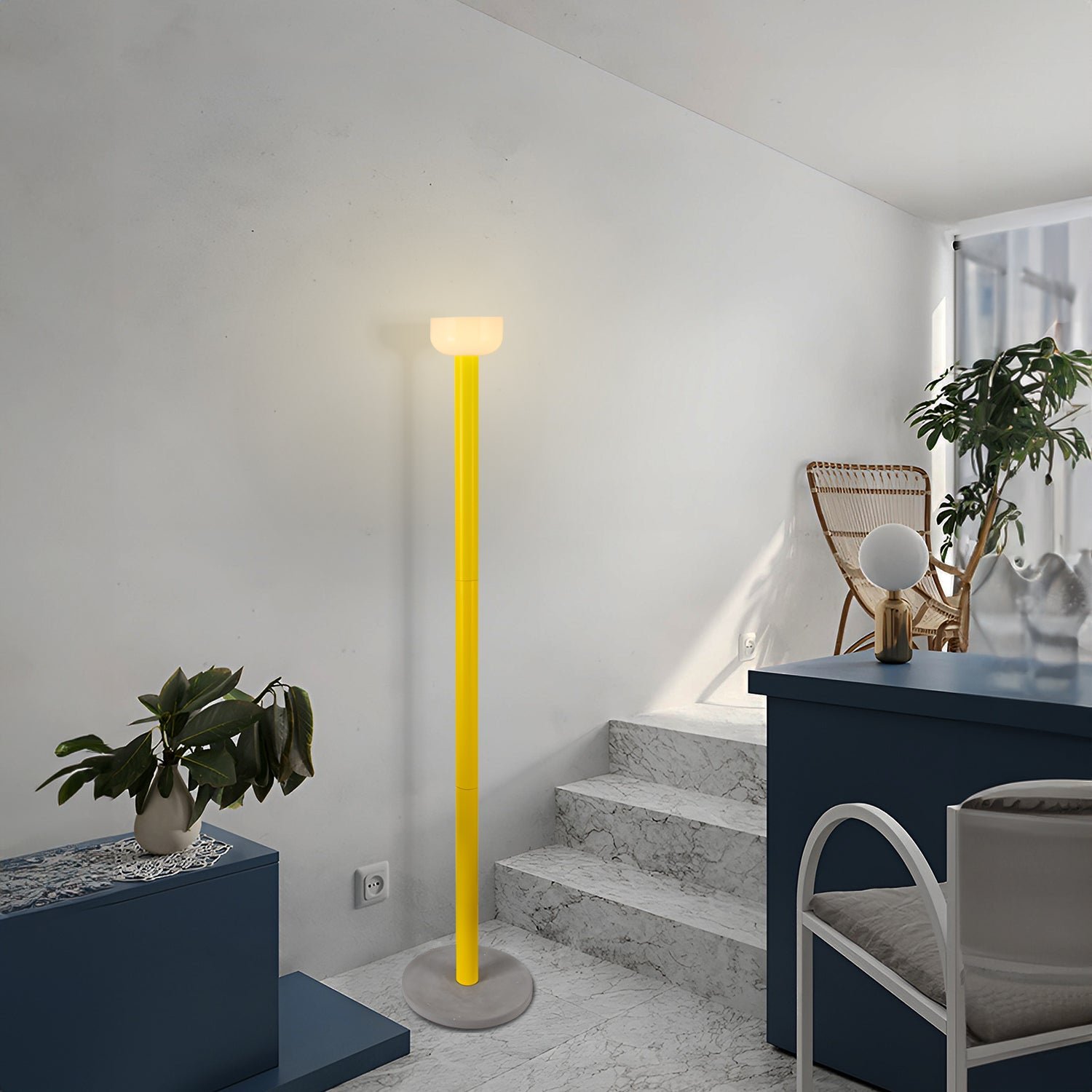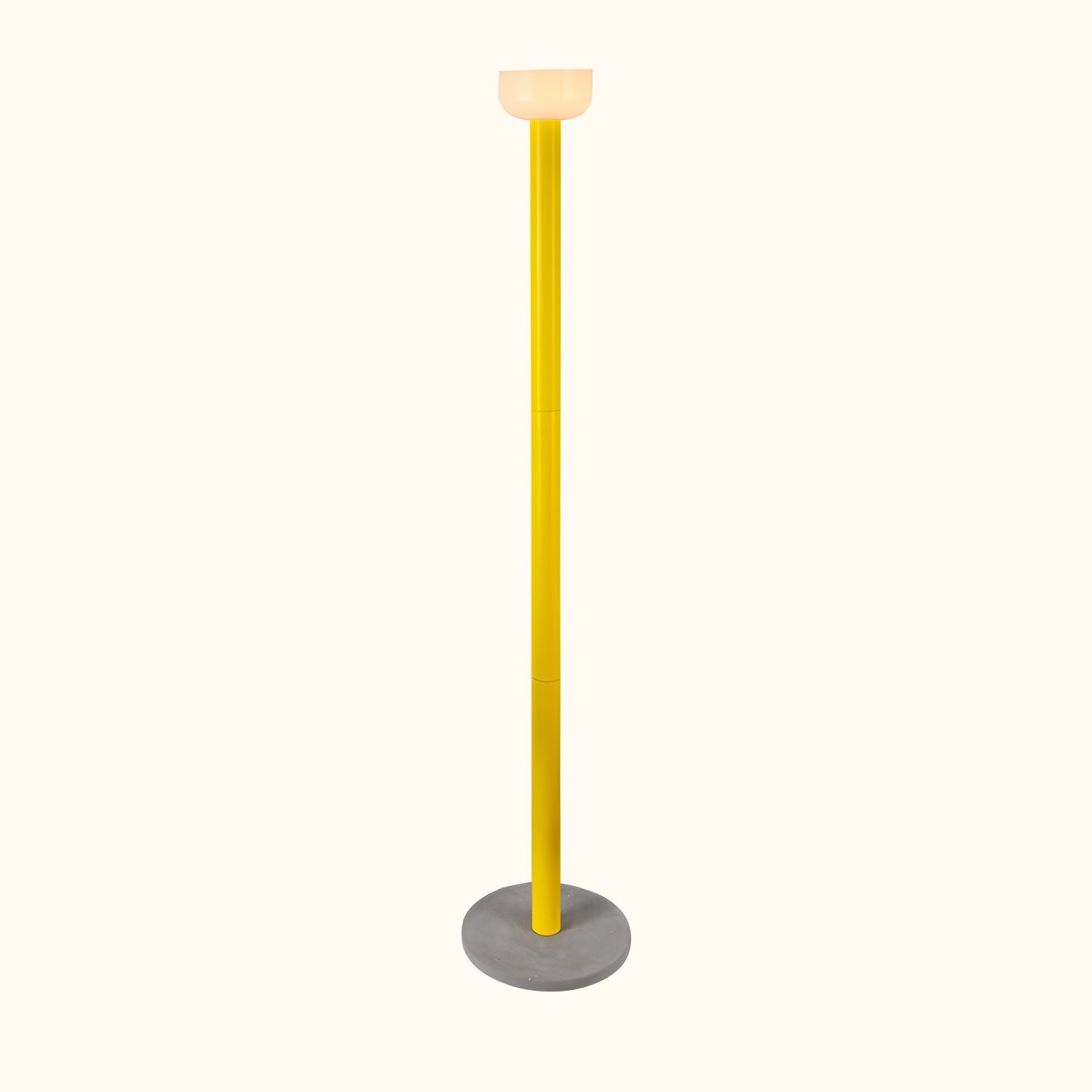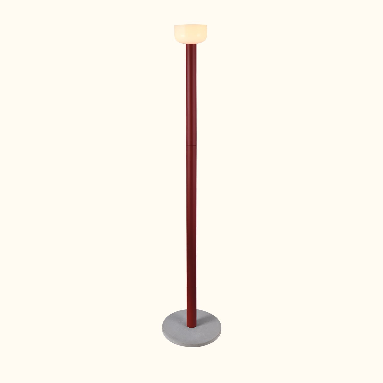 The Bellhop collection introduces an innovative up-lit floor lamp. Inspired by the Bellhop design, this lamp inverts the arched diffuser. The Bellhop Floor is made from painted glass, aluminum, and an eco-friendly concrete base, available in various finishes. We envisioned a floor version that retains the essence of the collection while offering a distinctly different quality of light. Unlike the typically discreet table lamps that provide direct lighting, the new Bellhop Floor lamp has a more sculptural presence.