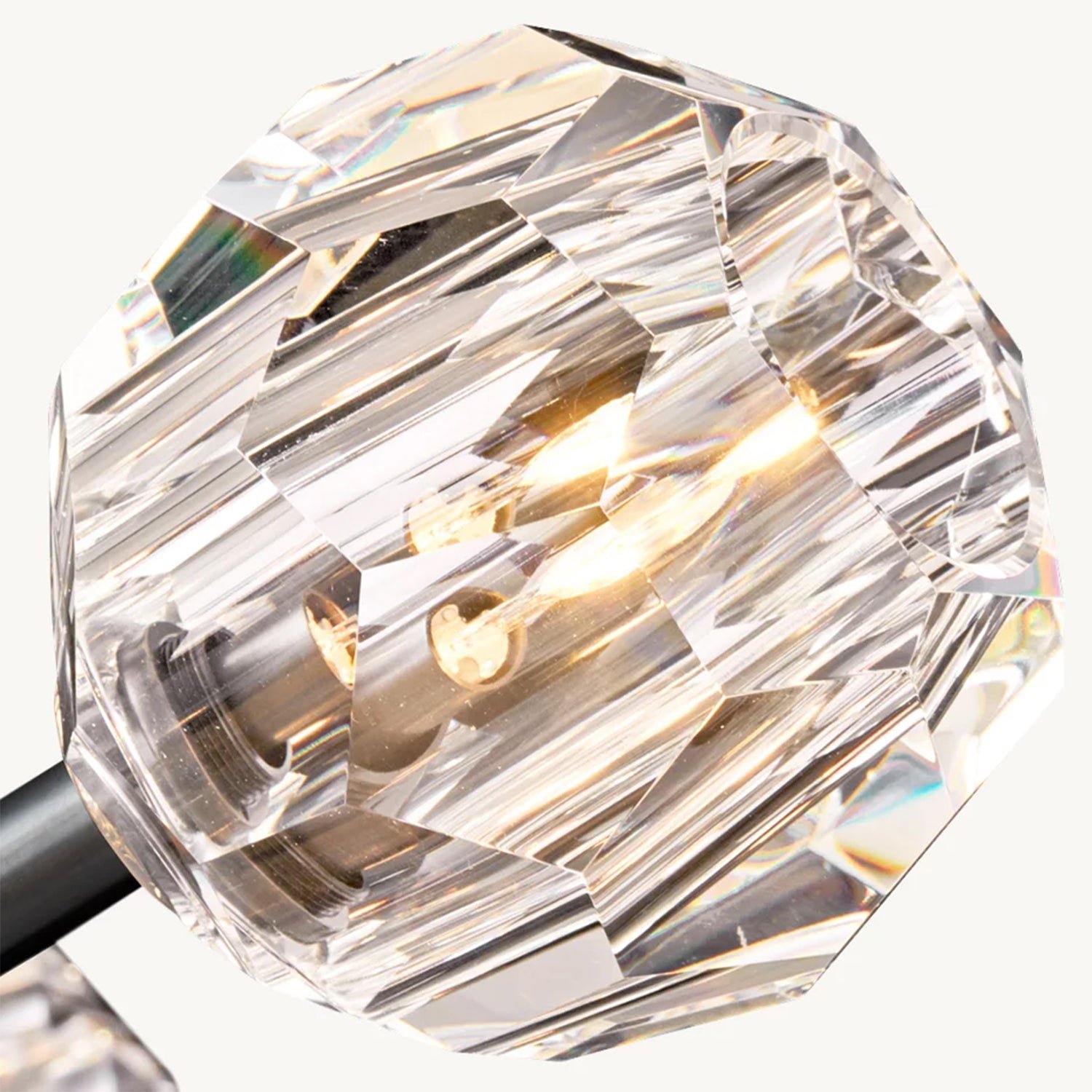 Crafted of solid brass and crystal glass, lighting designer sculptural fixture reflects his passion for luxurious materials and superior craftsmanship. Each finely faceted sphere is hand-ground and polished to reflect and refract the light, evoking the minimalist spirit of 1960s design.