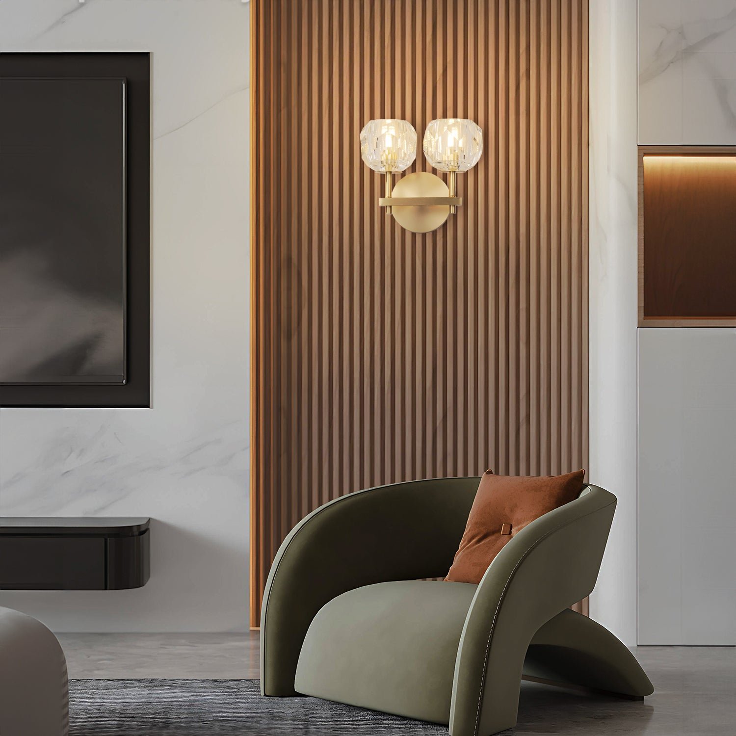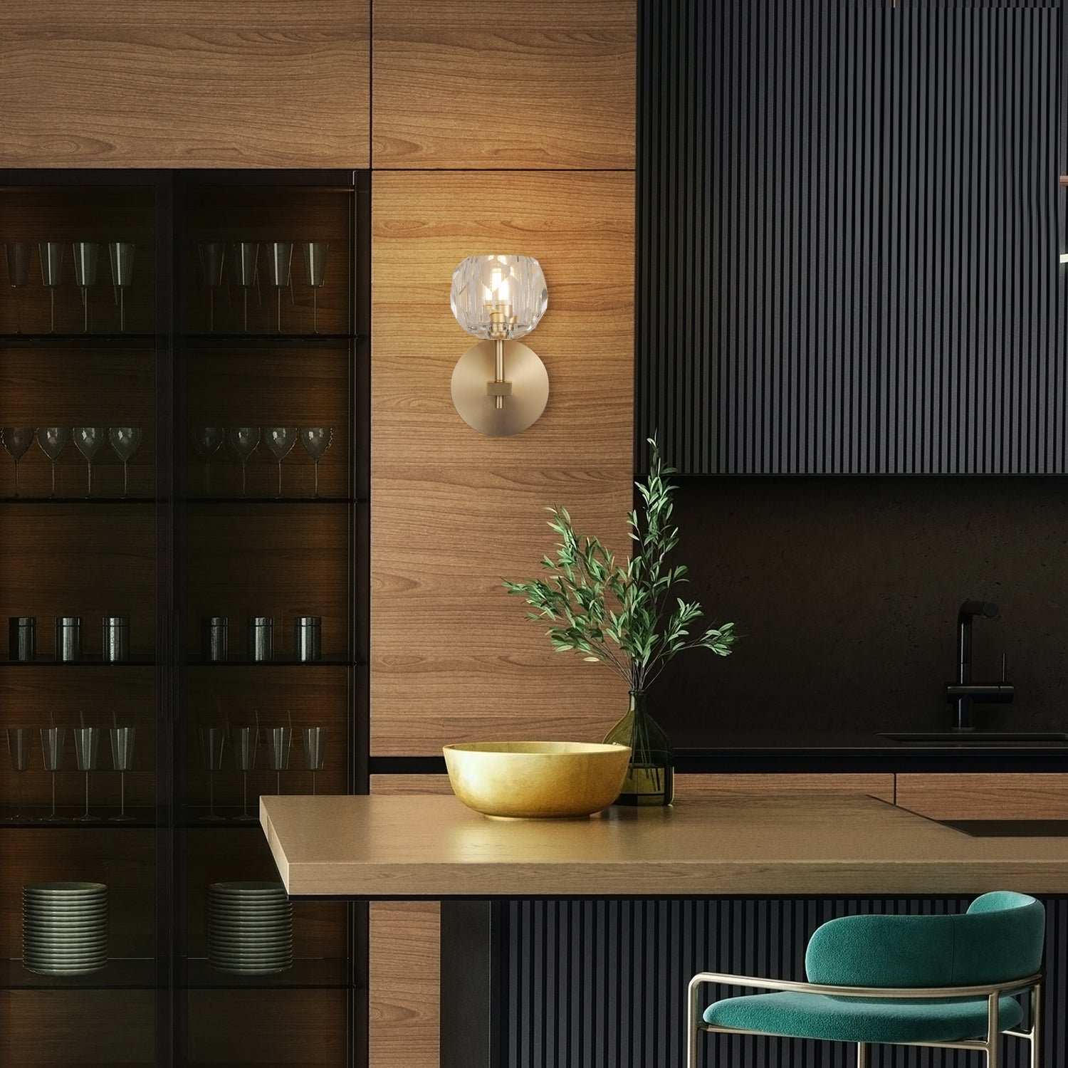 Designer Jonathan Browning’s sculptural fixture, crafted from solid brass and crystal glass, exemplifies his dedication to luxurious materials and exceptional craftsmanship. Inspired by the minimalist ethos of 1960s design, each finely faceted sphere is hand-ground and polished to beautifully reflect and refract light.