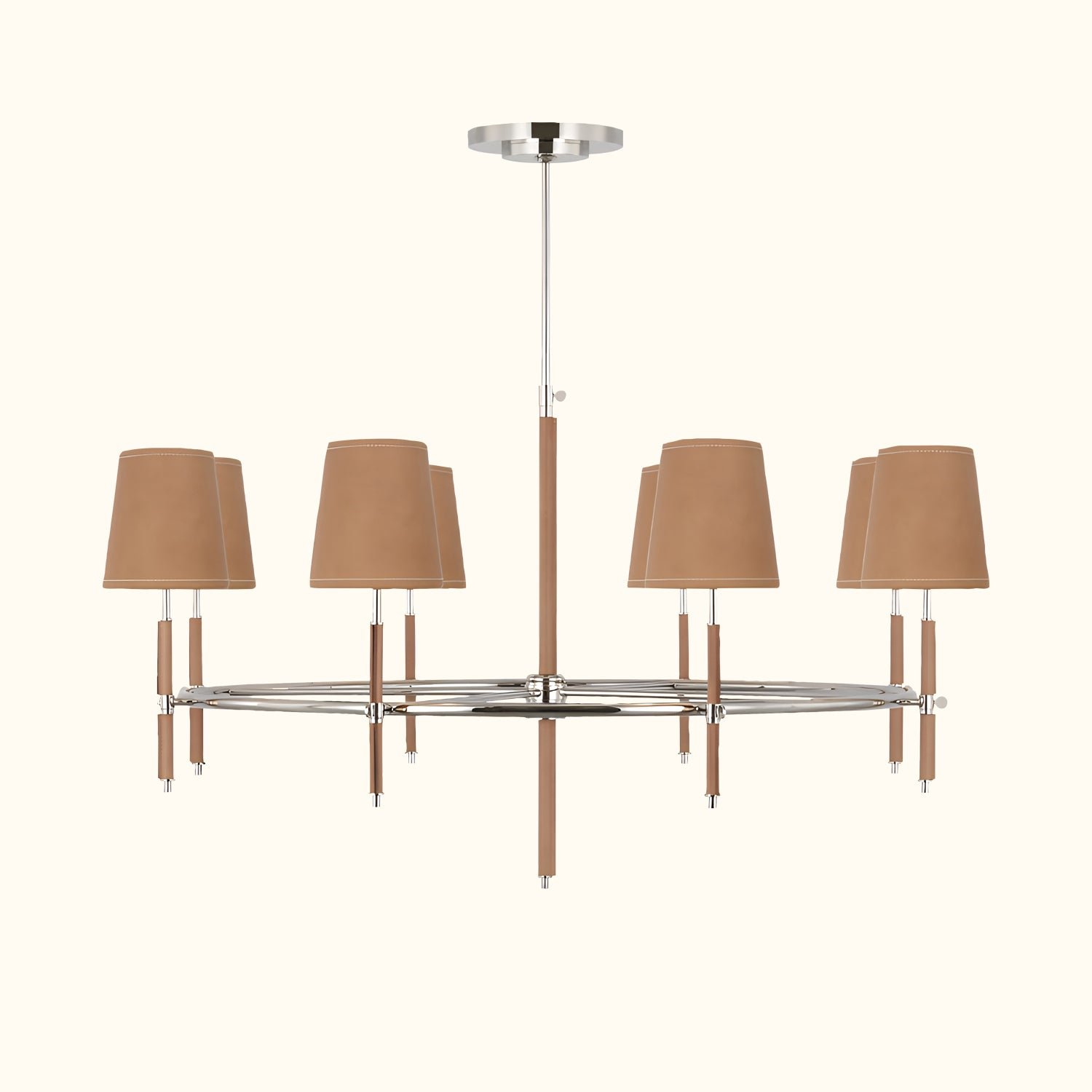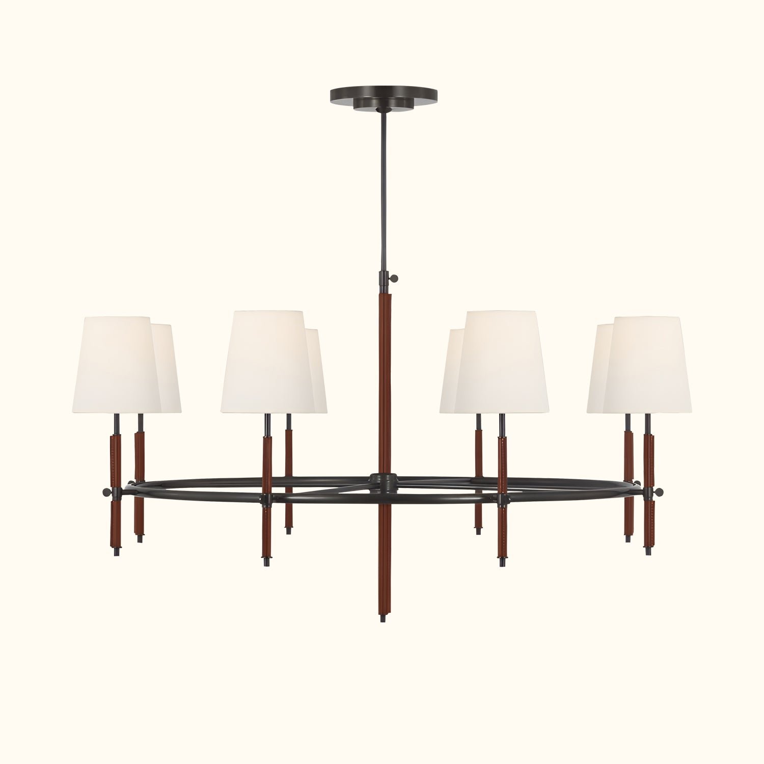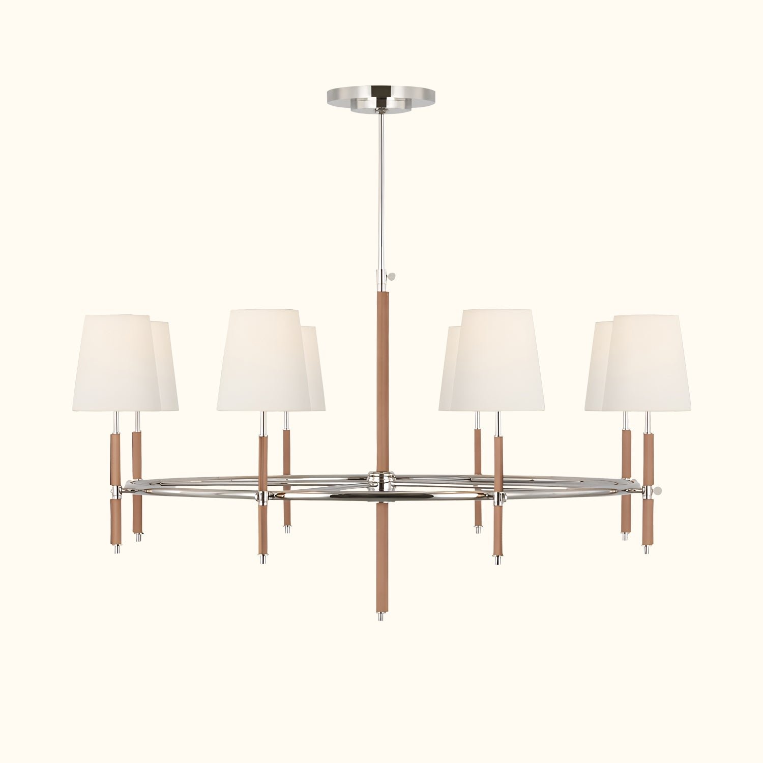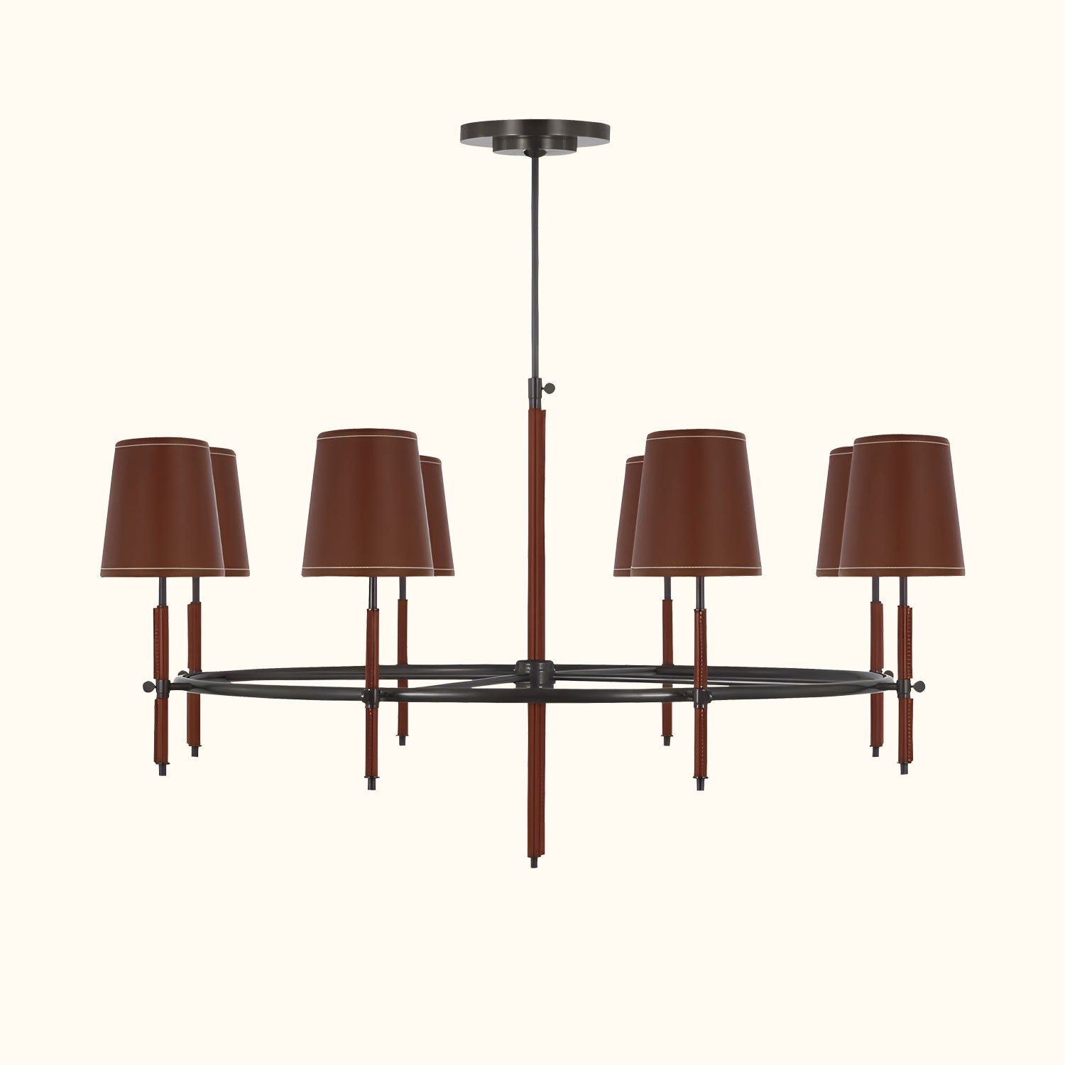 The wrapped ring chandelier features a design that perfectly blends refinement and modernity, creating a captivating centerpiece for your space. Its unique design showcases a circular silhouette, encasing a row of vertical rods meticulously wrapped in high-quality leather, forming a visually engaging composition. The tapered linen drum shade elegantly diffuses light, casting a soft, warm glow that enhances the room’s ambiance.