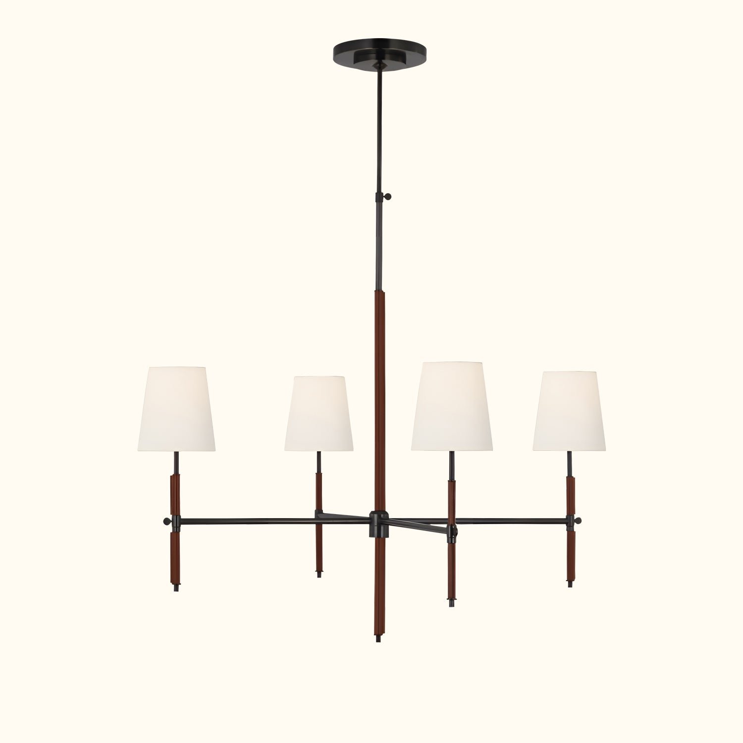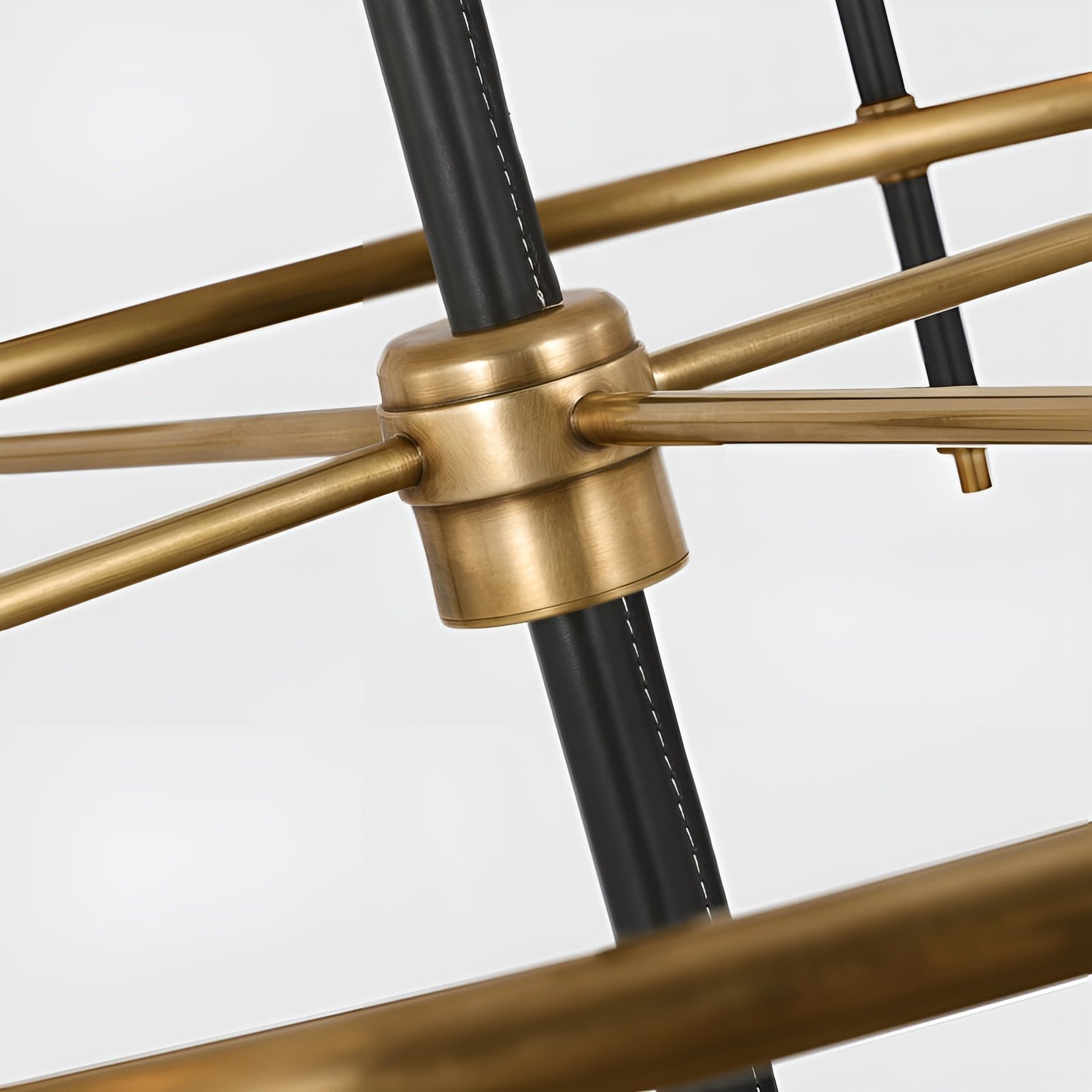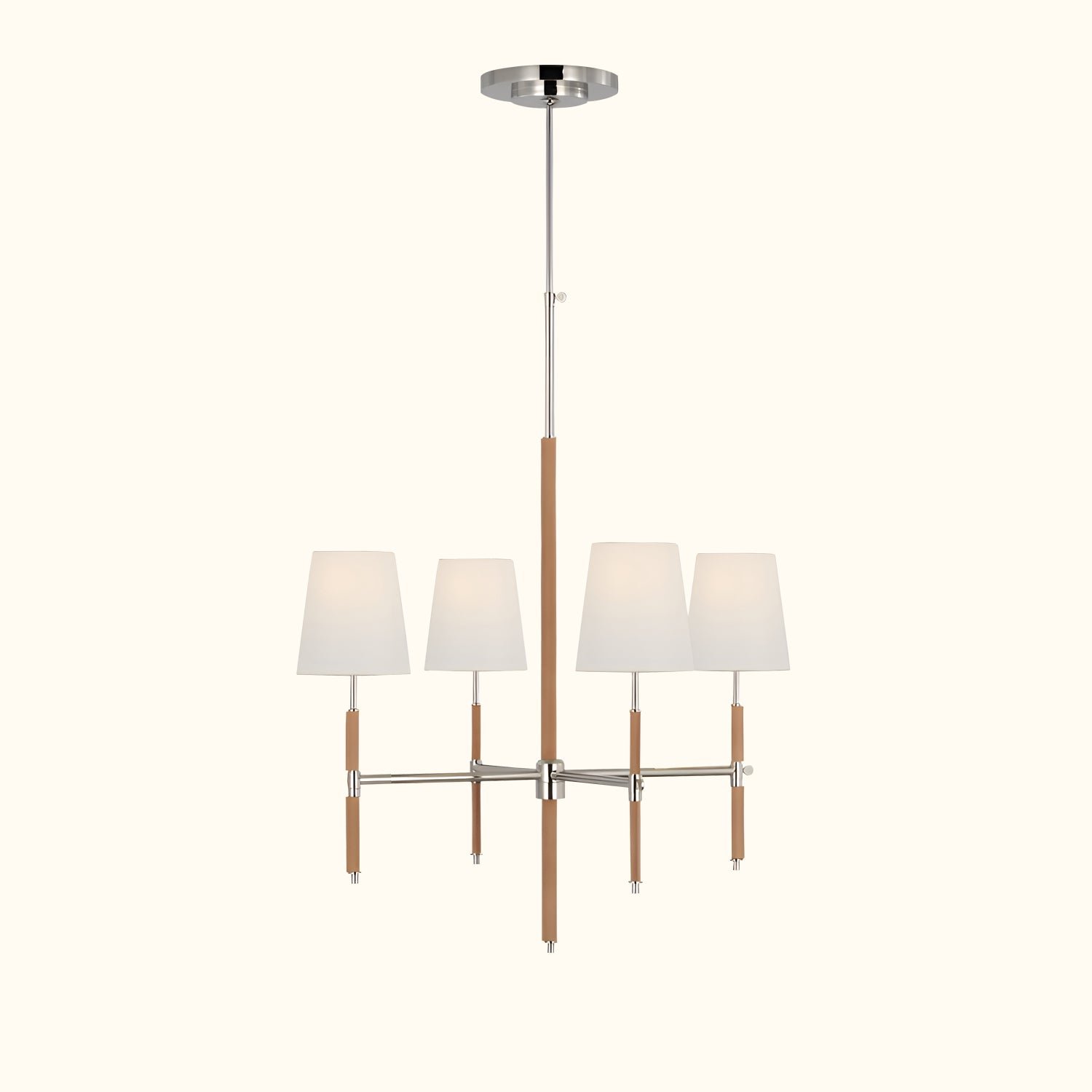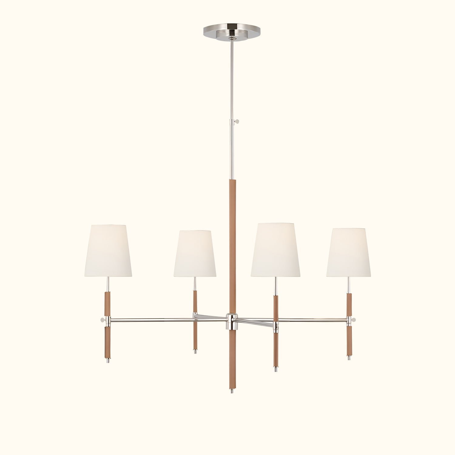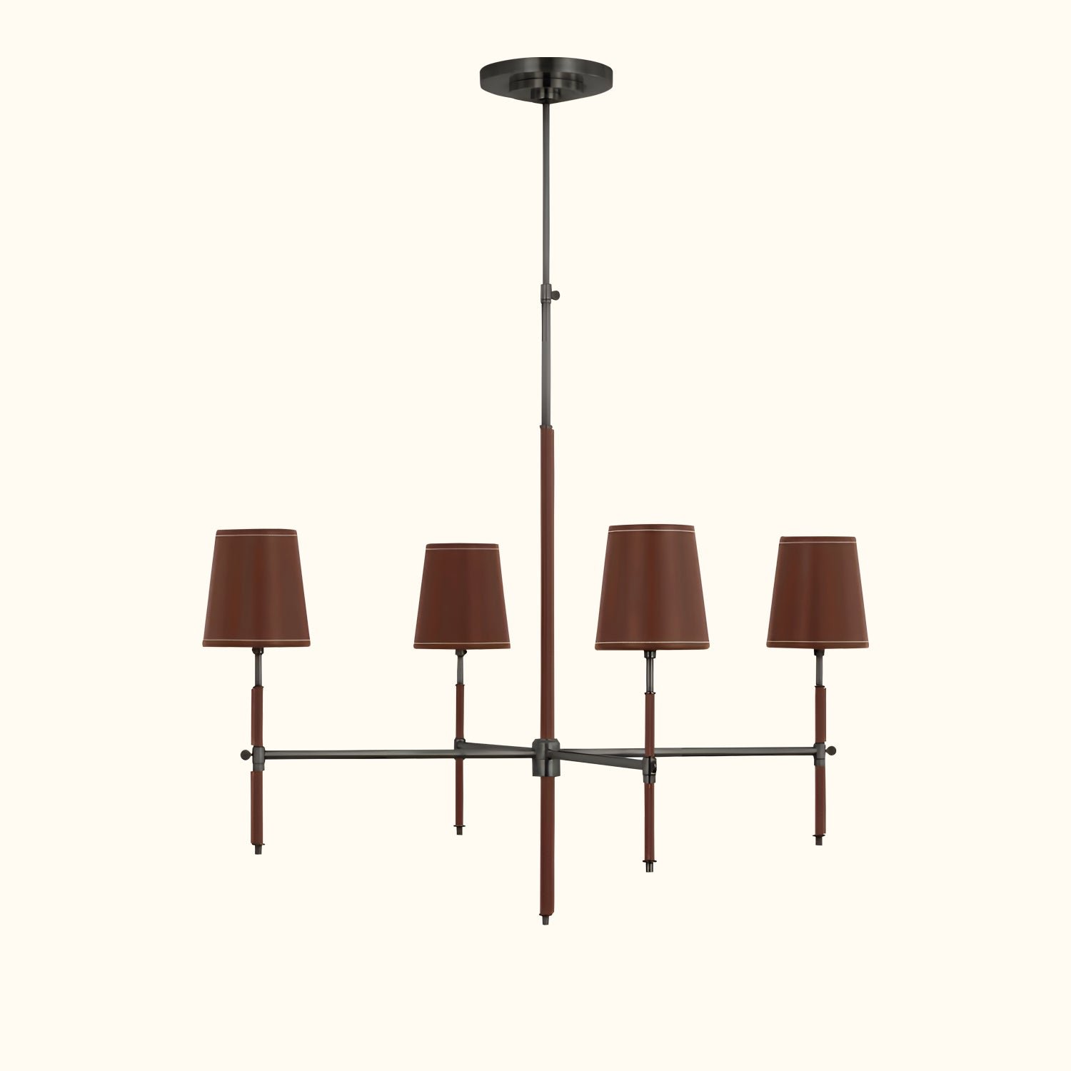 The wrapped ring chandelier features a design that perfectly blends refinement and modernity, creating a captivating centerpiece for your space. Its unique design showcases a circular silhouette, encasing a row of vertical rods meticulously wrapped in high-quality leather, forming a visually engaging composition. The tapered linen drum shade elegantly diffuses light, casting a soft, warm glow that enhances the room’s ambiance.