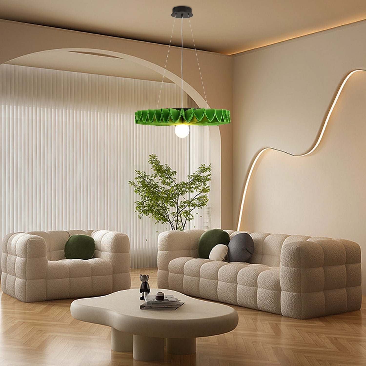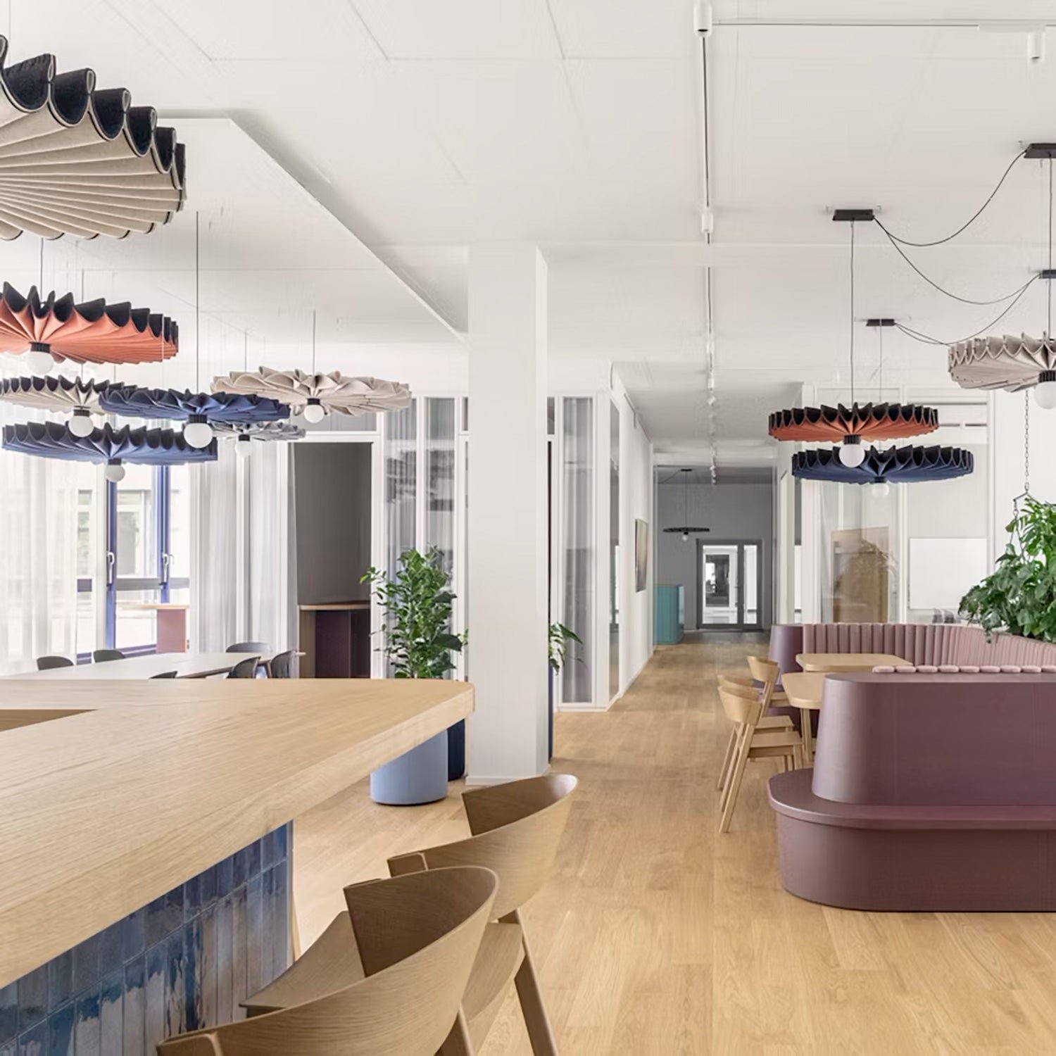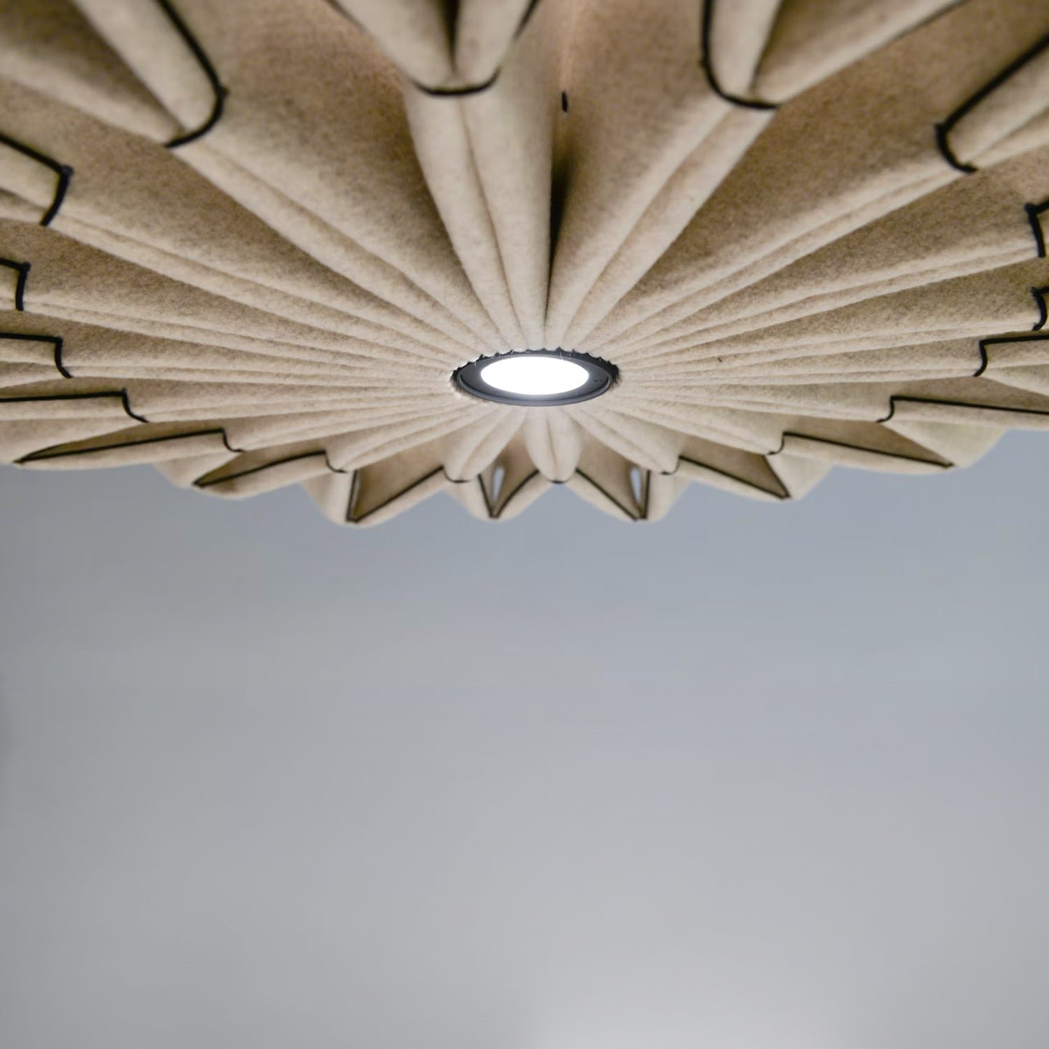 The BuzziPleat Light boasts a sculptural design that excels in both innovative aesthetics and exceptional sound absorption. Featuring an integrated LED lighting element, this acoustic solution seamlessly combines decorative illumination with effective sound control.The architectural folds of the BuzziPleat Light maximize surface area, ensuring superior acoustic performance. Its large folds capture mid and low tones, preventing sound waves from reflecting between hard surfaces. By combining multiple BuzziPleat Lights at varying suspension heights, you can effectively reduce sound in spaces with high ceilings.