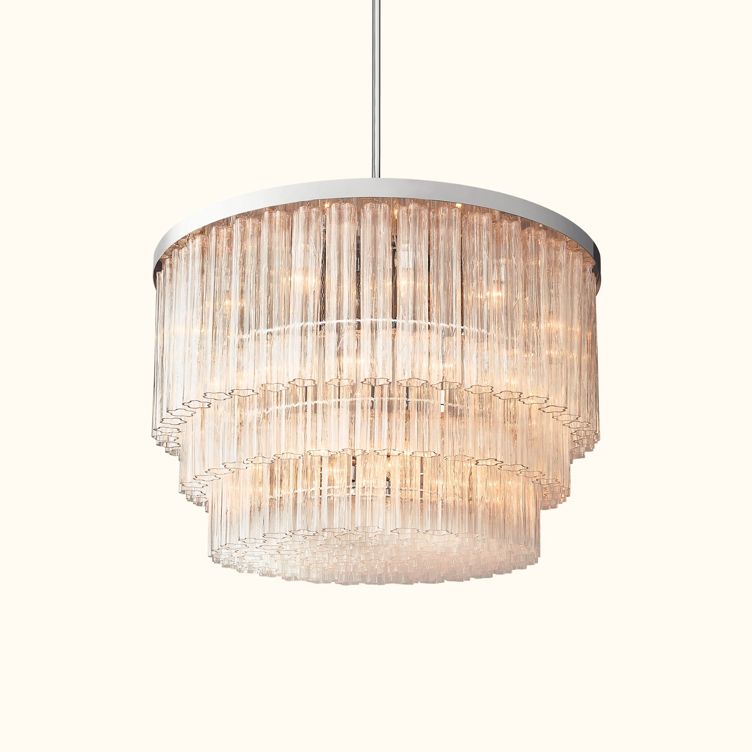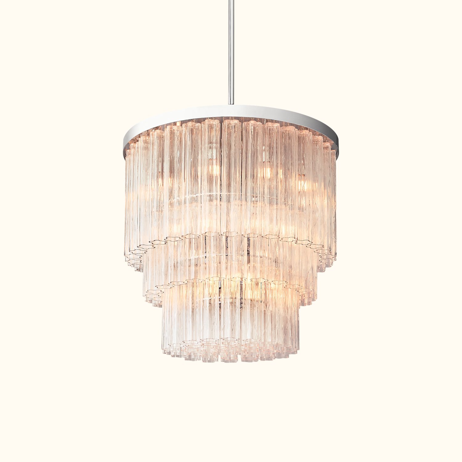 Inspired by 1960s Venetian glass chandeliers from Murano, Italy, this collection creates a stunning effect reminiscent of liquid ice glistening with light. Cascading tiers of glass are composed of fluted cylindrical pendants, each mouth-blown with a fluid linear texture and a loosely drawn blossom shape. Viewed from below, the clusters of curving forms create a sparkling interplay of patterns.
