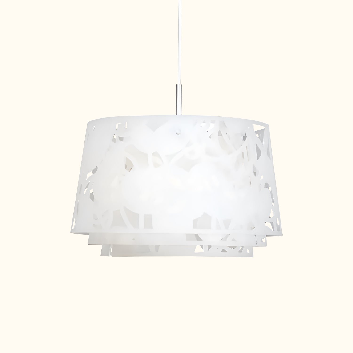 The Collage pendant light is a set of nested lights featuring three laser-cut acrylic shades. These shades are carefully arranged and interlaced to minimize any potential glare. The intricate patterns on each shade are intentionally different, casting surrounding surfaces in a bath of intersecting light and shadow. The fixture follows Scandinavian design traditions and the collage uses natural aluminum.