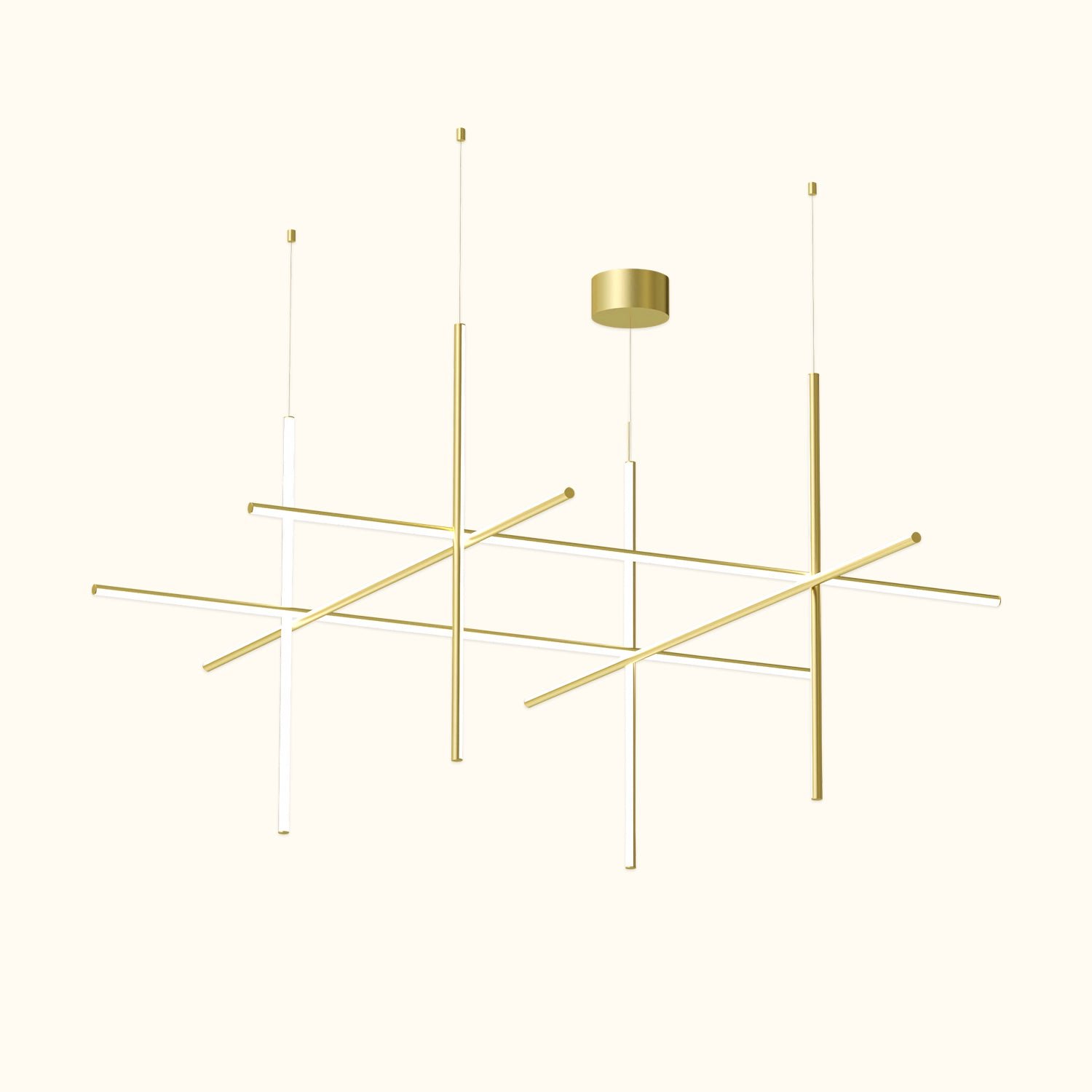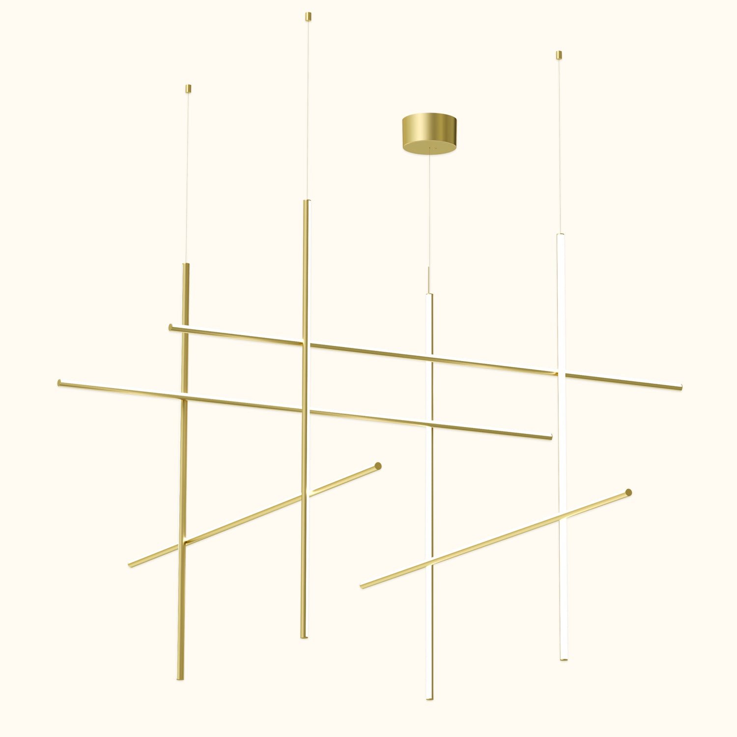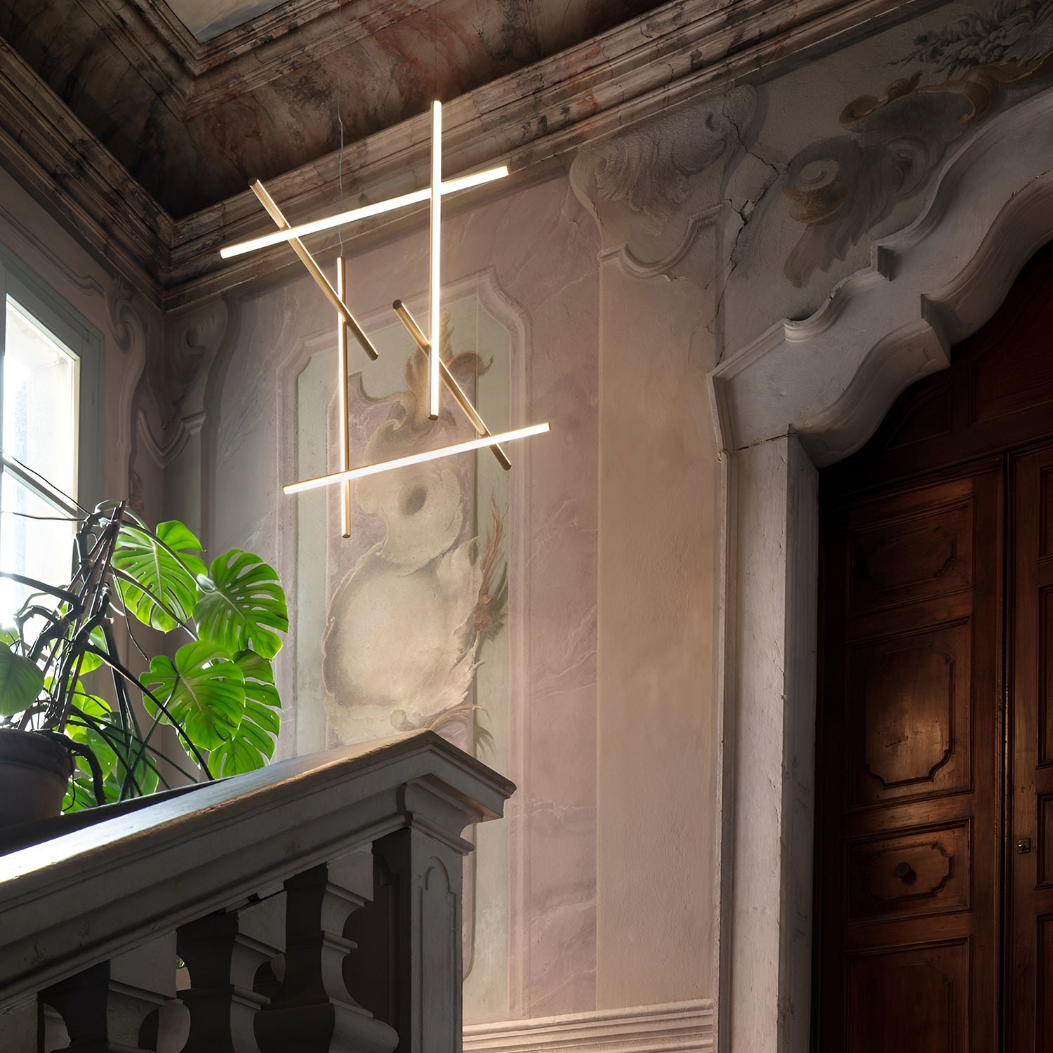 The Coordinates chandelier is a sleek lighting grid bar lamp, featuring a sculptural design suspended from concealed cables to achieve a floating effect. Each element is made from extruded anodized aluminum and is equipped with integrated LED light strips and platinum optical silicone diffusers. The hanging height is adjustable. Installing this striking piece in modern residential and commercial spaces can create a dramatic effect.