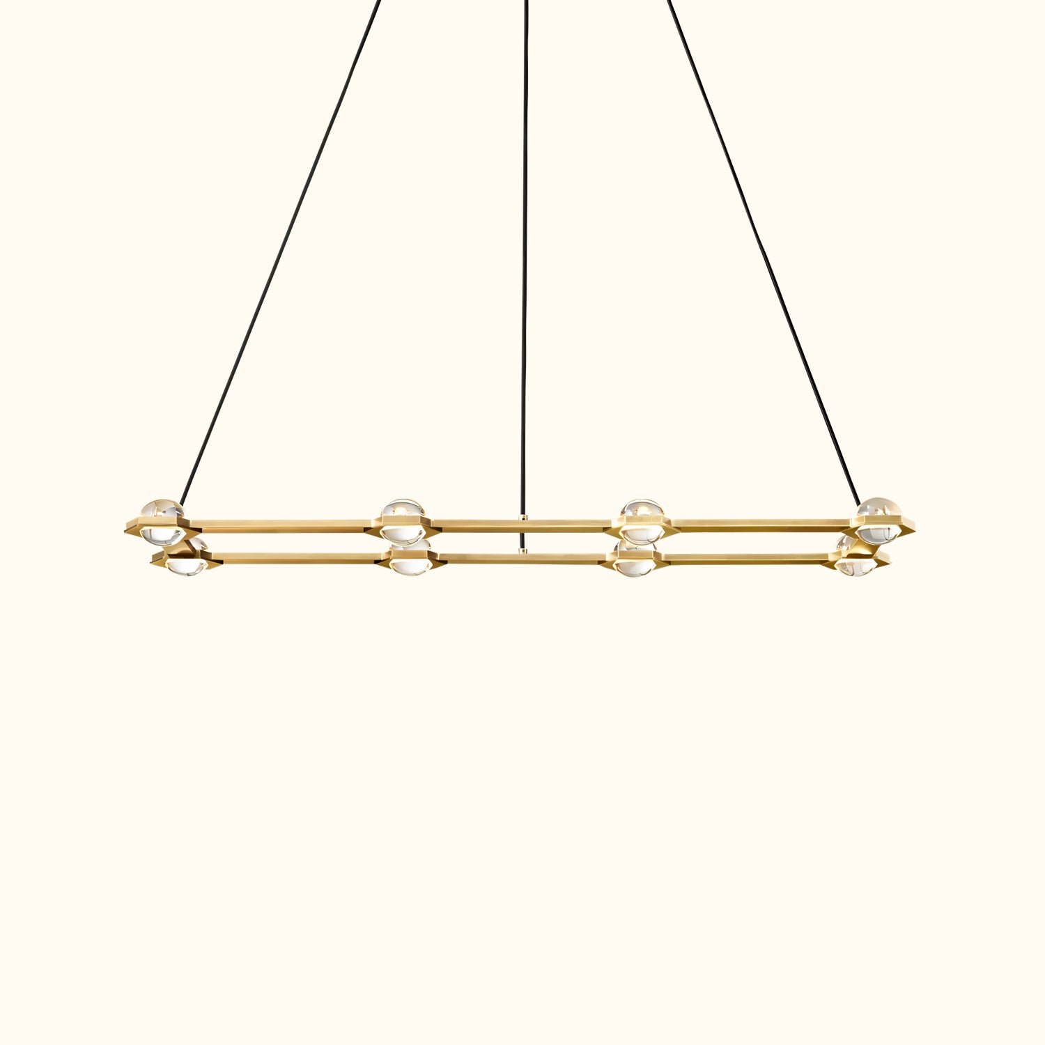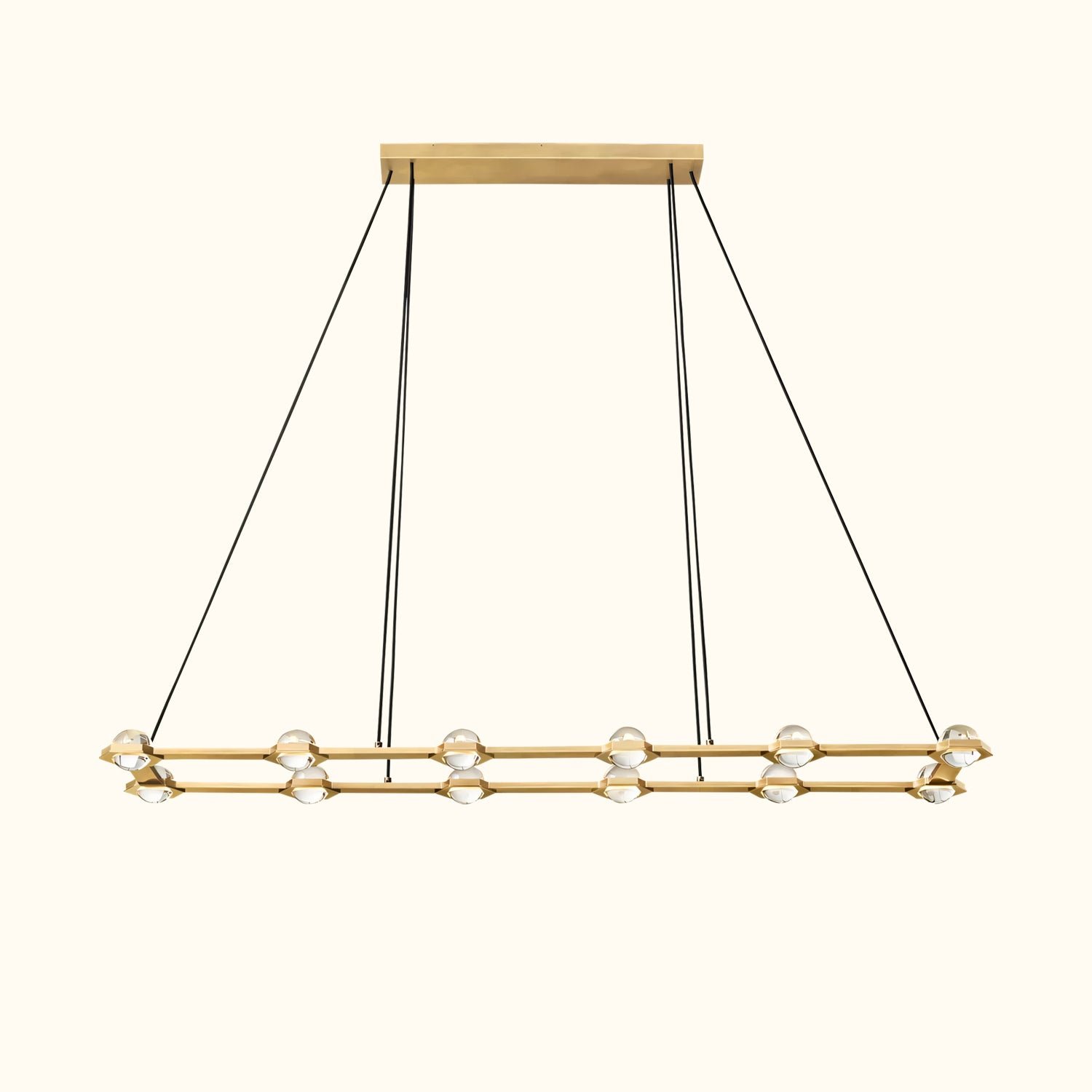 Minimalist and elemental, the Éclatant collection features illuminated crystal orbs suspended in hexagonal fittings within a flat rectangular frame. The design was inspired by plans for a cenotaph drawn by an 18th-century architect, offering a visionary tribute to physics reinterpreted in a stunning contemporary form.
