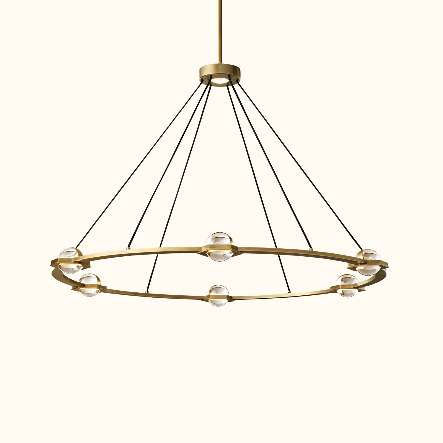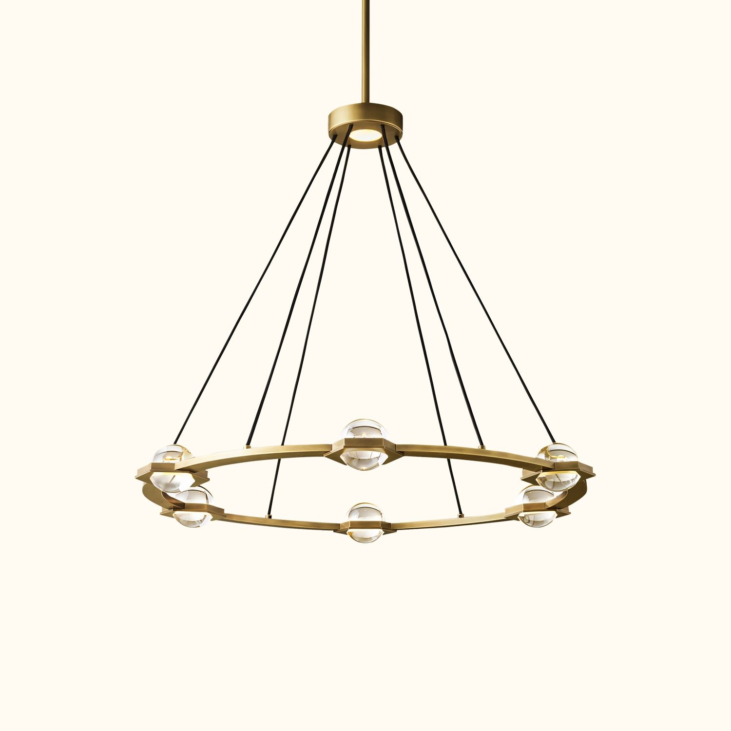 The Éclatant collection is spare and elemental, featuring illuminated crystal orbs suspended within hexagonal fittings, set in a flat metal frame. The design is inspired by 18th-century architectural drawings for a cenotaph—a tribute to physics that has been remarkably reinterpreted in a contemporary form.