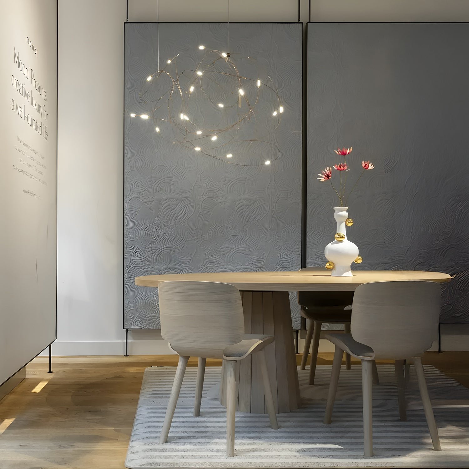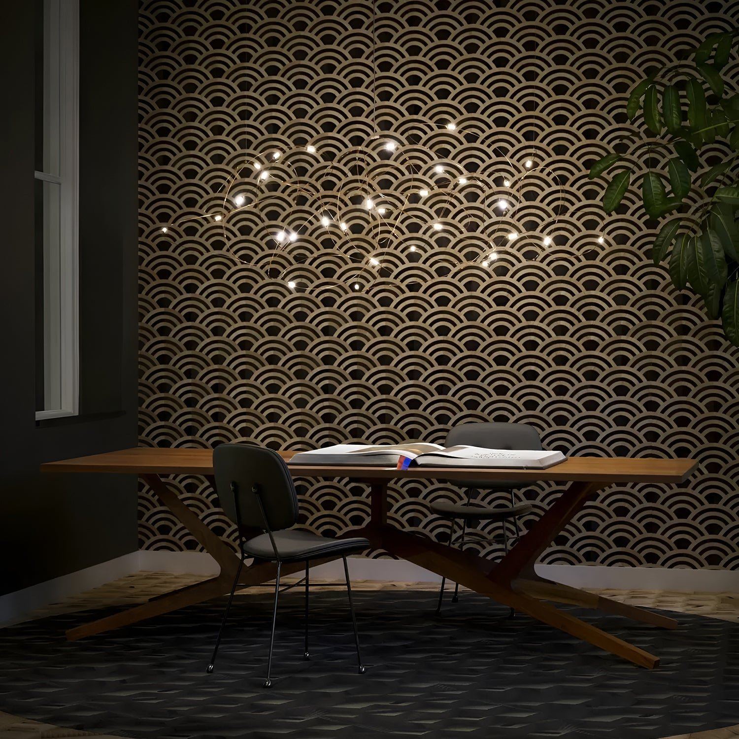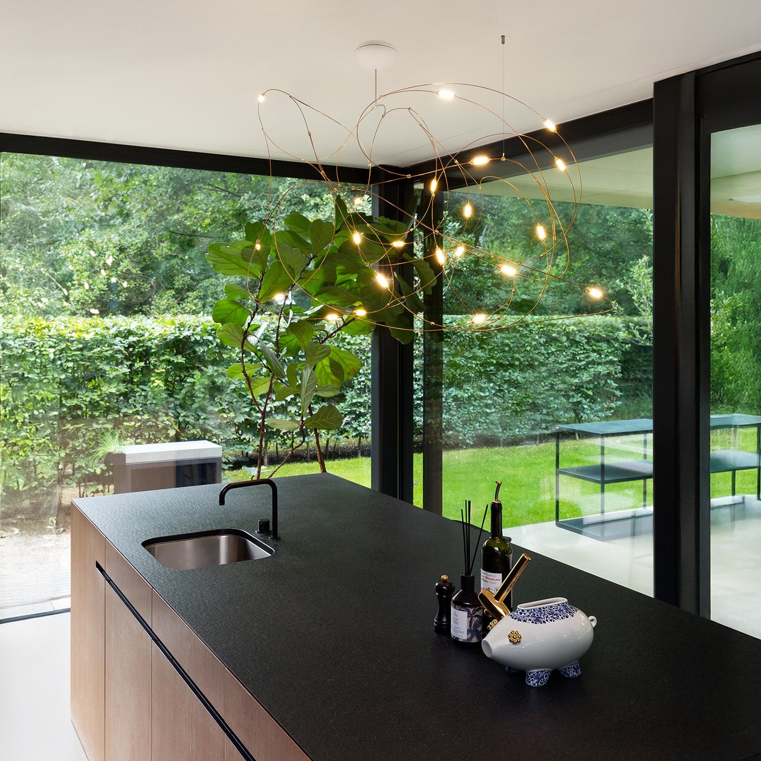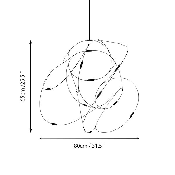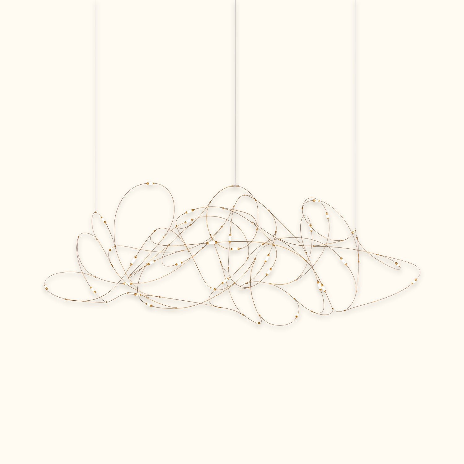 The design of the Flock of Light is a bright and transparent artwork during the day, and a warm, radiant light group at night. The light group remains stationary. Flock of Light is available in three sizes: 11, 21, and 31, which refer to the number of light sources. No matter the size of your room or table, there is always a Flock of Light that will perfectly illuminate it.