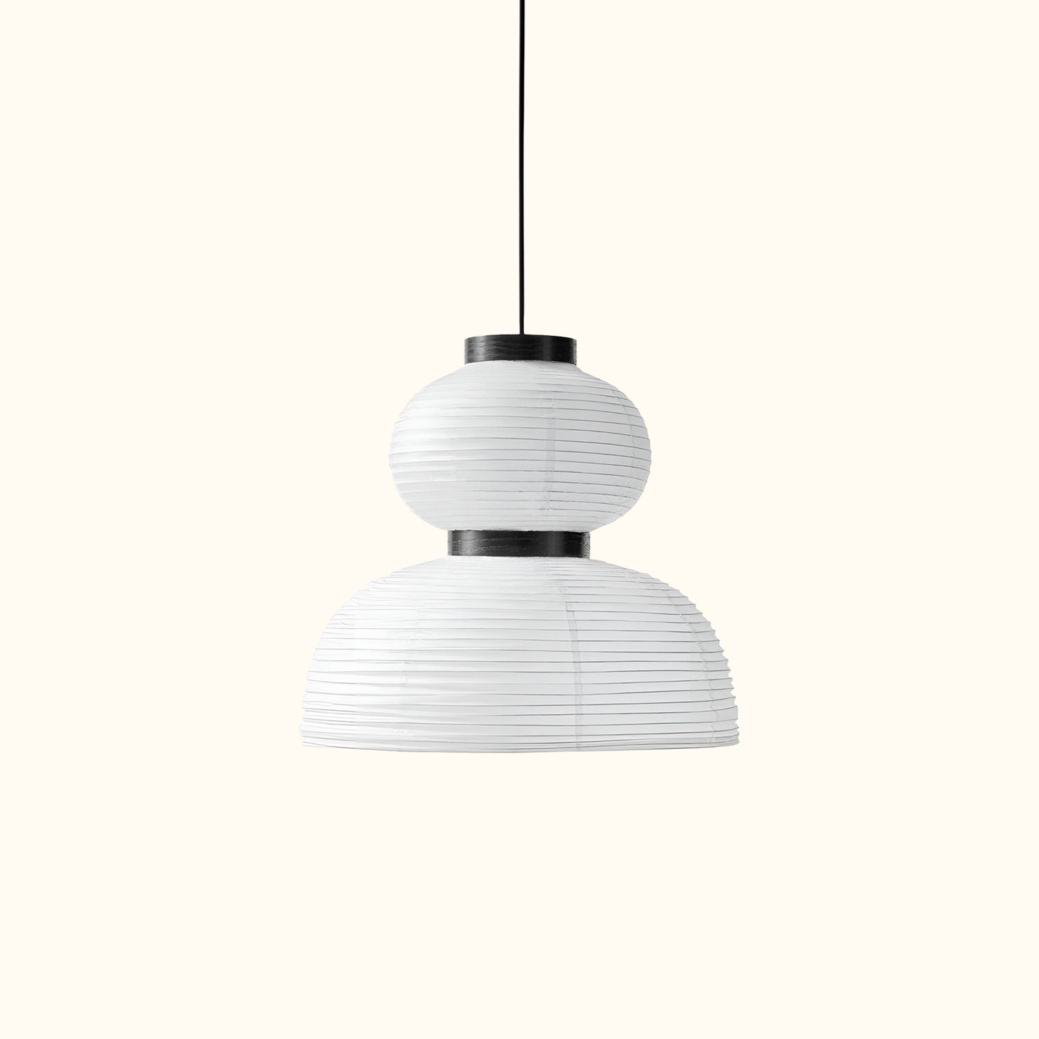 In Jaime Hayon’s designs, Eastern and Western cultures meet in a playful modern expression, where he skillfully reinterprets traditional Asian lanterns. Paper lanterns have a history spanning hundreds of years in Asia, widely present across various social classes, with different colors, shapes, and sizes representing different meanings. Here, Hayon discards cultural forms, presenting a series of entirely white light fixtures. The handcrafted fixtures are made from rice paper, combining various sizes and shapes. This series includes three different versions of lanterns and a table lamp, all adorned with ivory-white rice paper and black-stained oak.