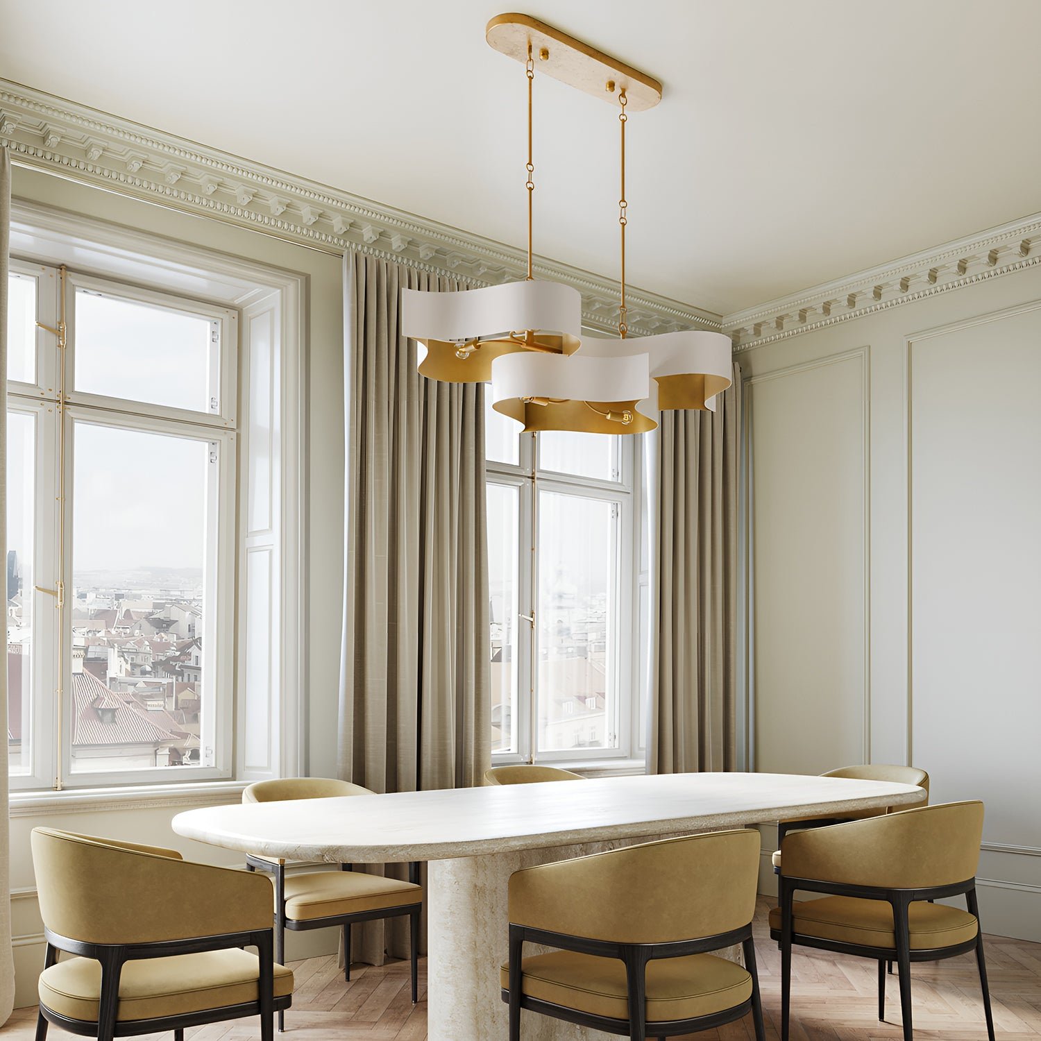 The white oval chandelier has a solemn appearance and exquisite craftsmanship, showcasing a harmonious blend of sugar white and modern gold leaf finishes. This white chandelier is meticulously crafted from wrought iron.