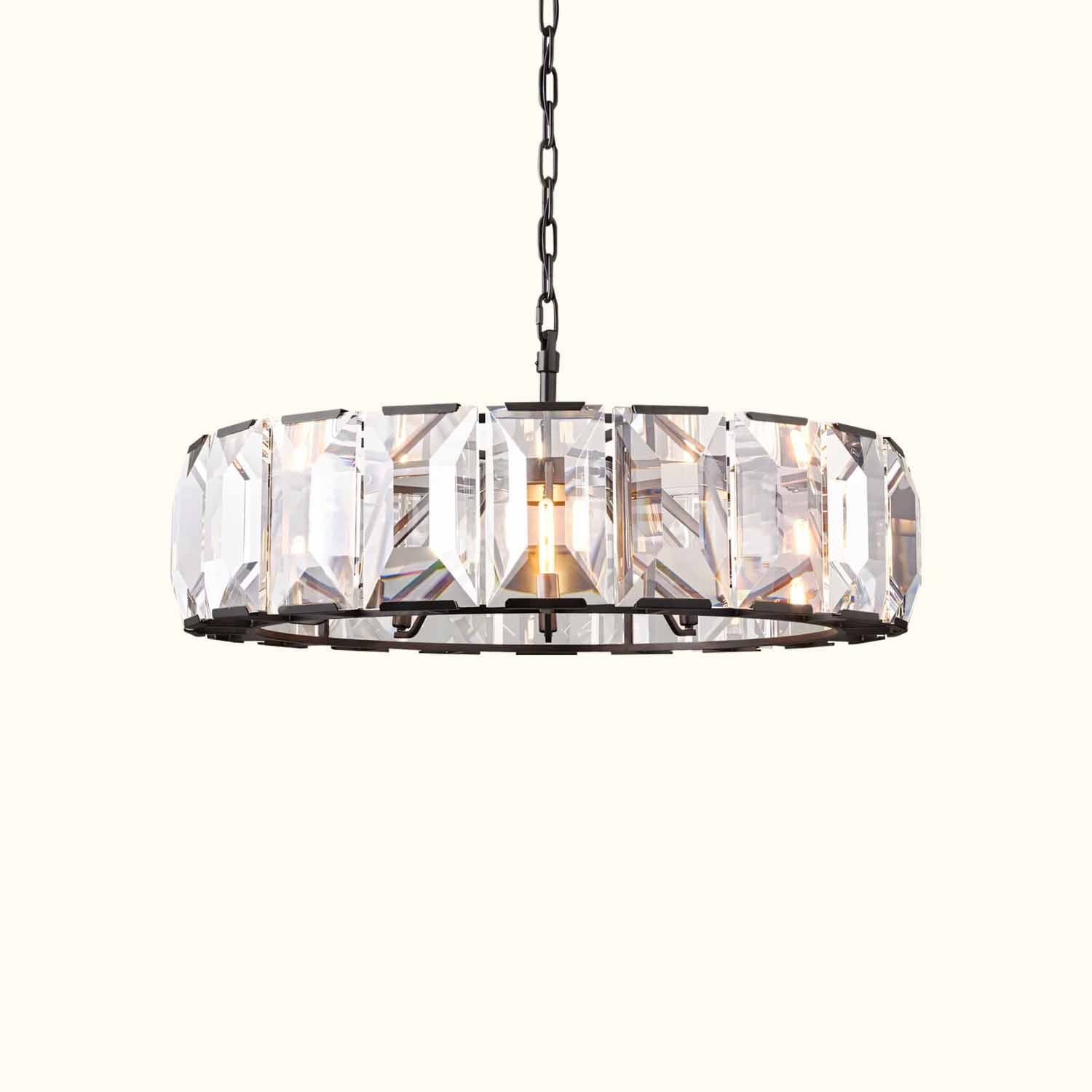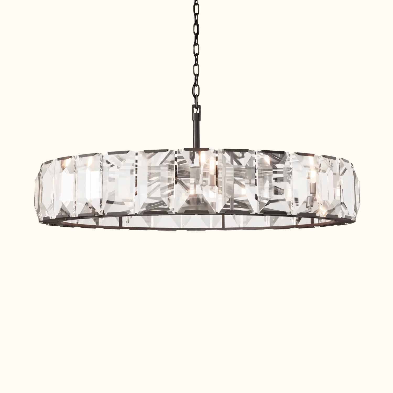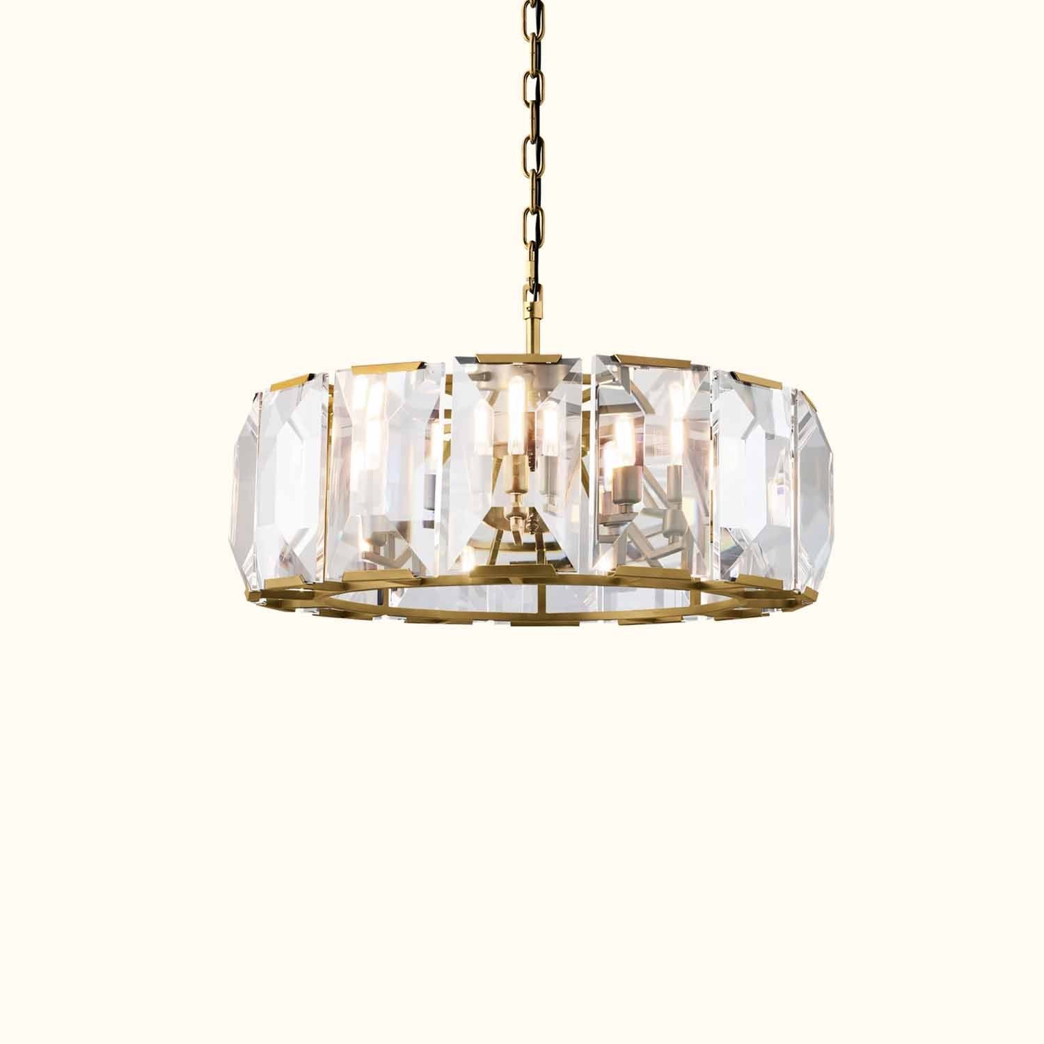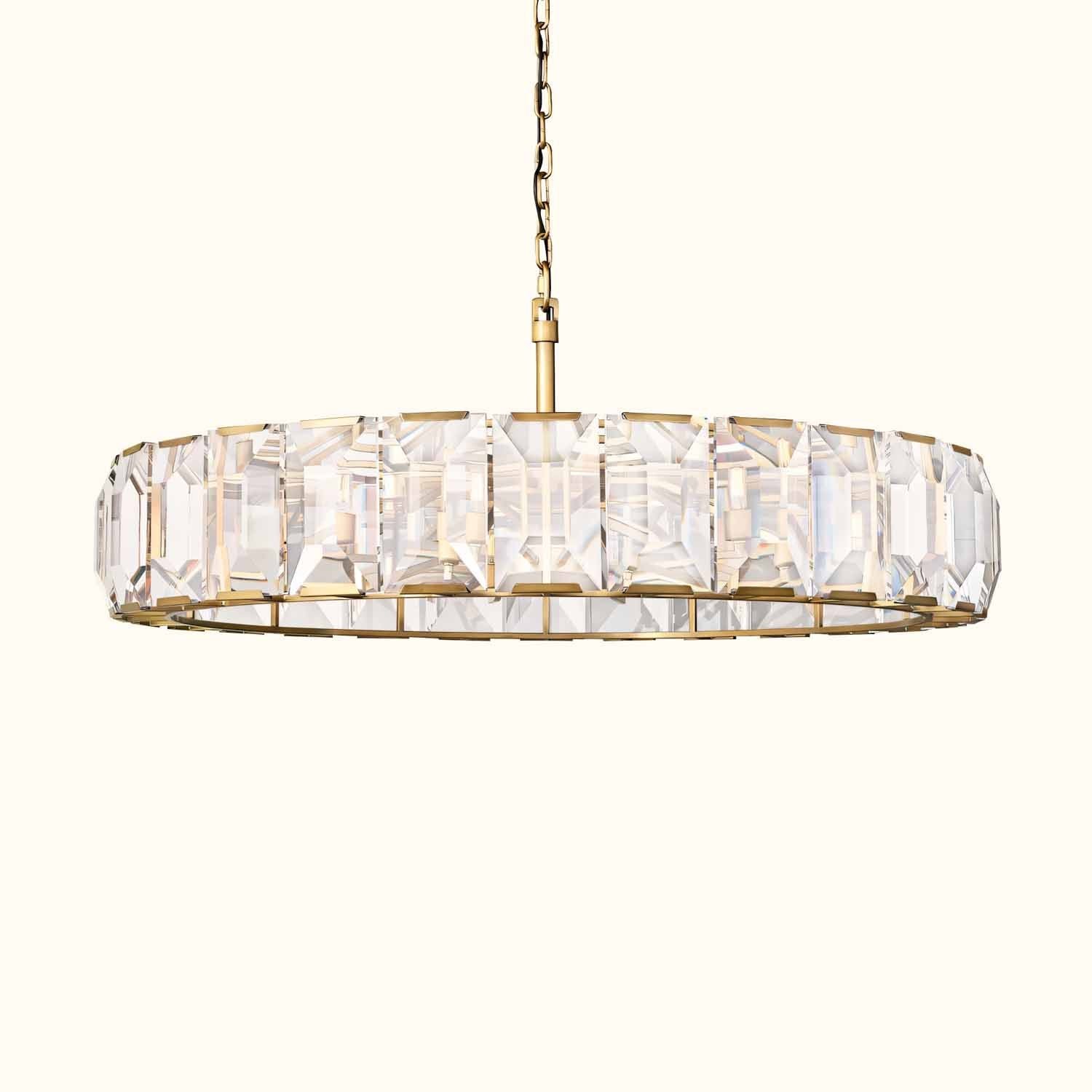 Inspired by a German chandelier from the 1970s, this fixture embodies the boldness and glamour of that era. A band of cut crystal prisms reflects and refracts the light, capturing the essence of emerald-cut diamonds.