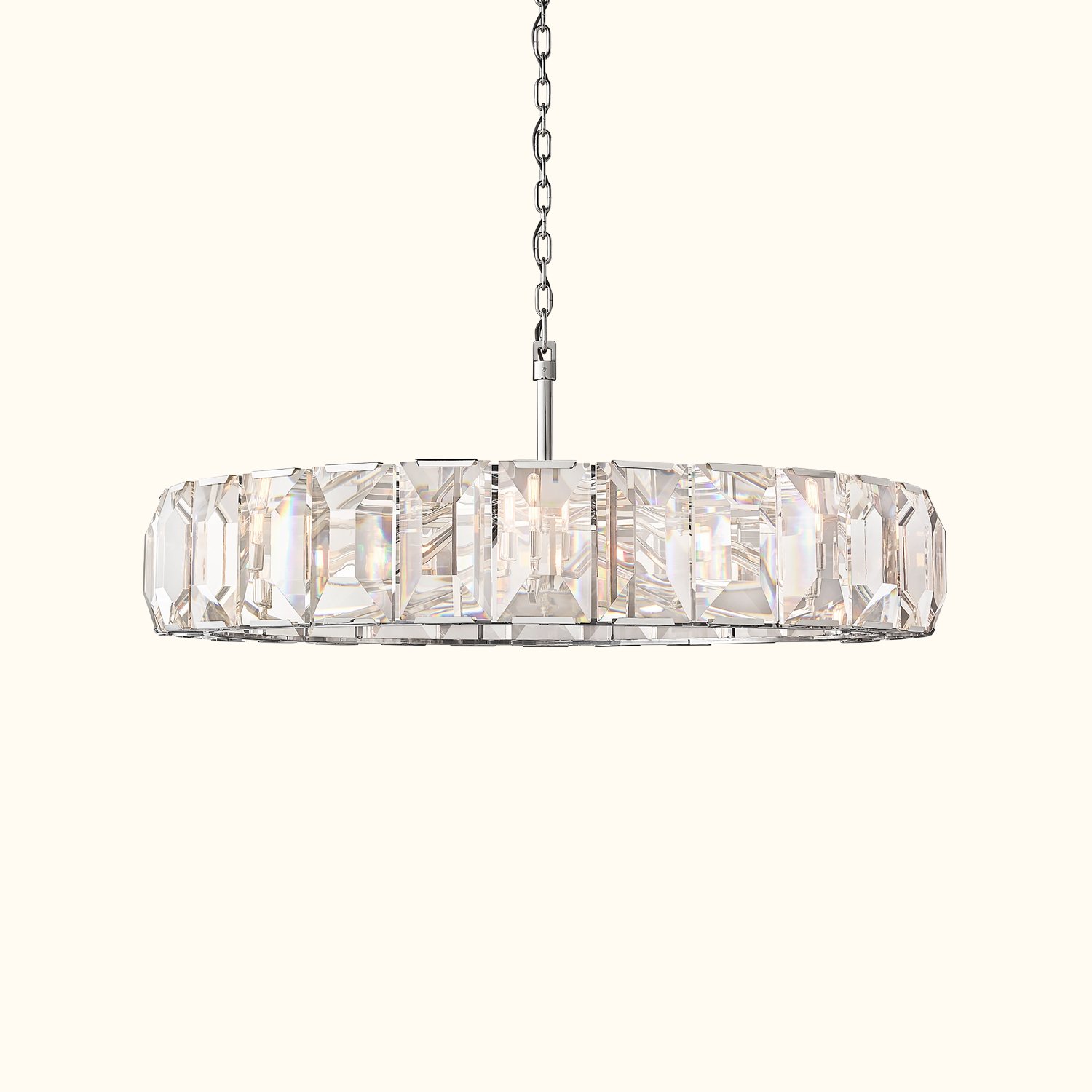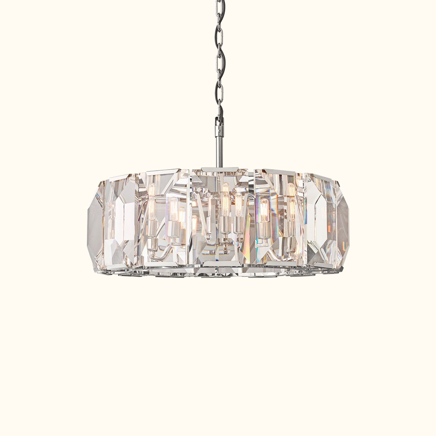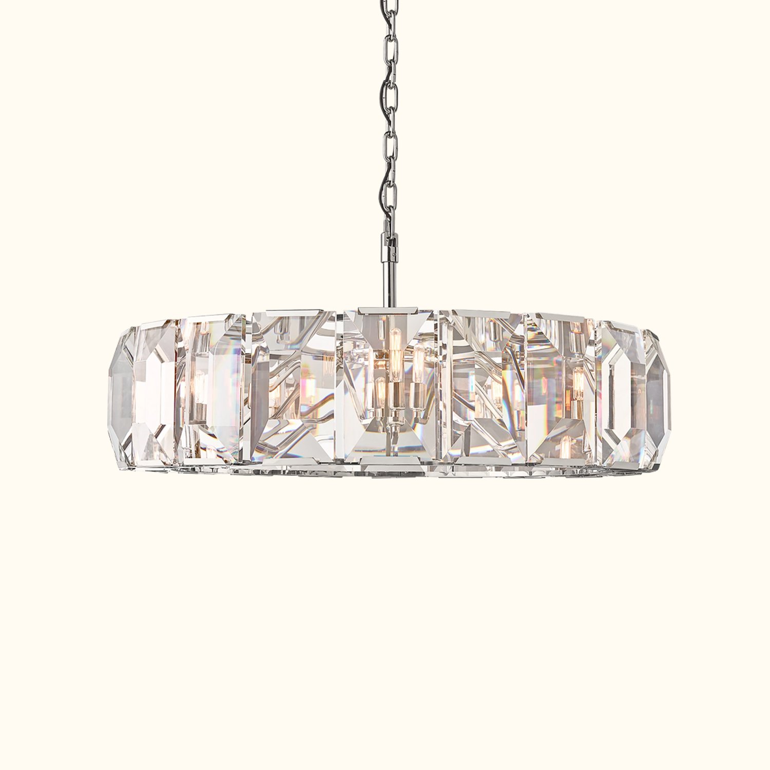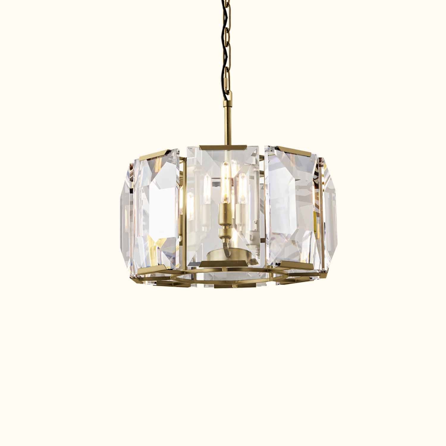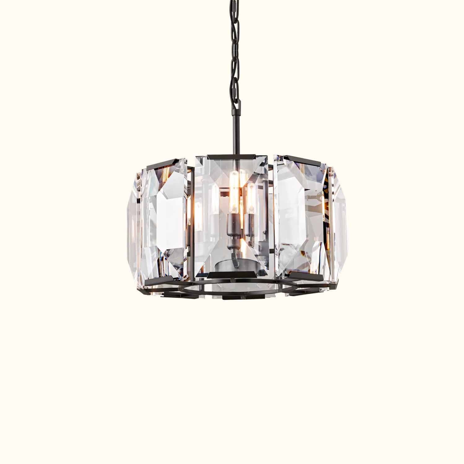 Inspired by a German chandelier from the 1970s, this fixture embodies the boldness and glamour of that era. A band of cut crystal prisms reflects and refracts the light, capturing the essence of emerald-cut diamonds.