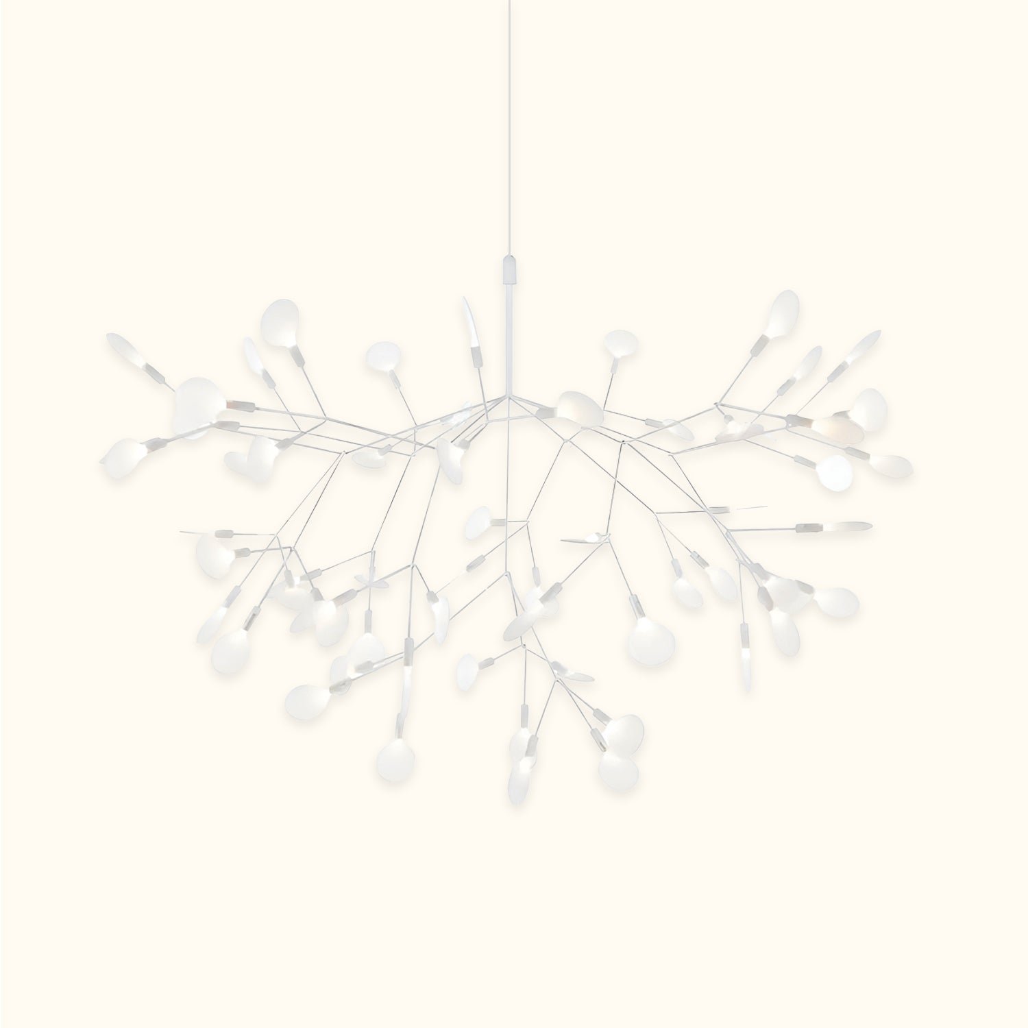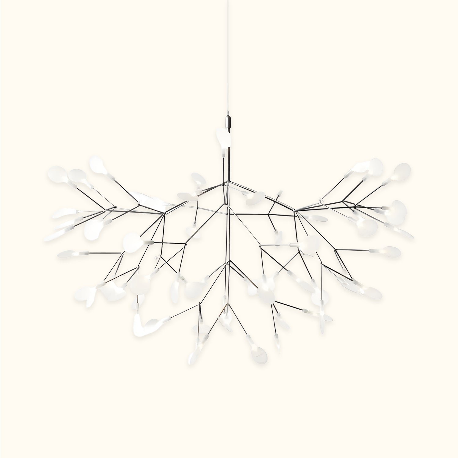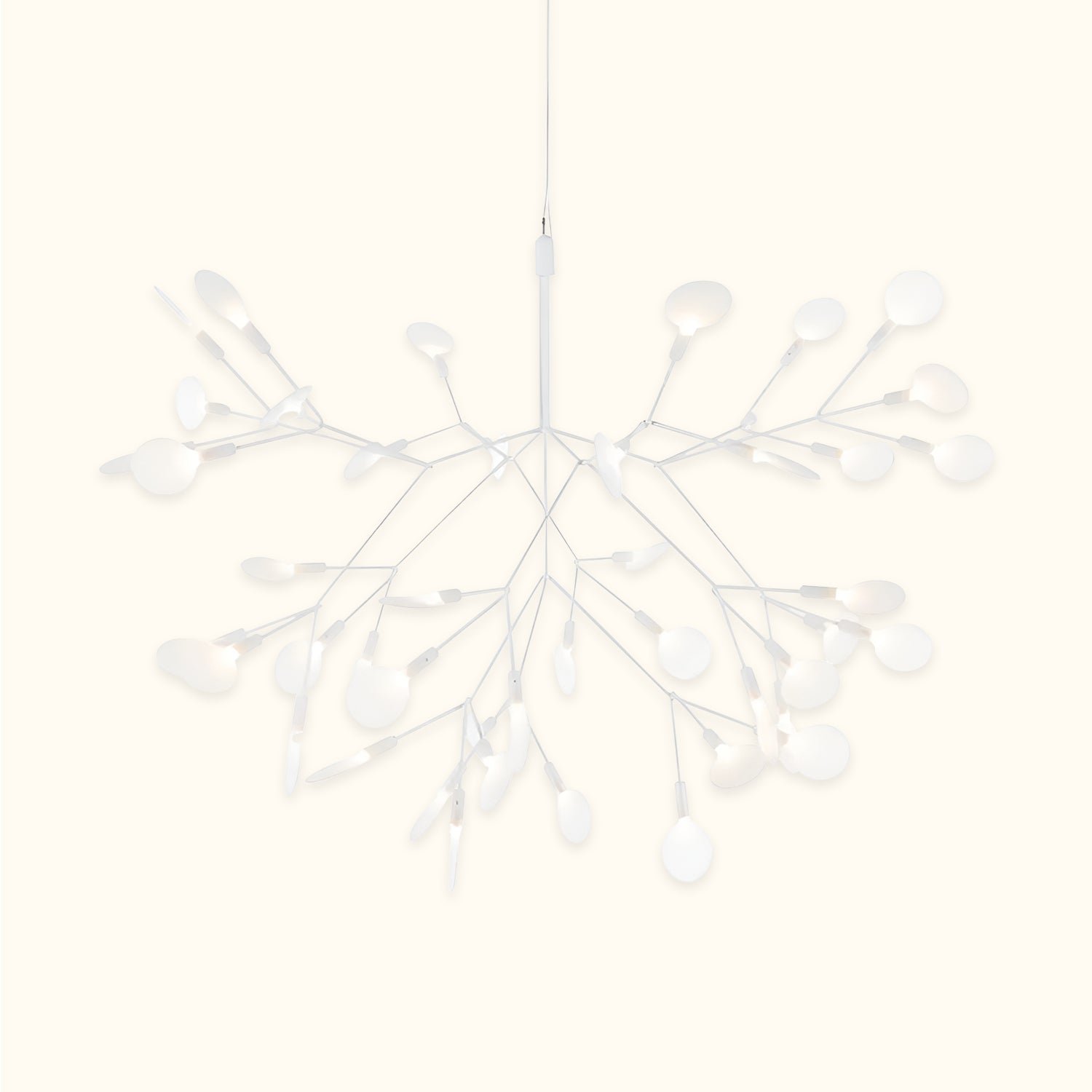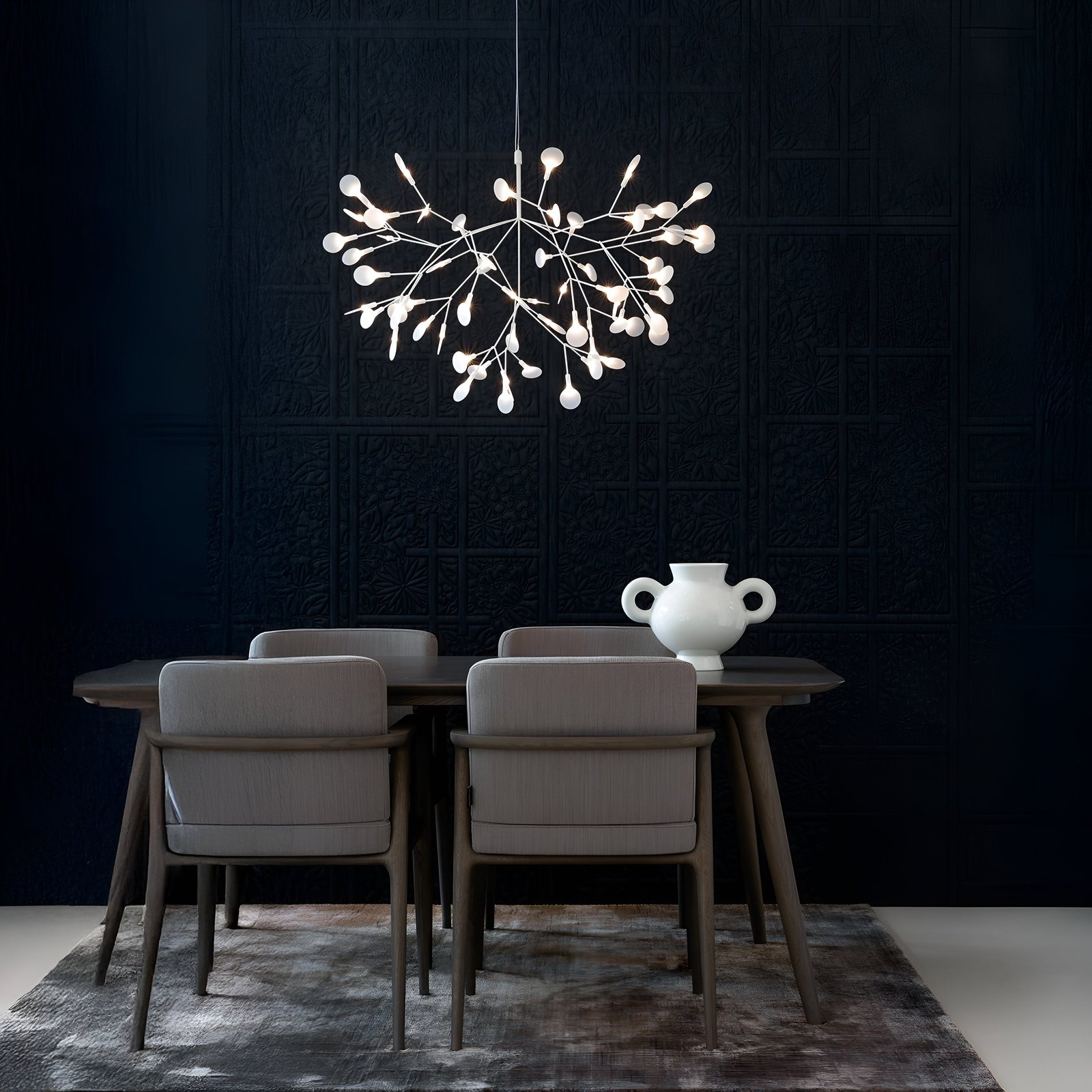 Nature and technology converge in the design of the Heracleum III Suspended. This lightweight LED light is inspired by a flowering plant of the same name, which can grow up to 5 meters tall. The white leaves in the Heracleum III Suspended branch off from a single stem, creating a highly technical natural structure, thanks to a conductive layer coating technology known as Electrosandwich. The Heracleum III Suspended comes in two sizes and four different colors. It is compatible with our wireless wall switch, allowing for quick and easy dimming, giving you complete control over the light output.