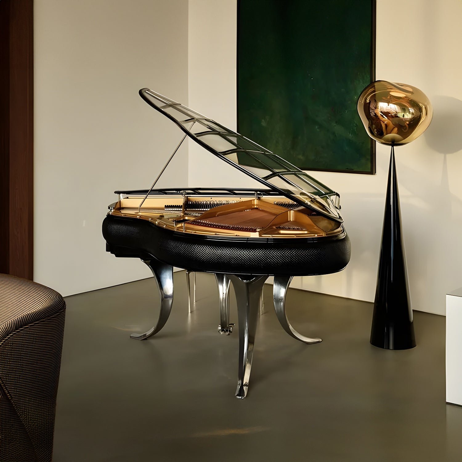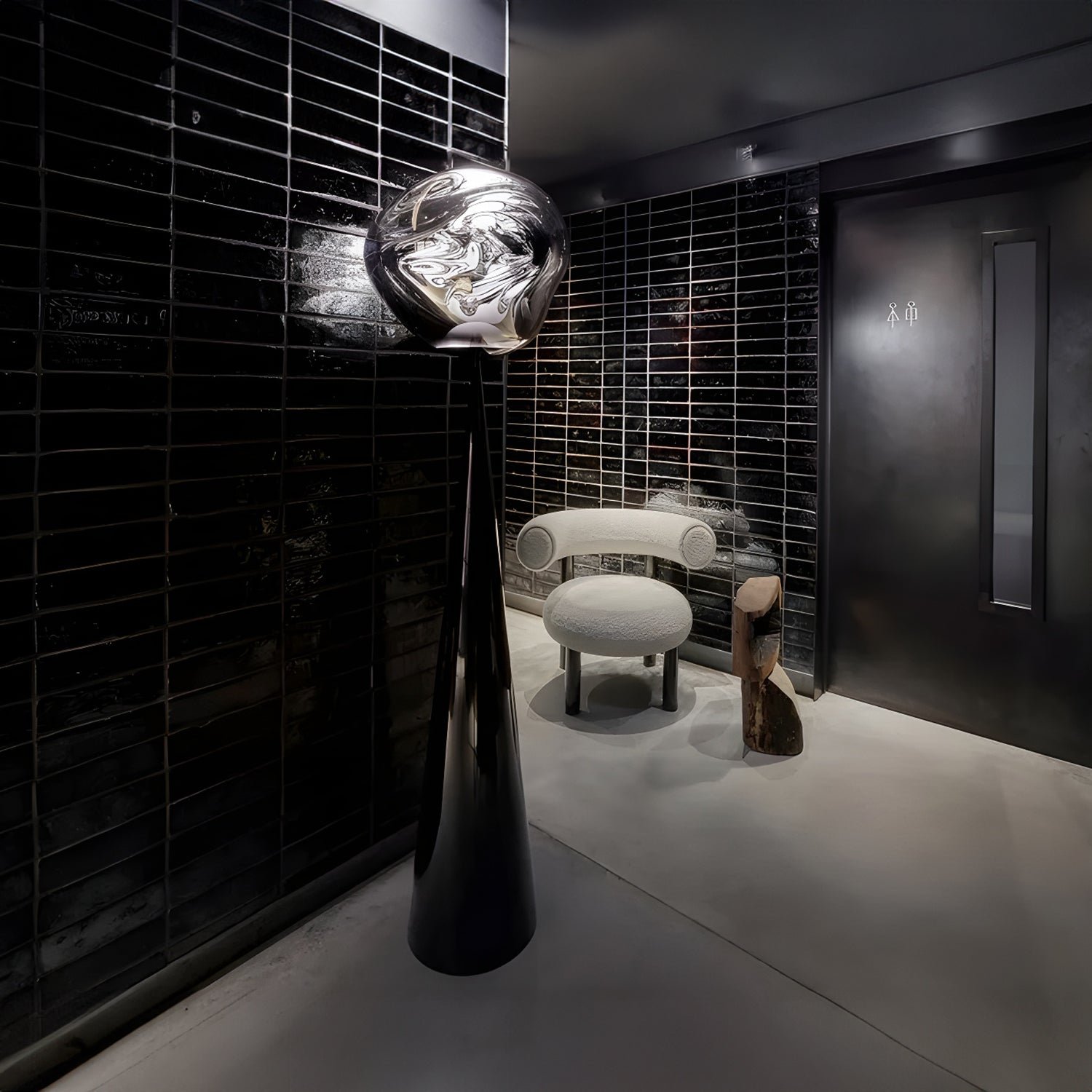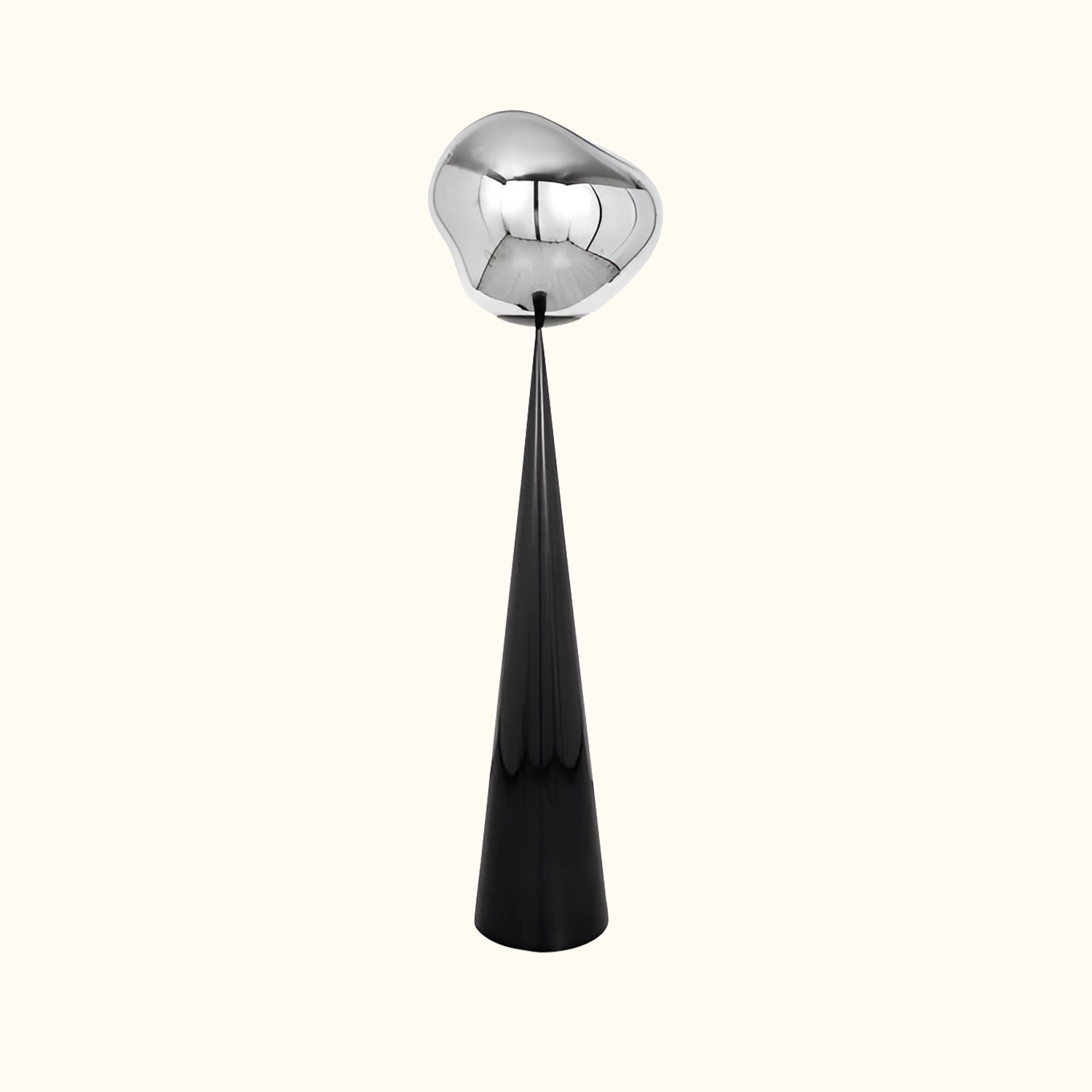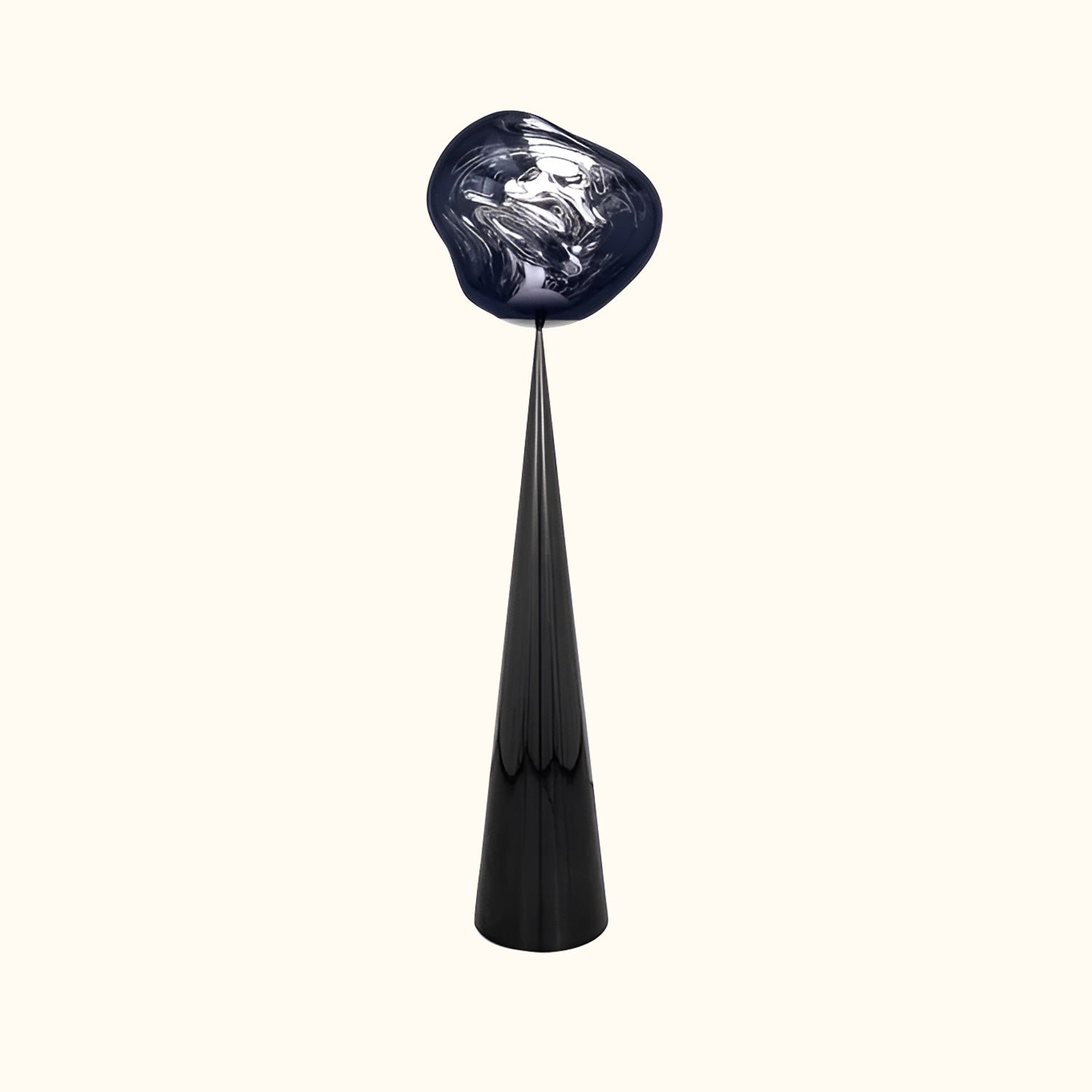 The MELT CONE FAT is an LED floor lamp featuring a metal base and a polycarbonate lampshade. Its design is inspired by molten glass, the core of a melting glacier, and the vastness of deep space. This light, with its imperfect, natural, and organic form, creates a captivating hot-blown glass effect. Melt is produced using blow molding and vacuum metallization techniques, resulting in luminous, unique melted orbs.