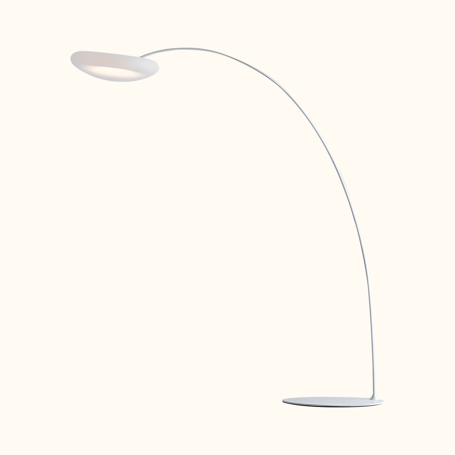 The floor lamp resembles a glowing cloud, suspended at the end of a curved lamp pole, adorned with winding, natural lines for a pleasing effect. The light source is fully integrated, emitting a soft and diffused glow.
