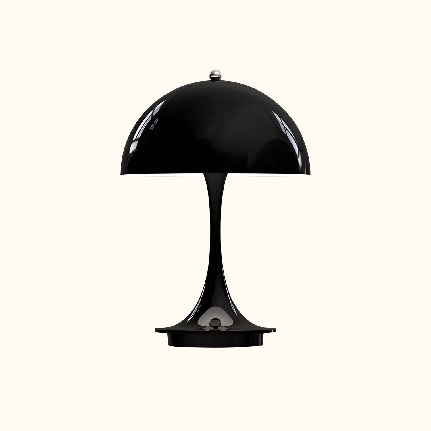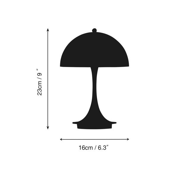 The Panthella Portable V2 portable table lamp emits a glare-free, soft, and comfortable light. The metal shade variant reflects the light downwards, providing pleasant illumination through the inner white-painted shade and the reflection from the trumpet-shaped stem. The opal acrylic variant offers soft lighting and a subtle ambiance due to its transparency and the reflection of the downward light on the inner side of the shade.