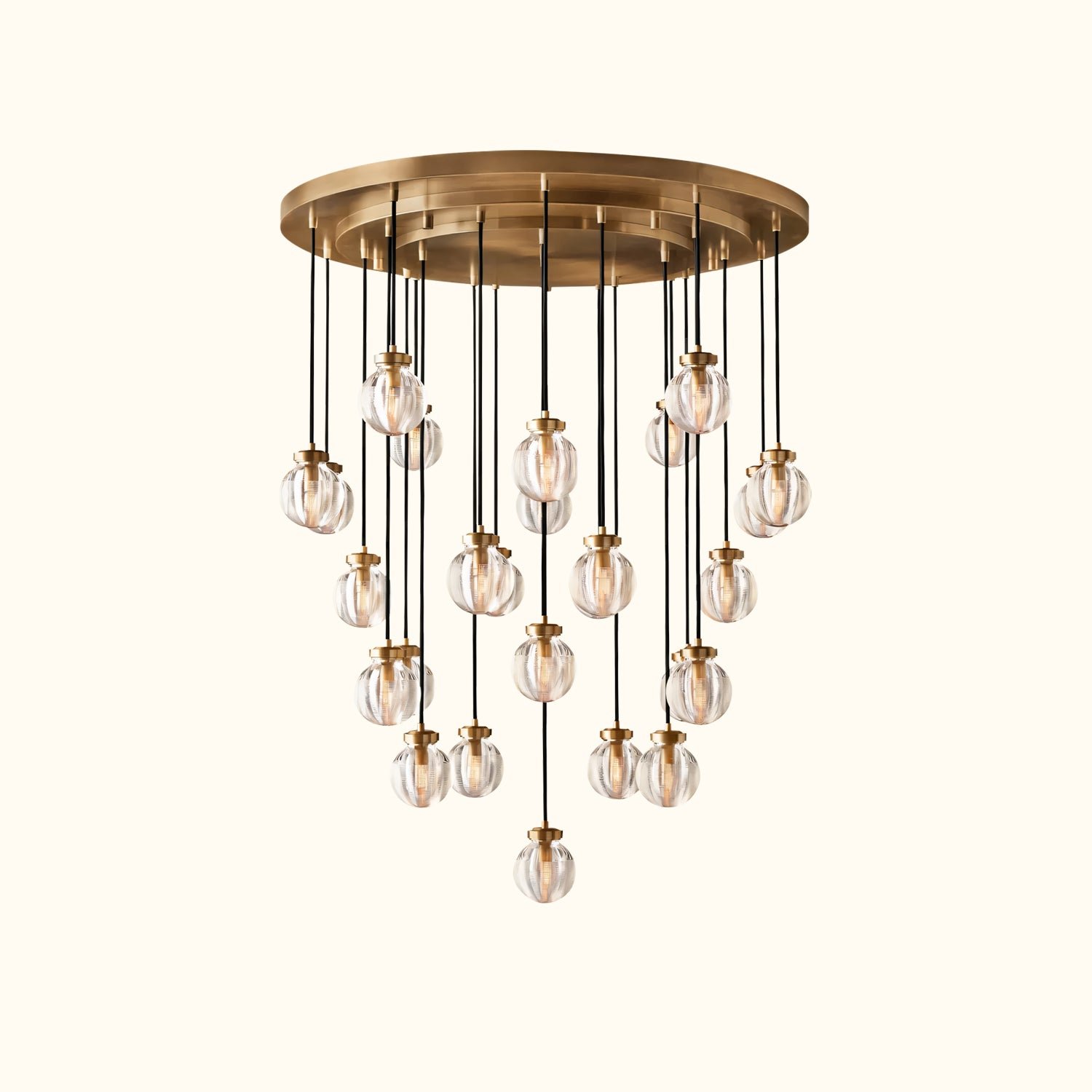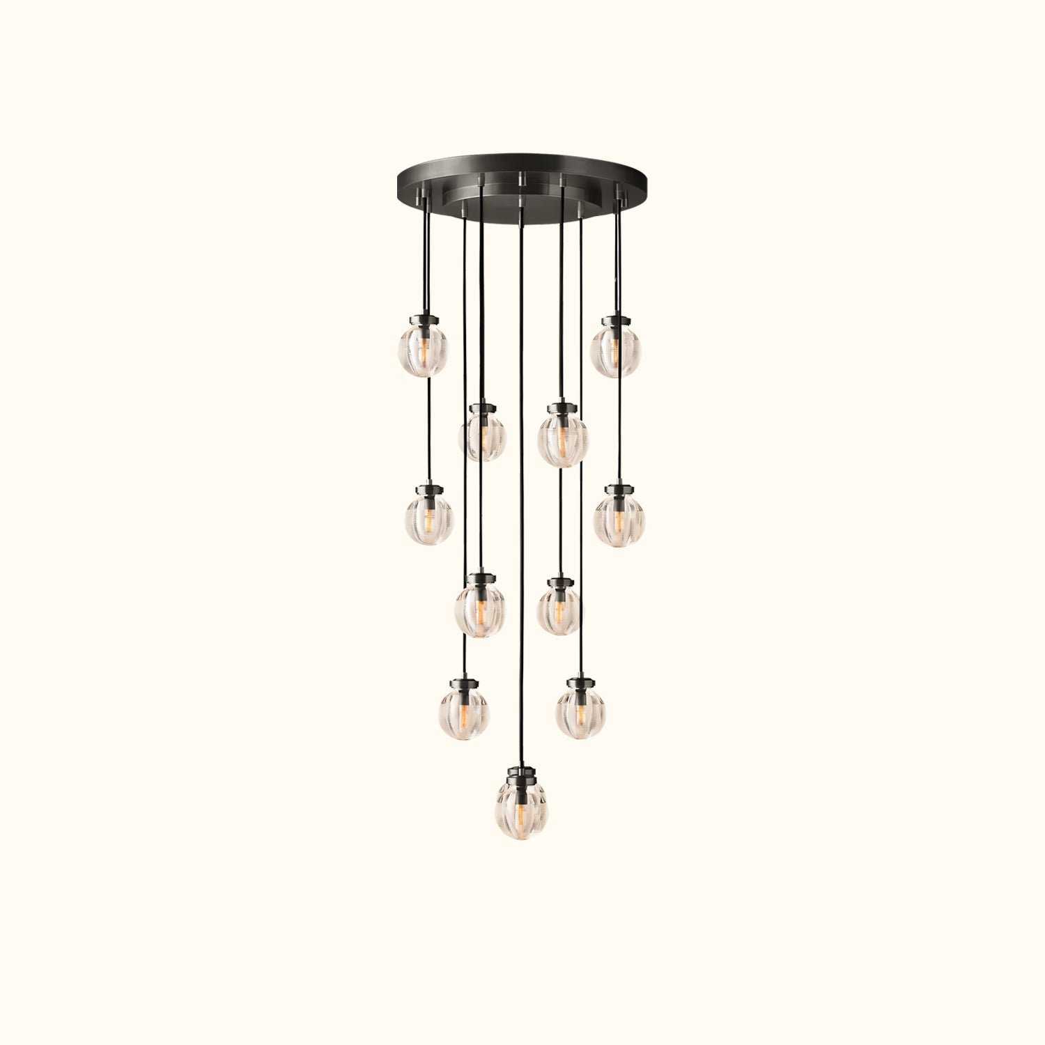 Glass pearls are carved with intricate grooves that create shimmering layers of light, bringing a lustrous, oceanic beauty to this collection. Influenced by the inciso technique developed by Venetian glass makers, the texture both filters the illumination and invites contemplation, making these pieces feel simultaneously ethereal and intimate.