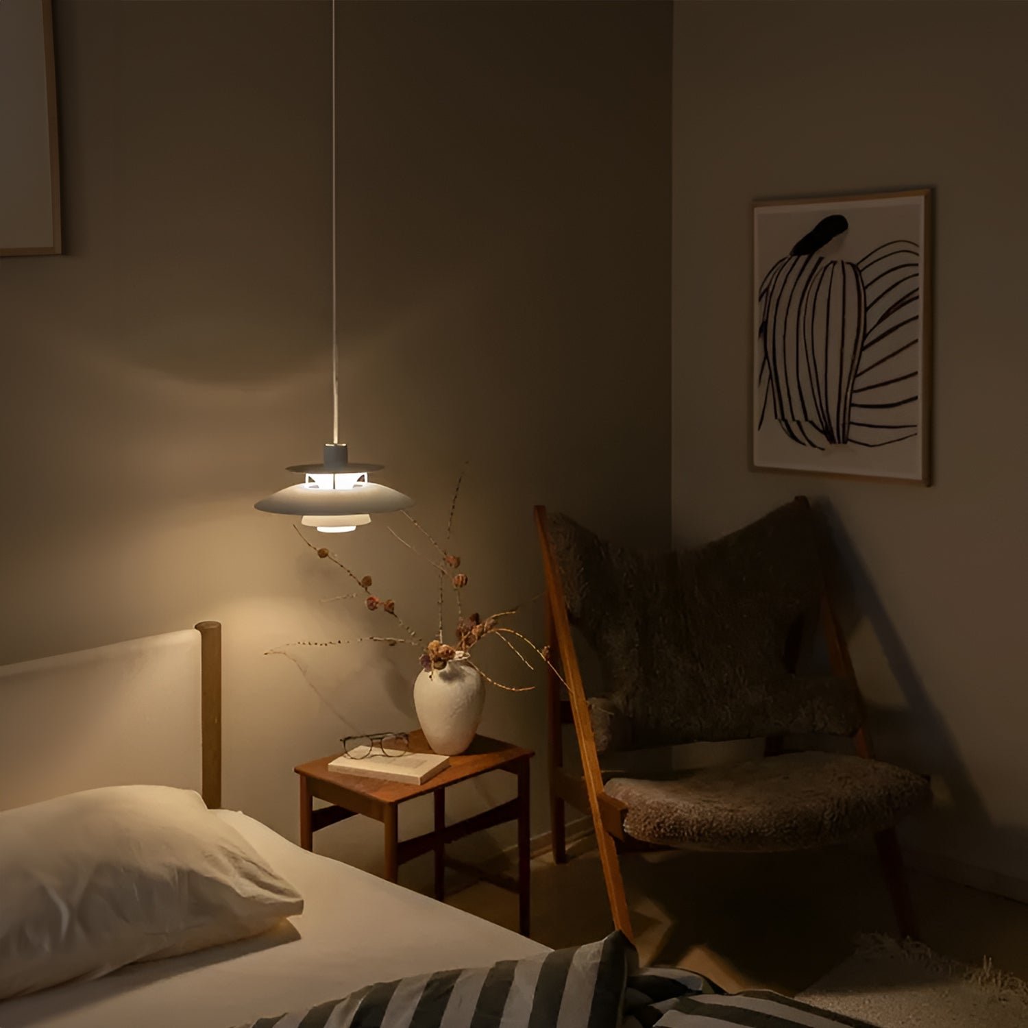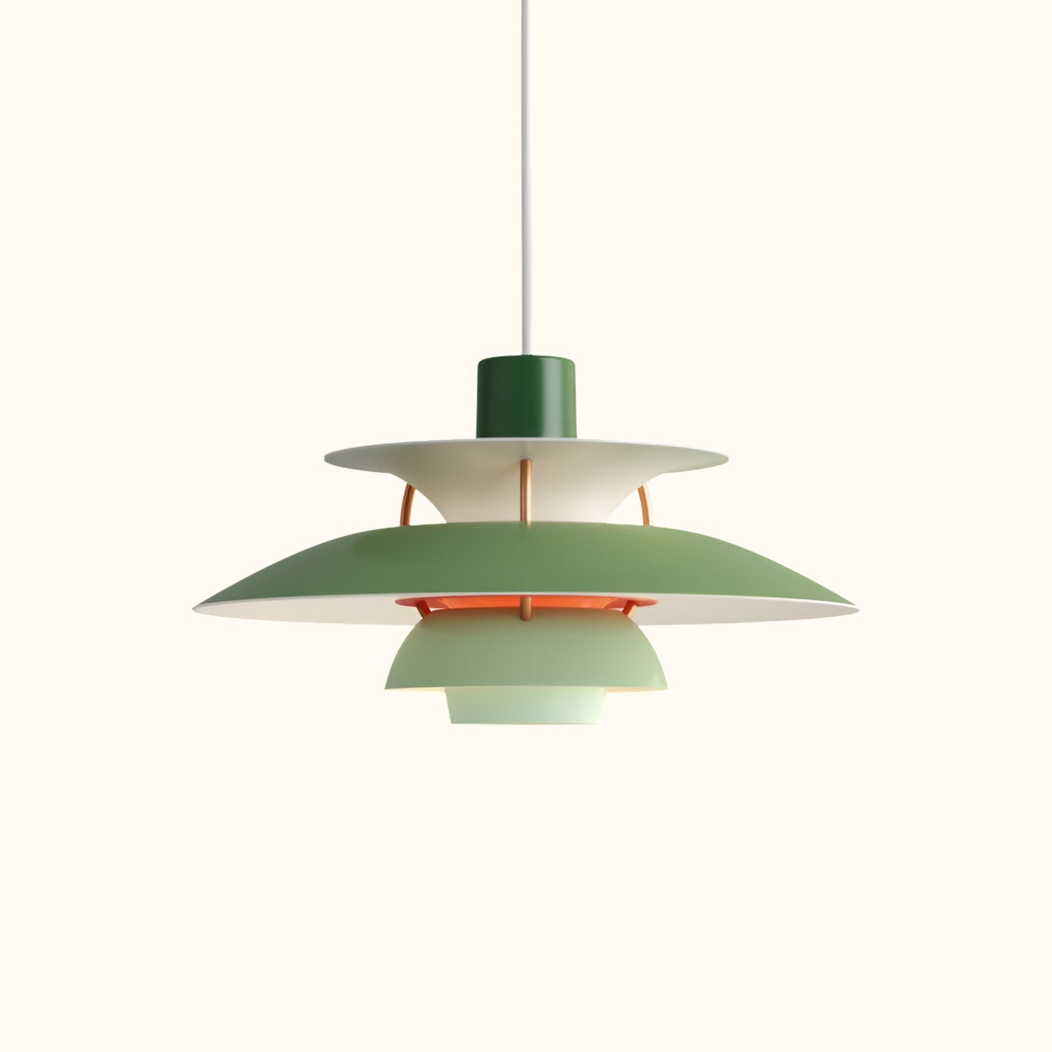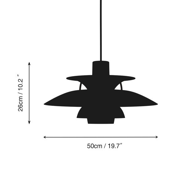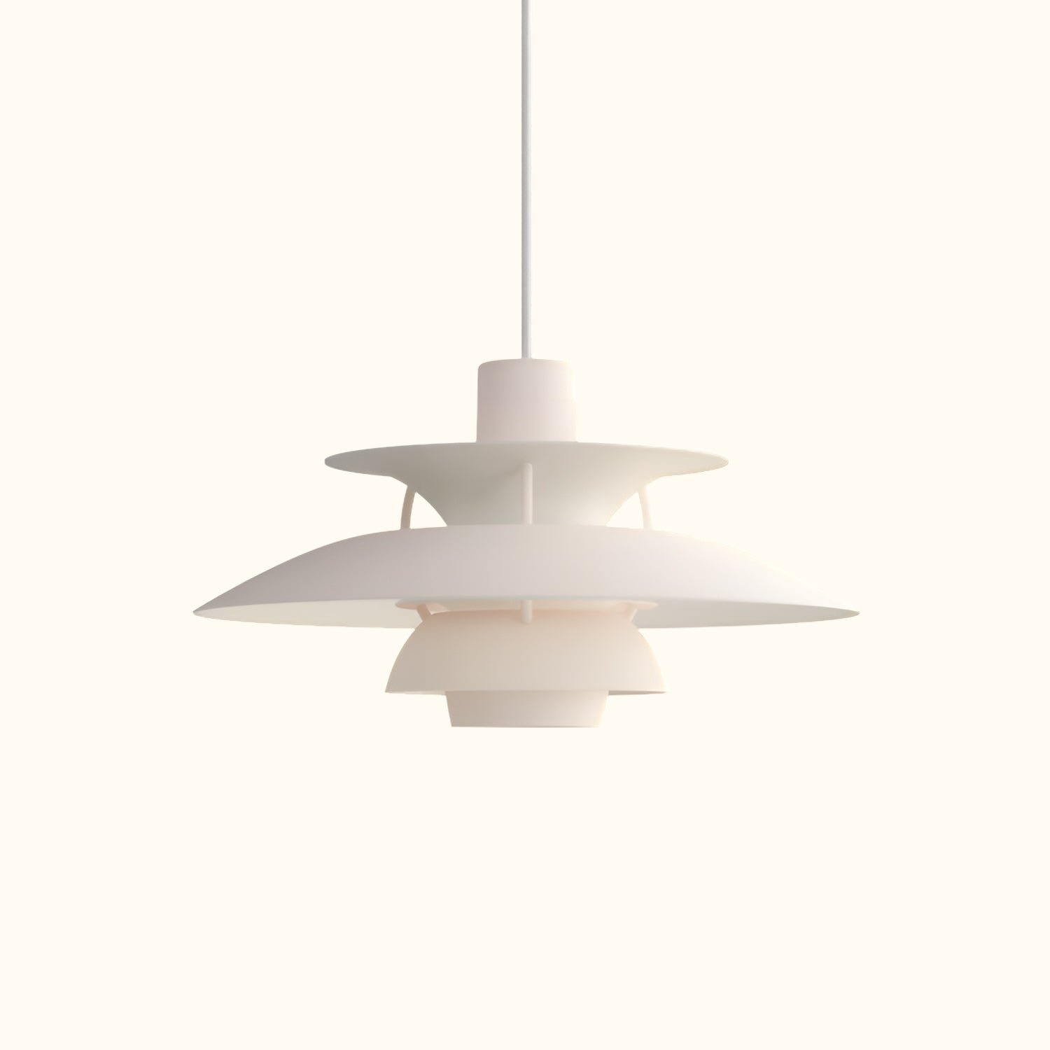 The fixture provides 100% glare-free light. Poul Henningsen developed the PH 5 in 1958 as a follow-up to his renowned three-shade system. The fixture emits light both downwards and sideways, thus illuminating itself. In the PH 5 Classic, a warmer tone of light is created by the internal red cone and a small blue reflector.