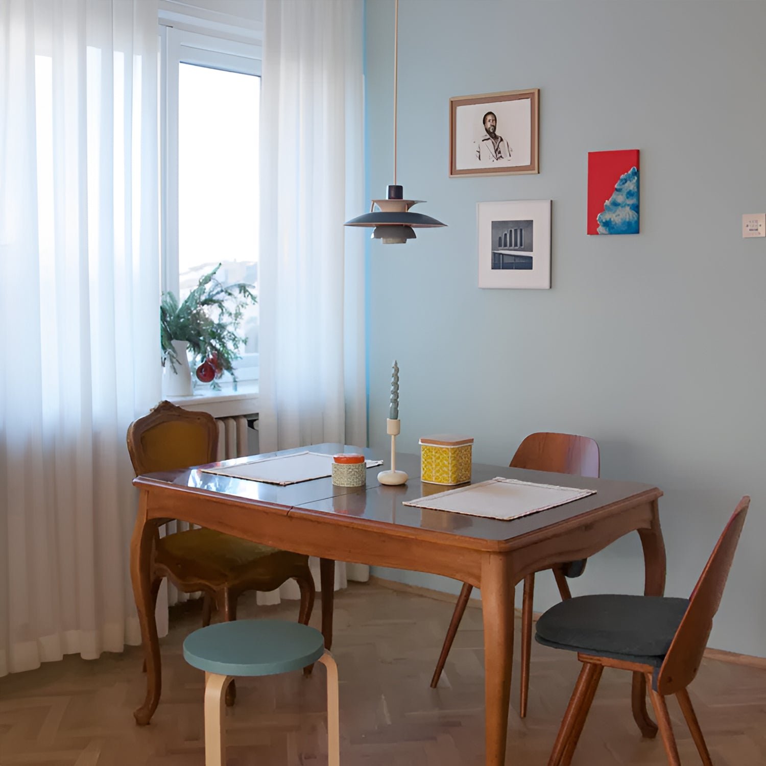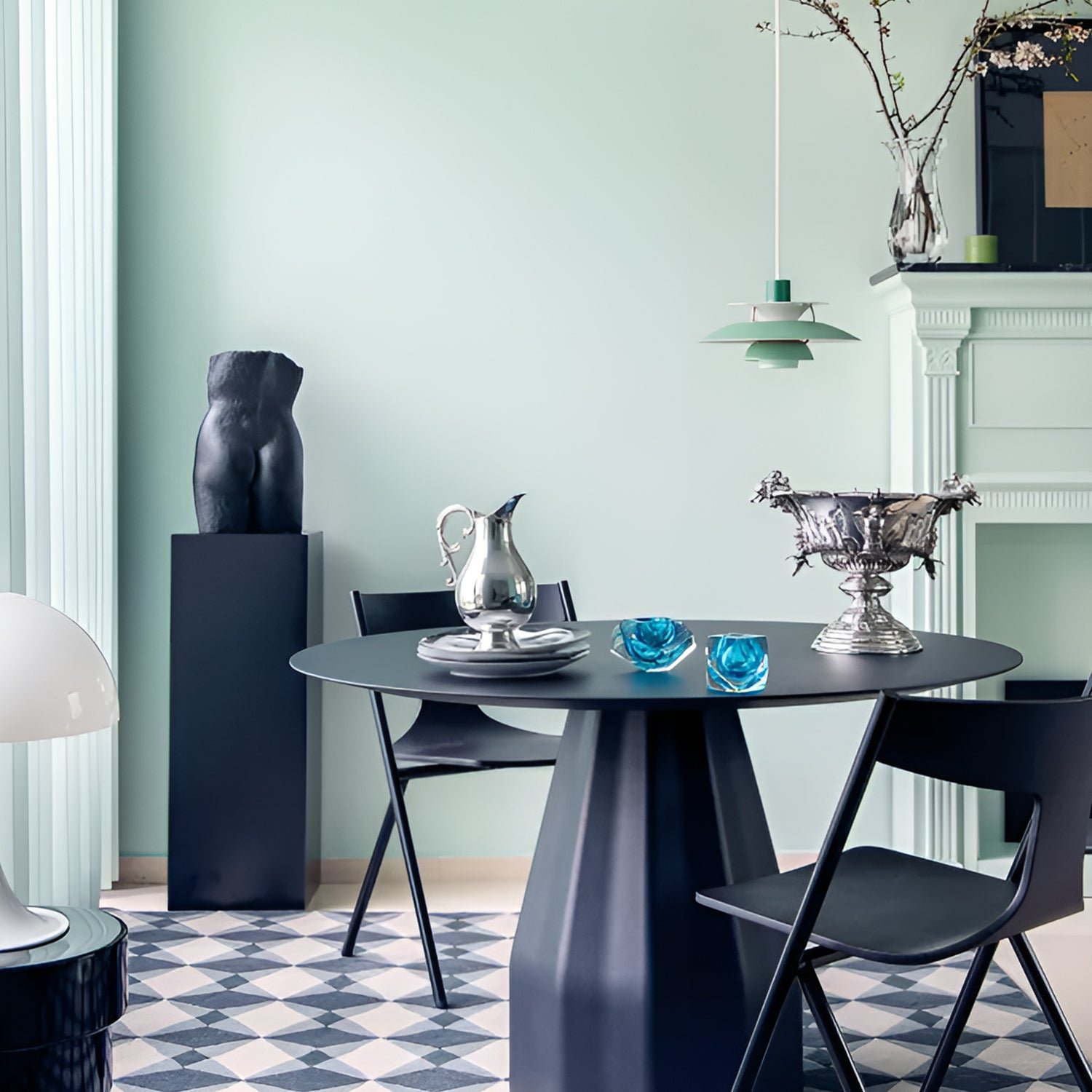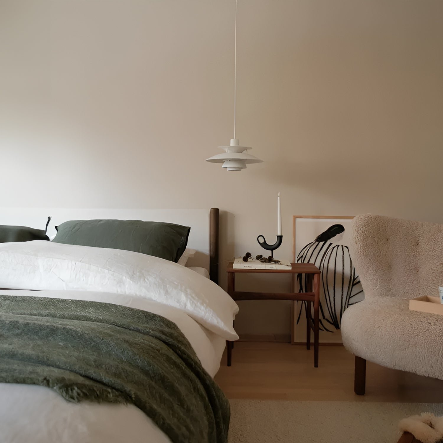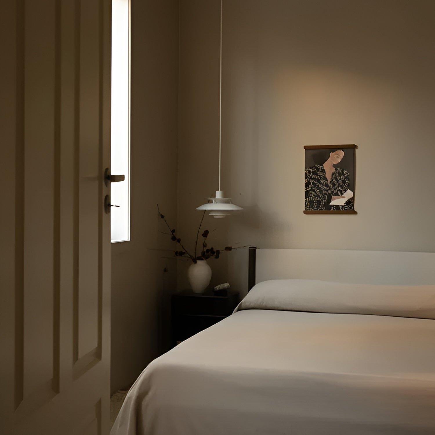 The fixture provides 100% glare-free light. Poul Henningsen developed the PH 5 in 1958 as a follow-up to his renowned three-shade system. The fixture emits light both downwards and sideways, thus illuminating itself. In the PH 5 Classic, a warmer tone of light is created by the internal red cone and a small blue reflector.