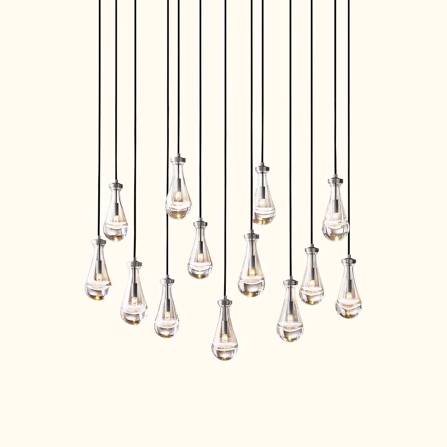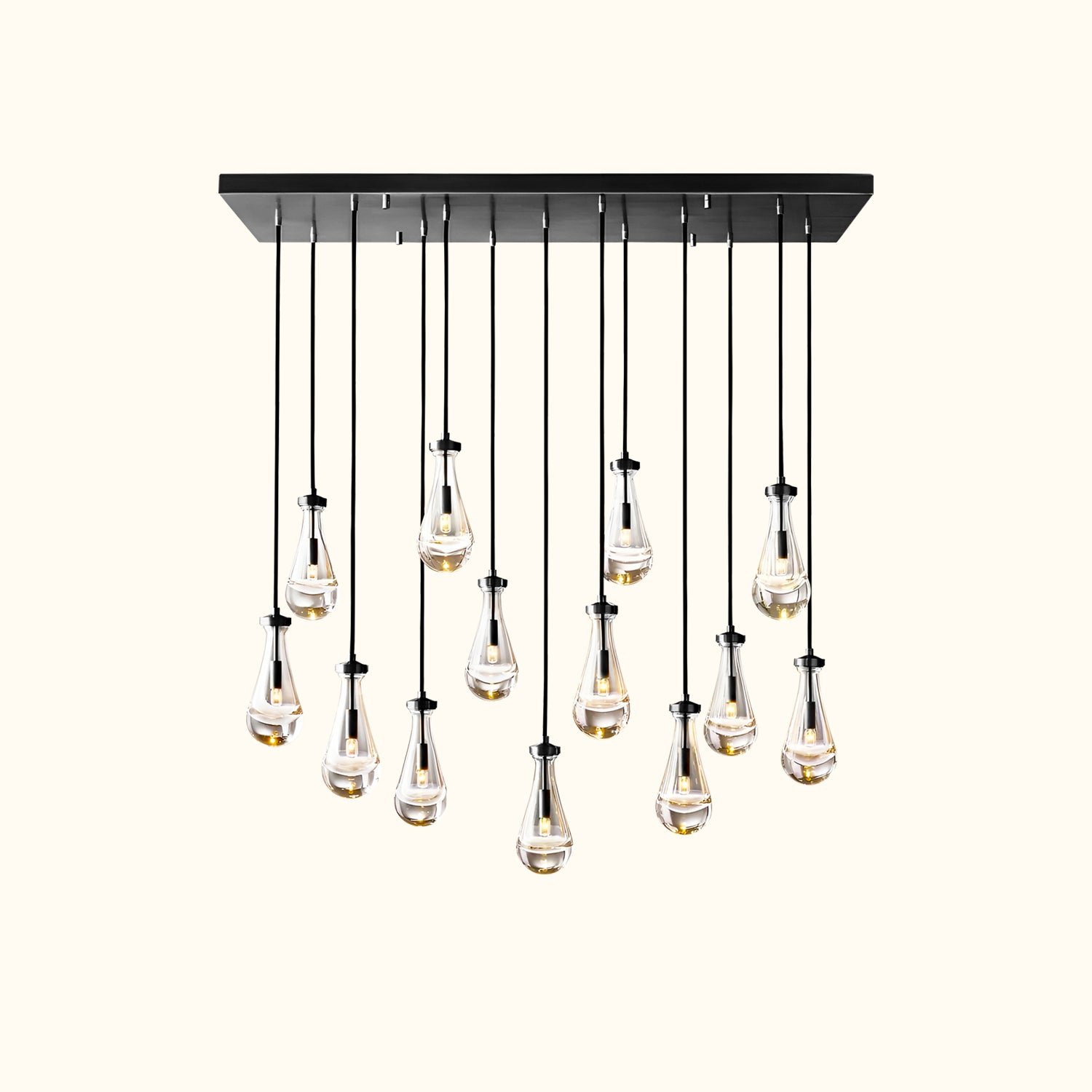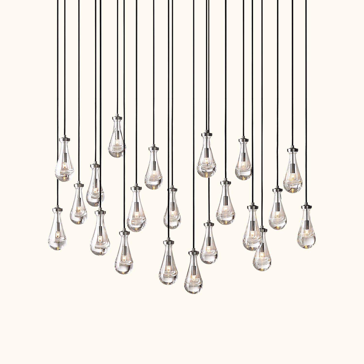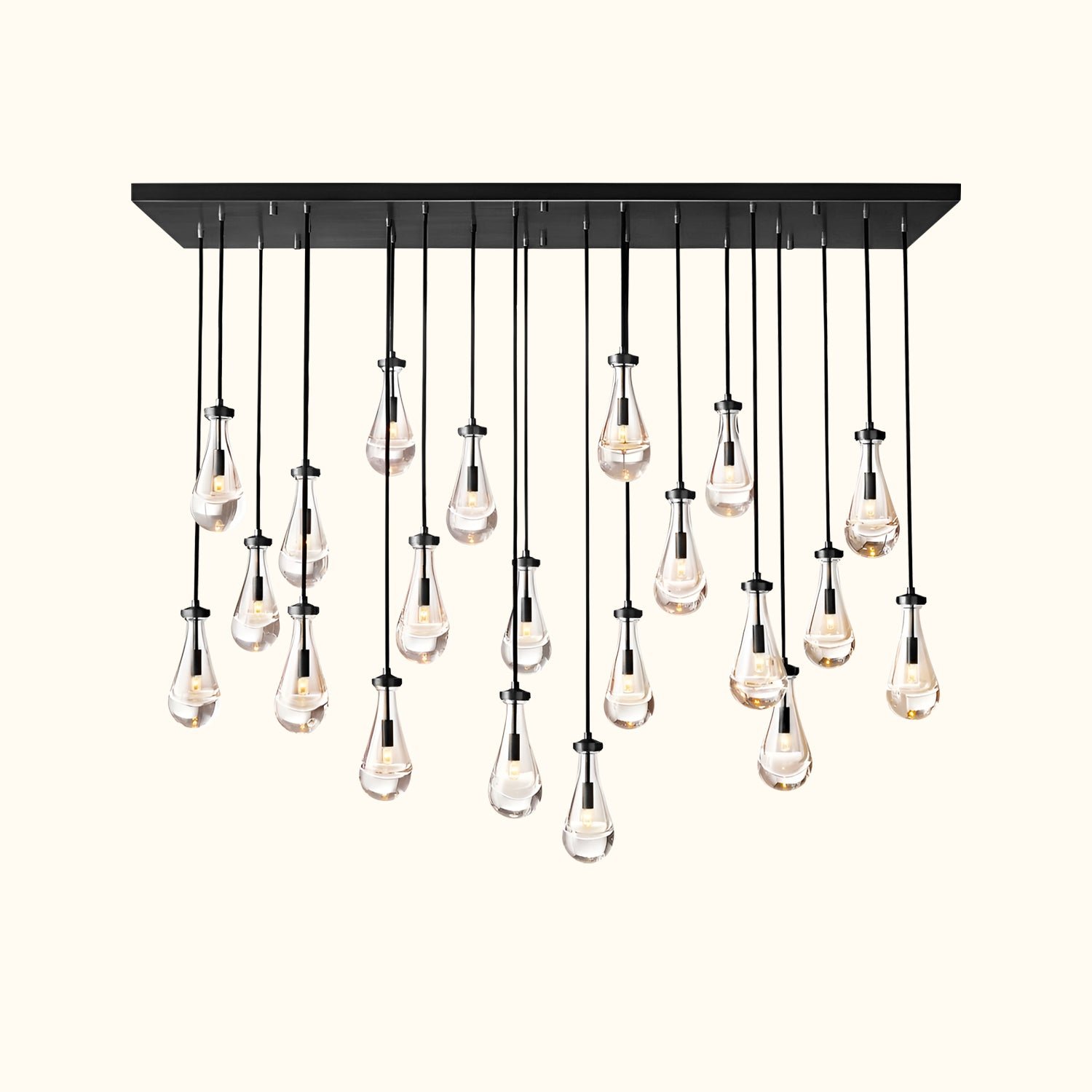 A master glass designer has created a dramatic evocation of rain in this inspired collection. Blown glass drops are suspended from slim black cords, encasing the bulb and casting luminous ripples that wash across ceilings and walls.
