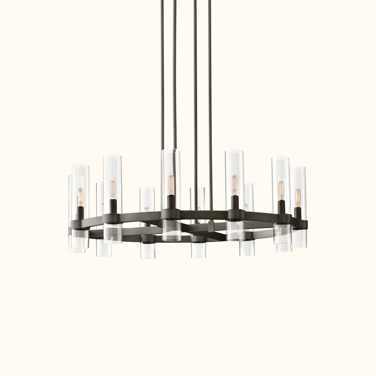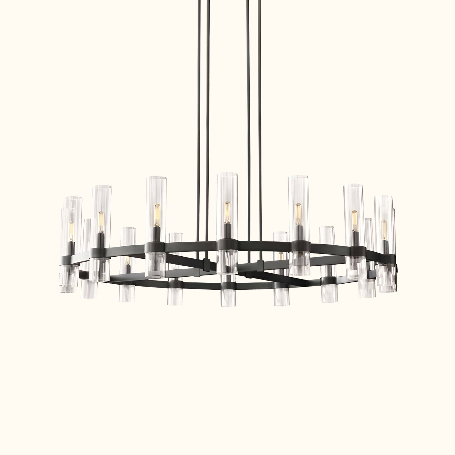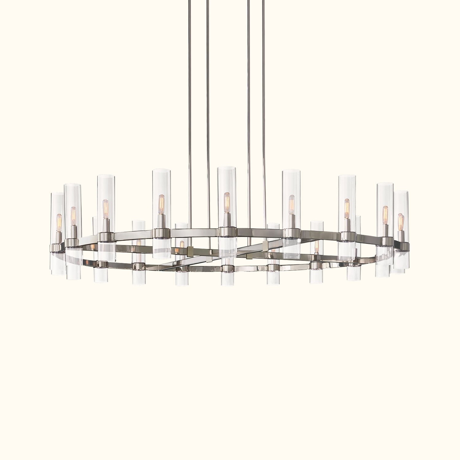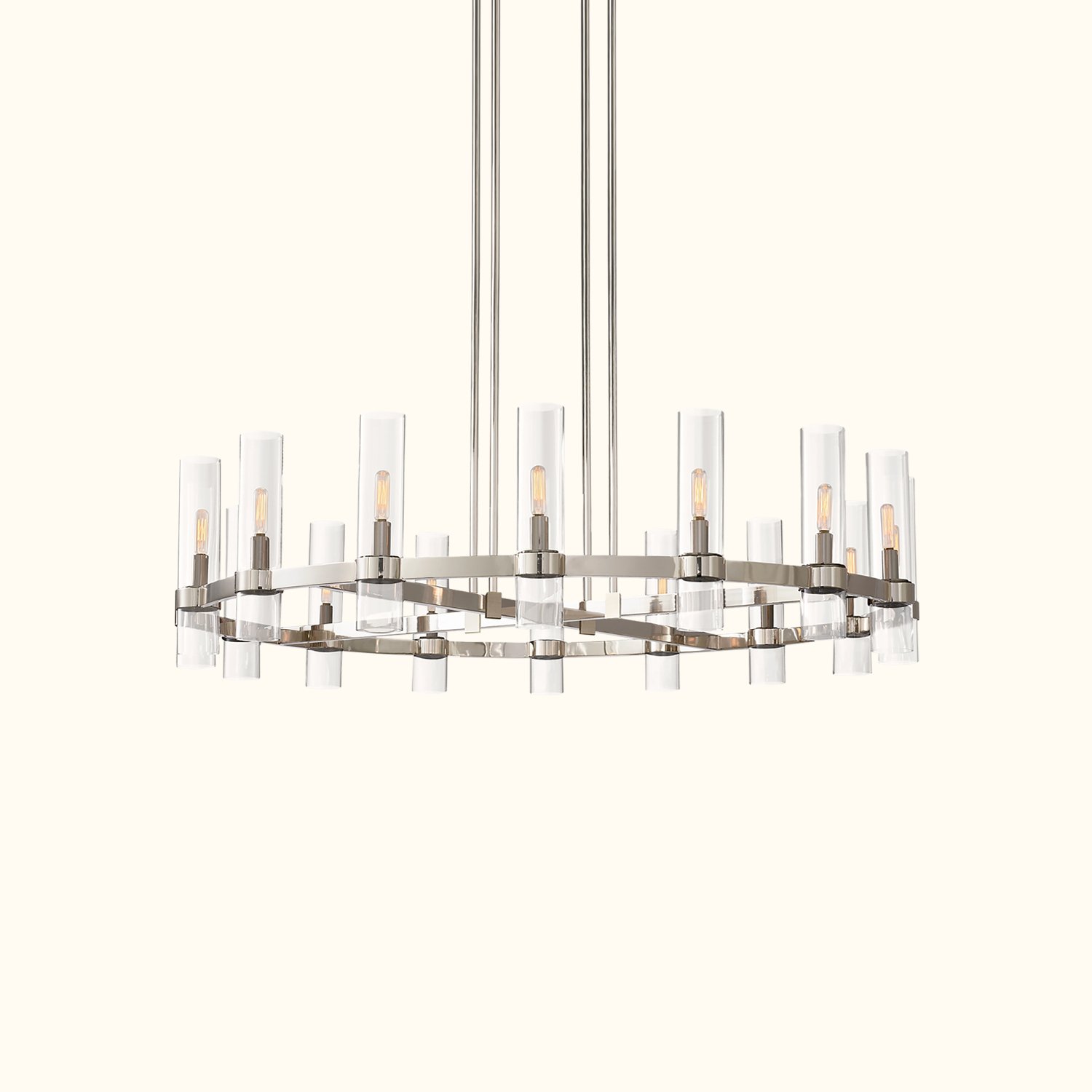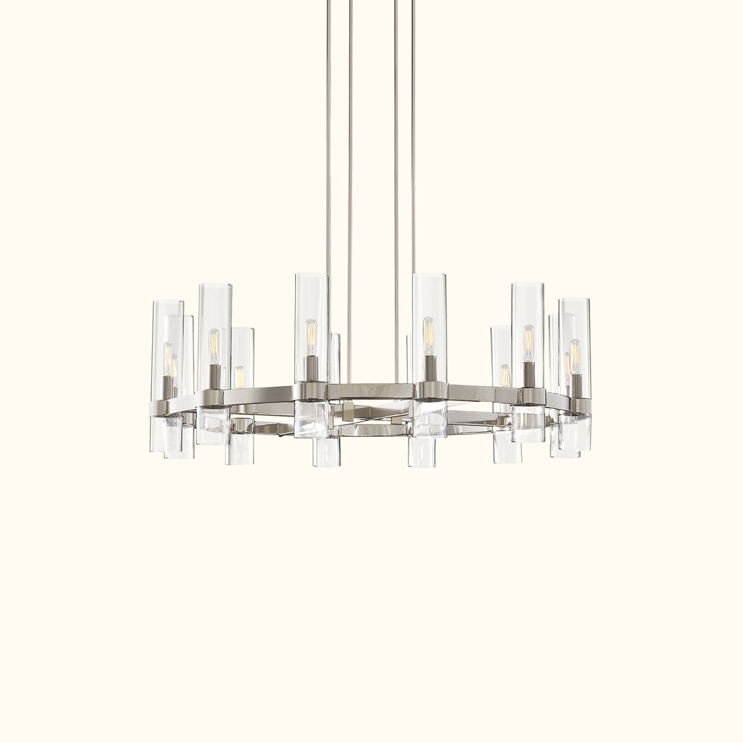 A renowned lighting designer reimagines Art Deco forms with a modern minimalist sensibility in this collection. Crafted from solid steel, unadorned metal bands securely hold the slender glass cylinders in place, maintaining perfect balance. Inside each shade, Edison bulbs glow like flickering candles.
