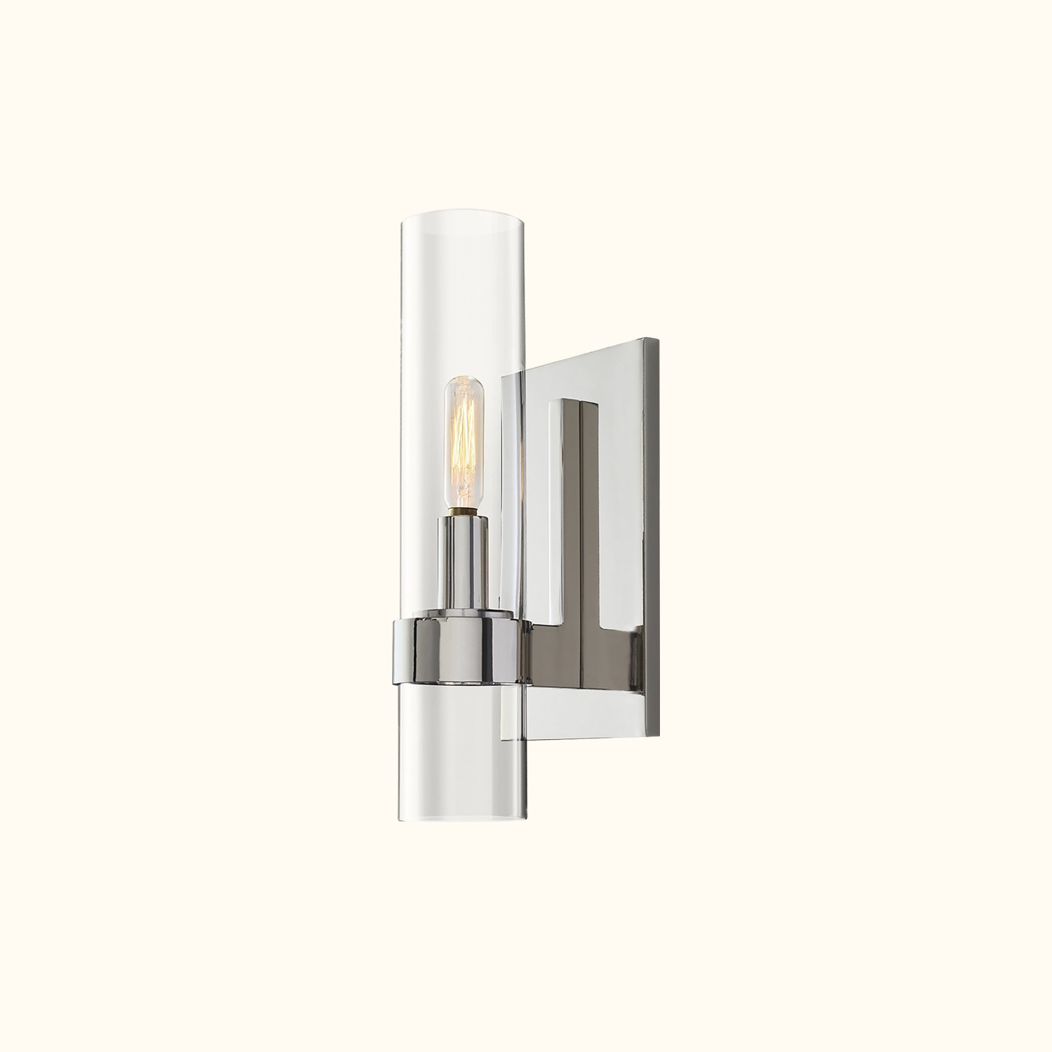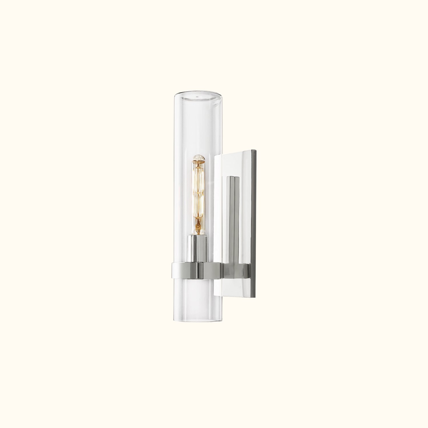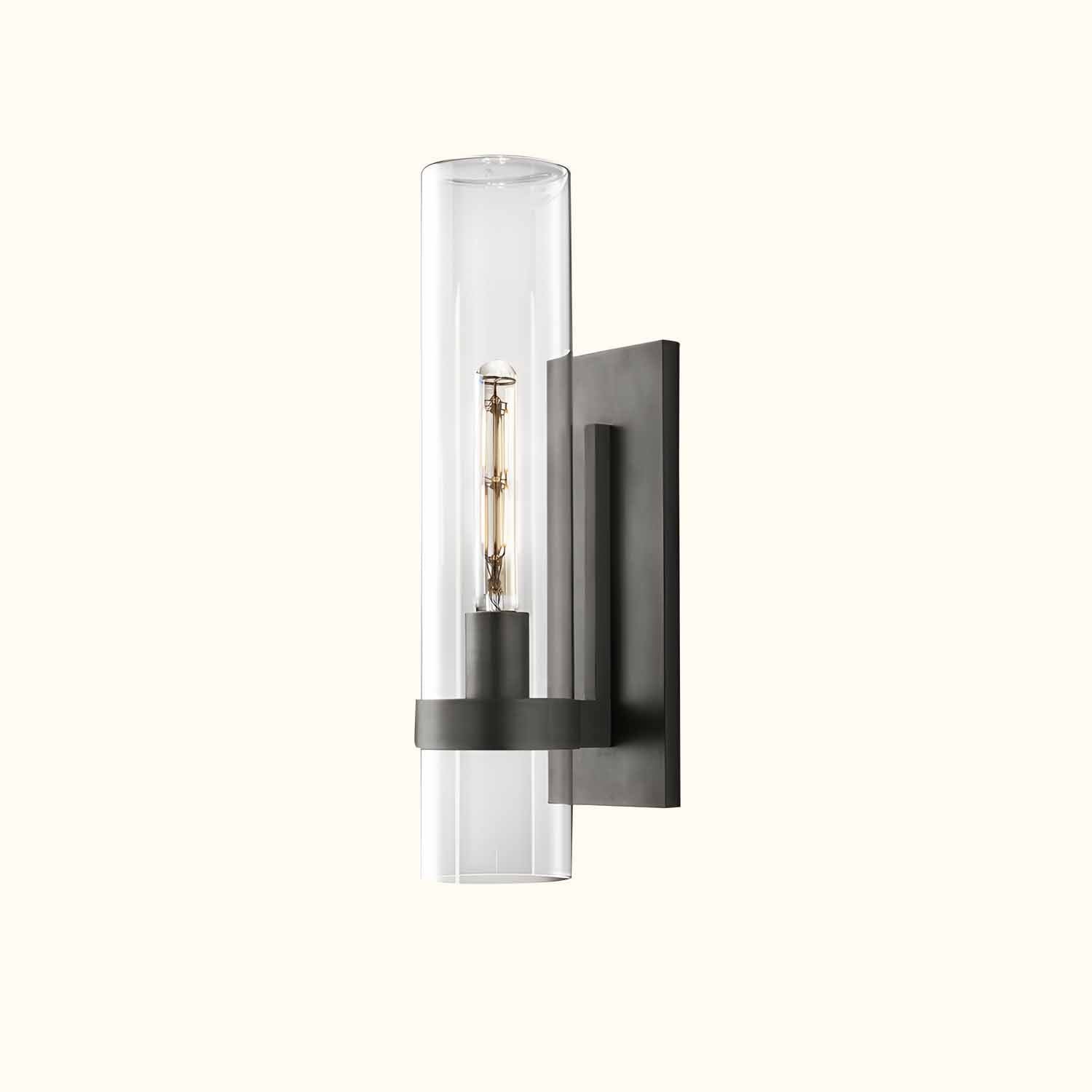 In this collection designed by a renowned lighting designer, Art Deco forms are reimagined with a modern minimalist sensibility. Crafted from solid steel, unadorned metal bands hold the slender glass cylinders in place, achieving a state of perfect balance. Inside each cylinder, Edison bulbs glow like flickering candles.
