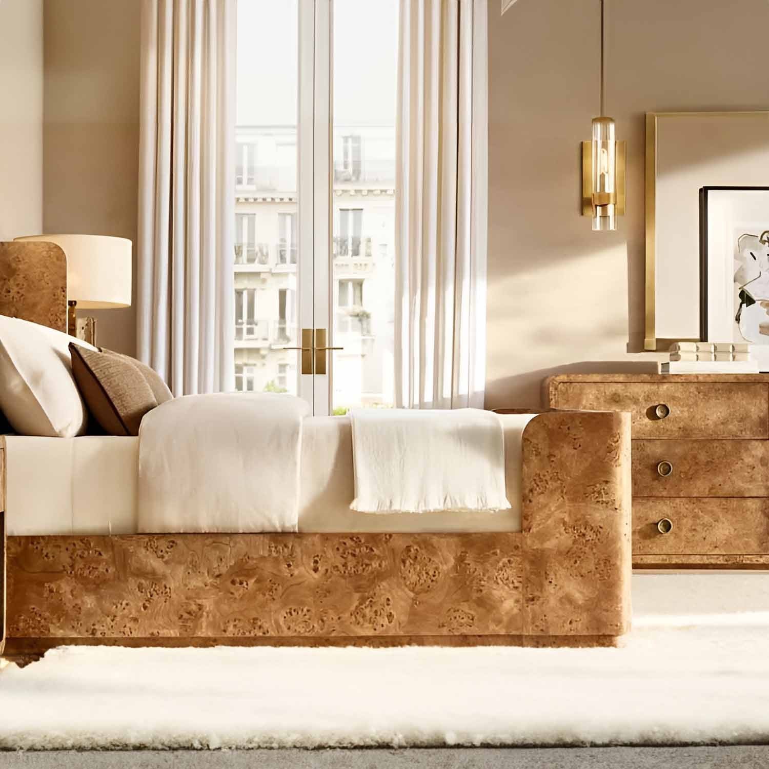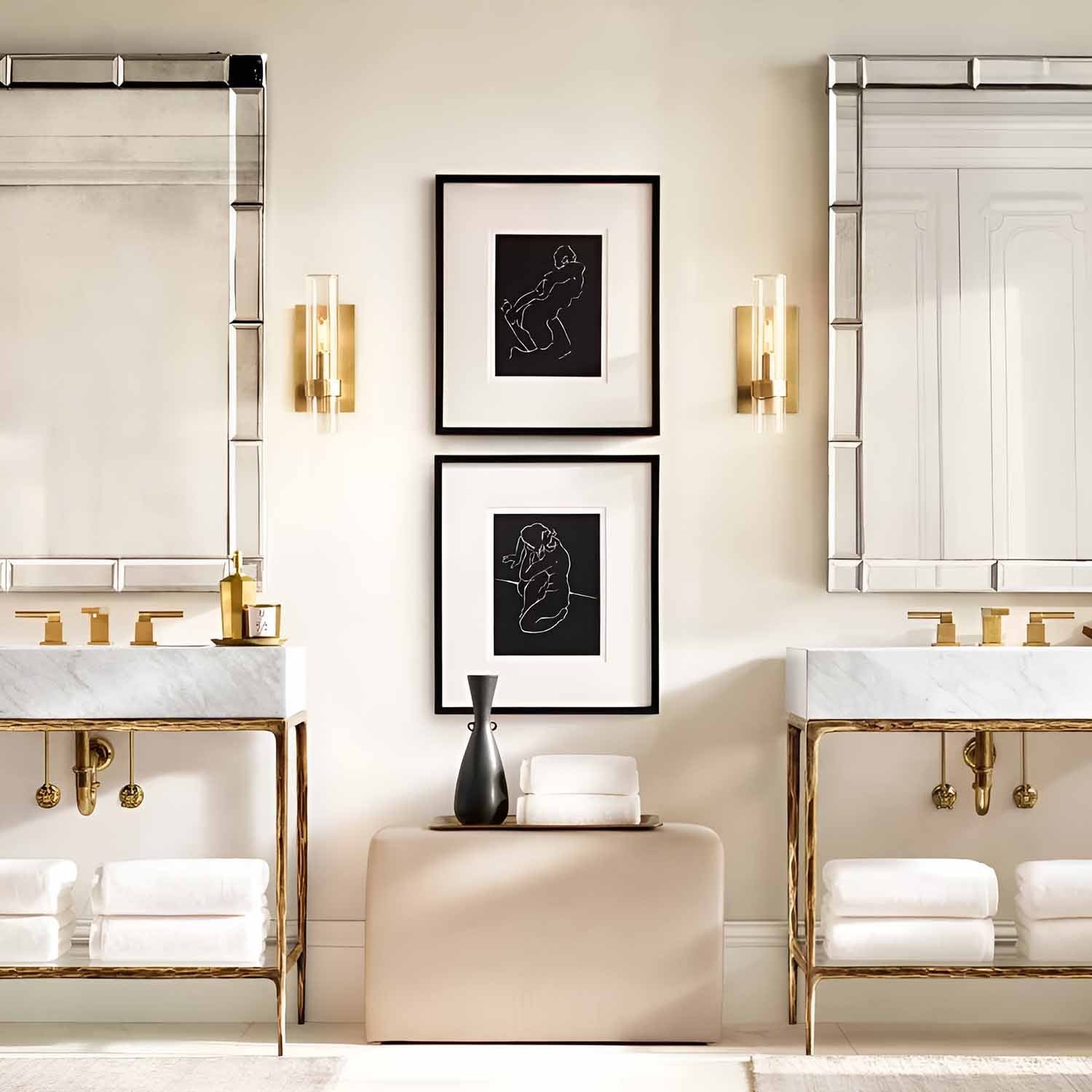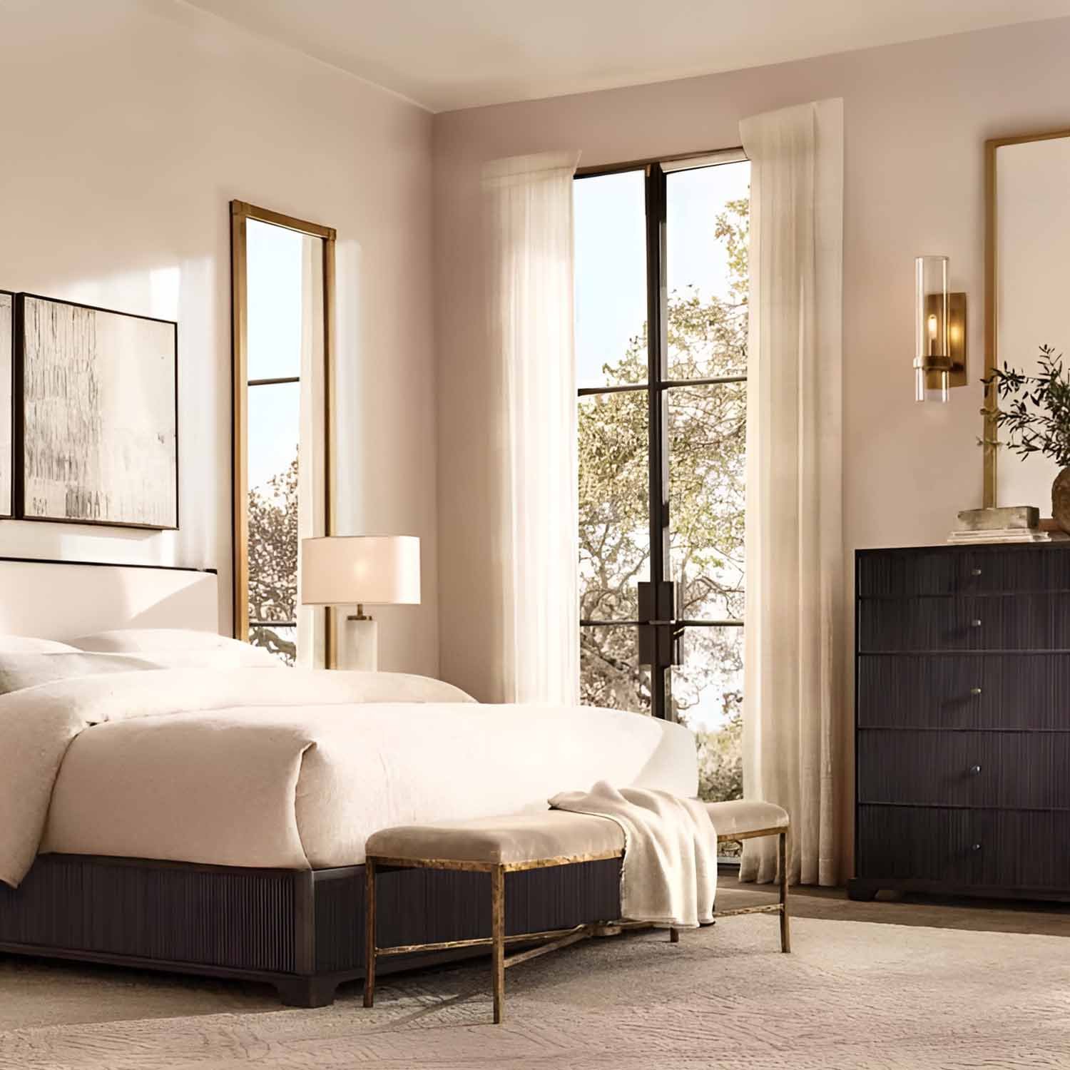 In this collection designed by a renowned lighting designer, Art Deco forms are reimagined with a modern minimalist sensibility. Crafted from solid steel, unadorned metal bands hold the slender glass cylinders in place, achieving a state of perfect balance. Inside each cylinder, Edison bulbs glow like flickering candles.