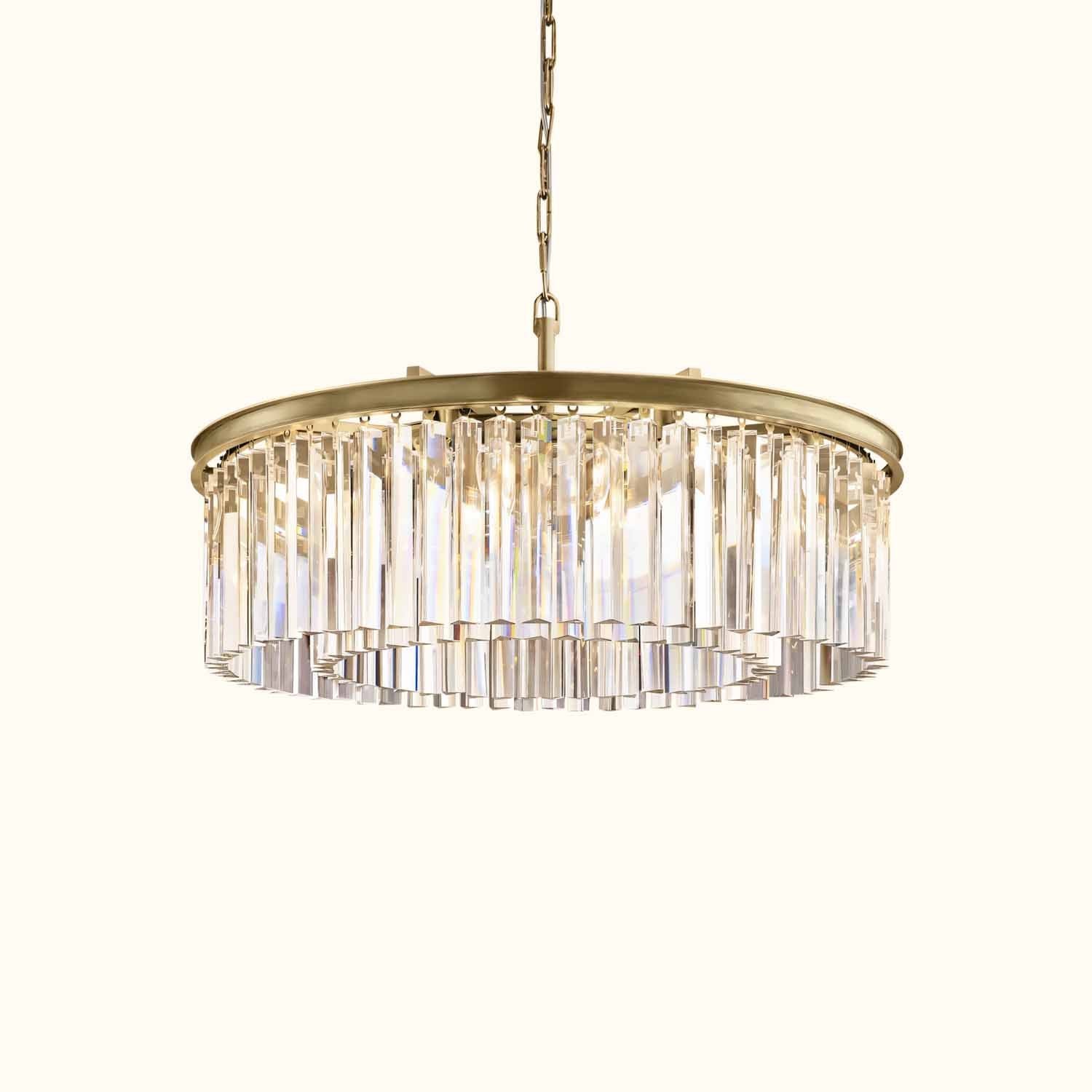 The Art Deco style, born in 1920s Paris, is reflected in the straight and curved lines of our elegant lighting design. Optical-quality prisms, arranged in even concentric rings, hang in sparkling harmony from an iron frame.