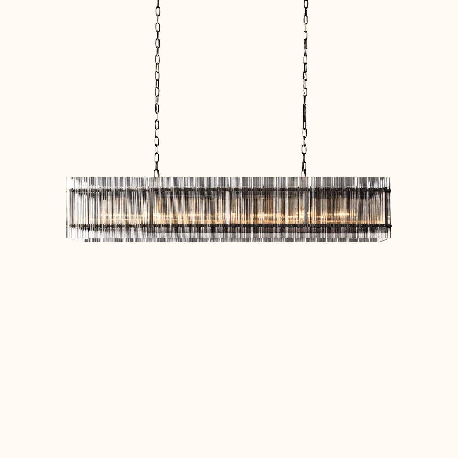 Our fixture, designed by a renowned designer, evokes the charm of 1960s Italian glass lighting. Within the metal frame are dozens of glass panels, each hand-carved with a unique fluted texture, creating a dramatic interplay of light and casting a soft glow.