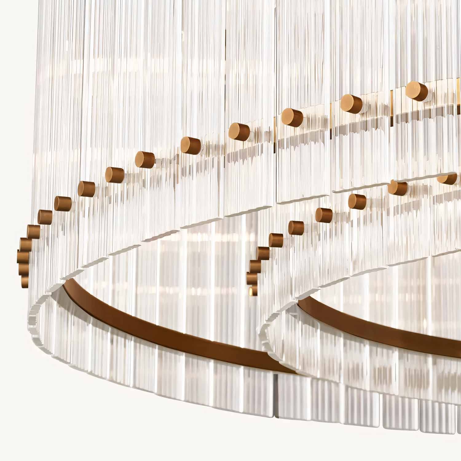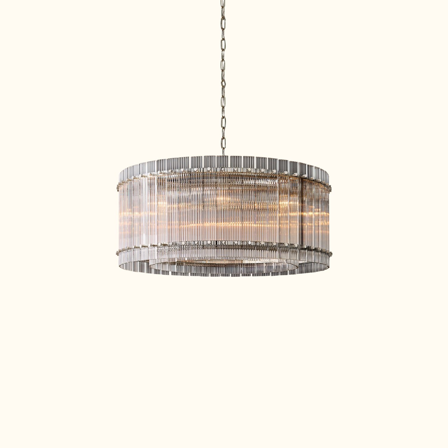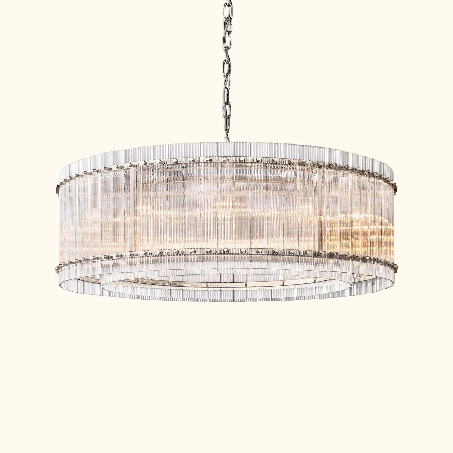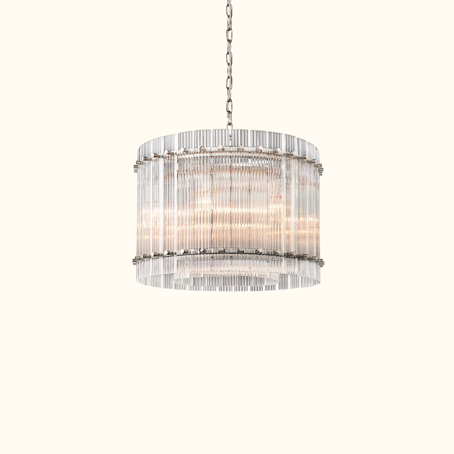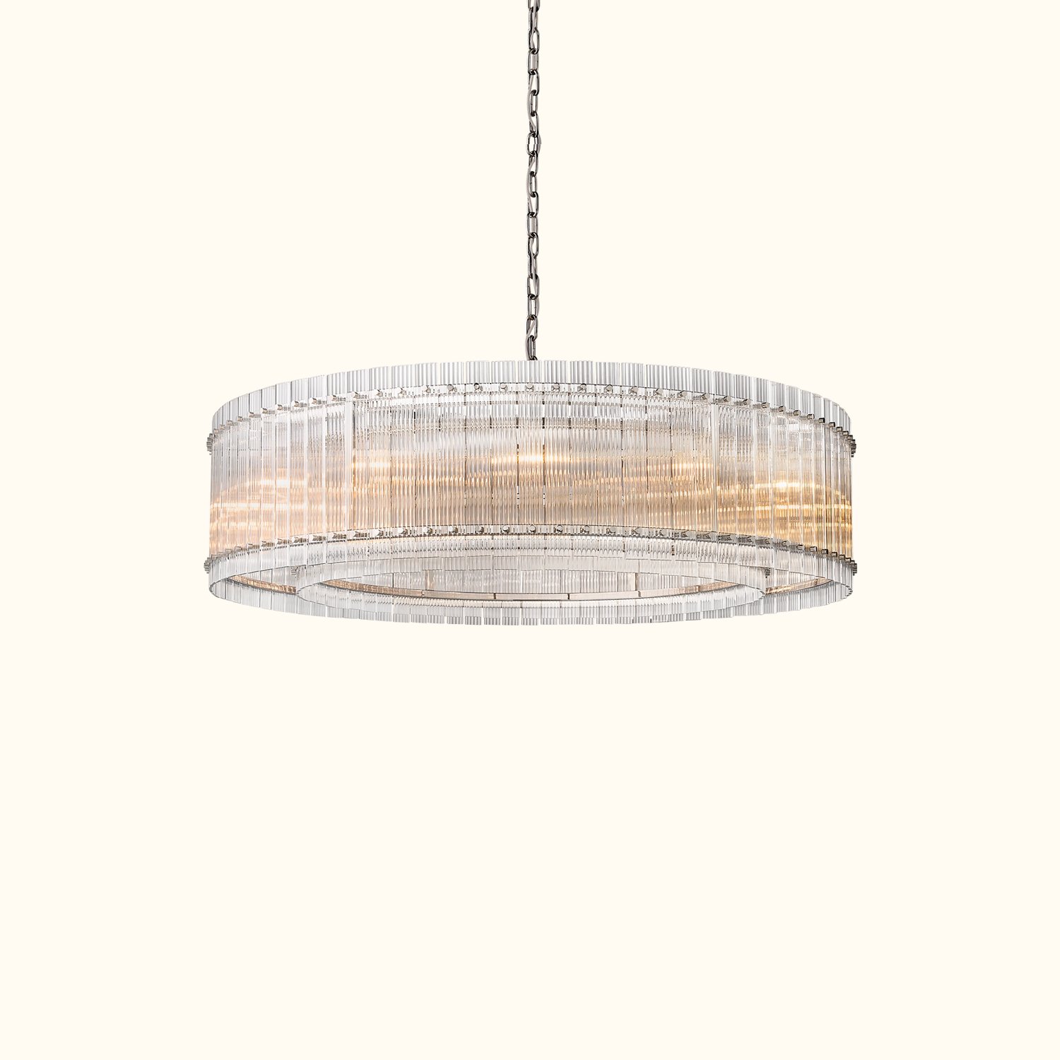 Our fixture, designed by a renowned designer, evokes the glamour of 1960s Italian glass lighting. Dozens of glass panes are hand-finished with a fluted texture and arranged within a sleek metal frame, creating a dramatic play of light and a softly diffused glow.