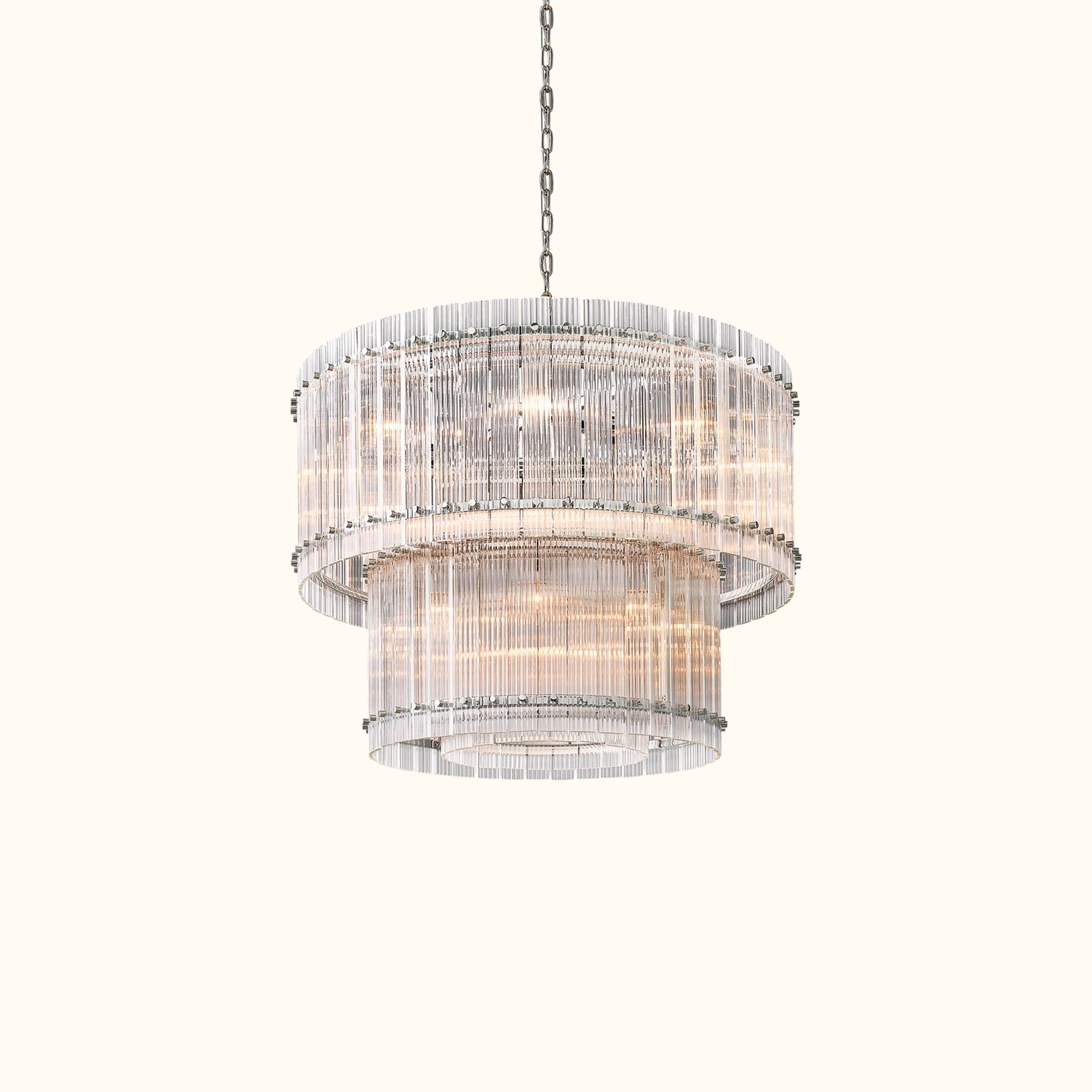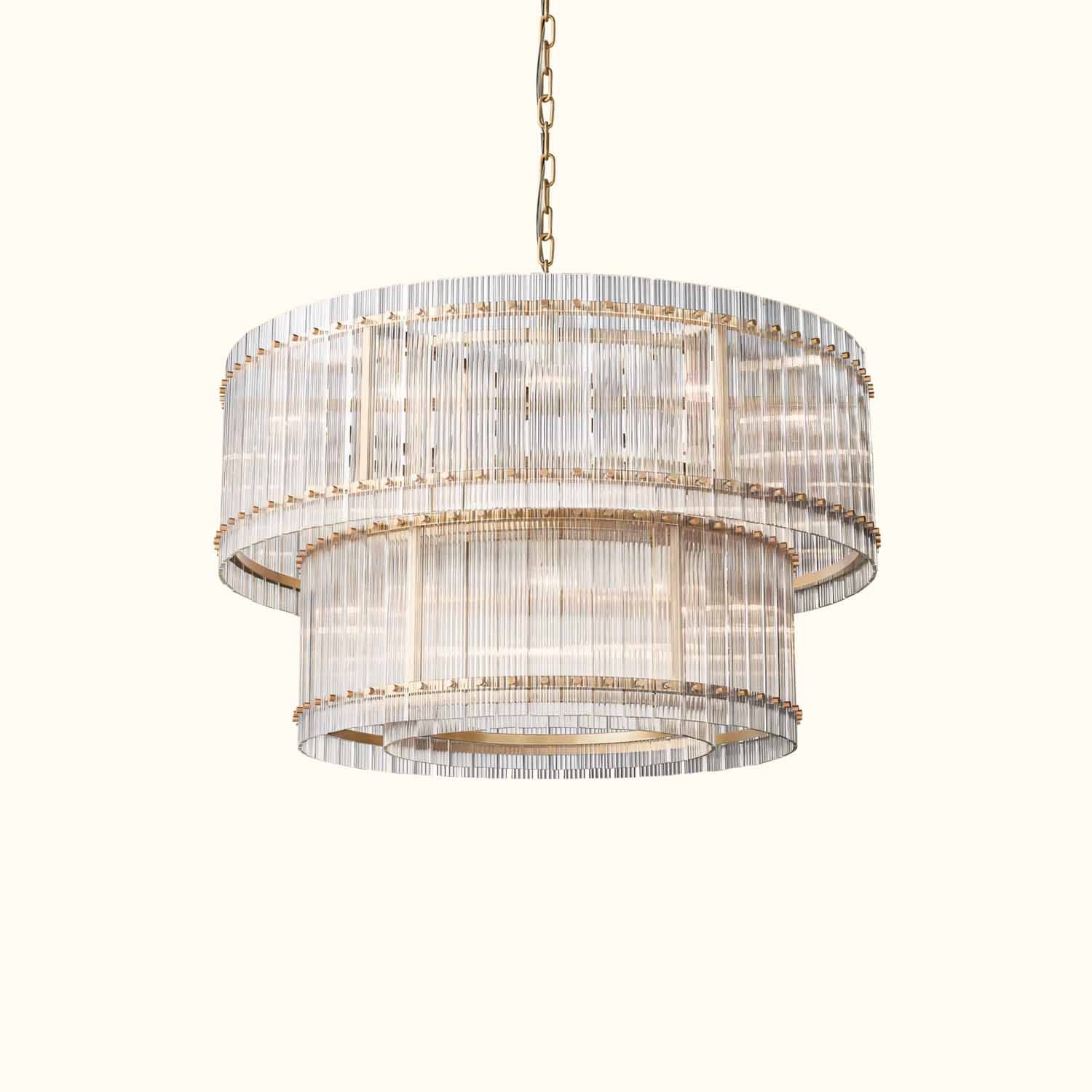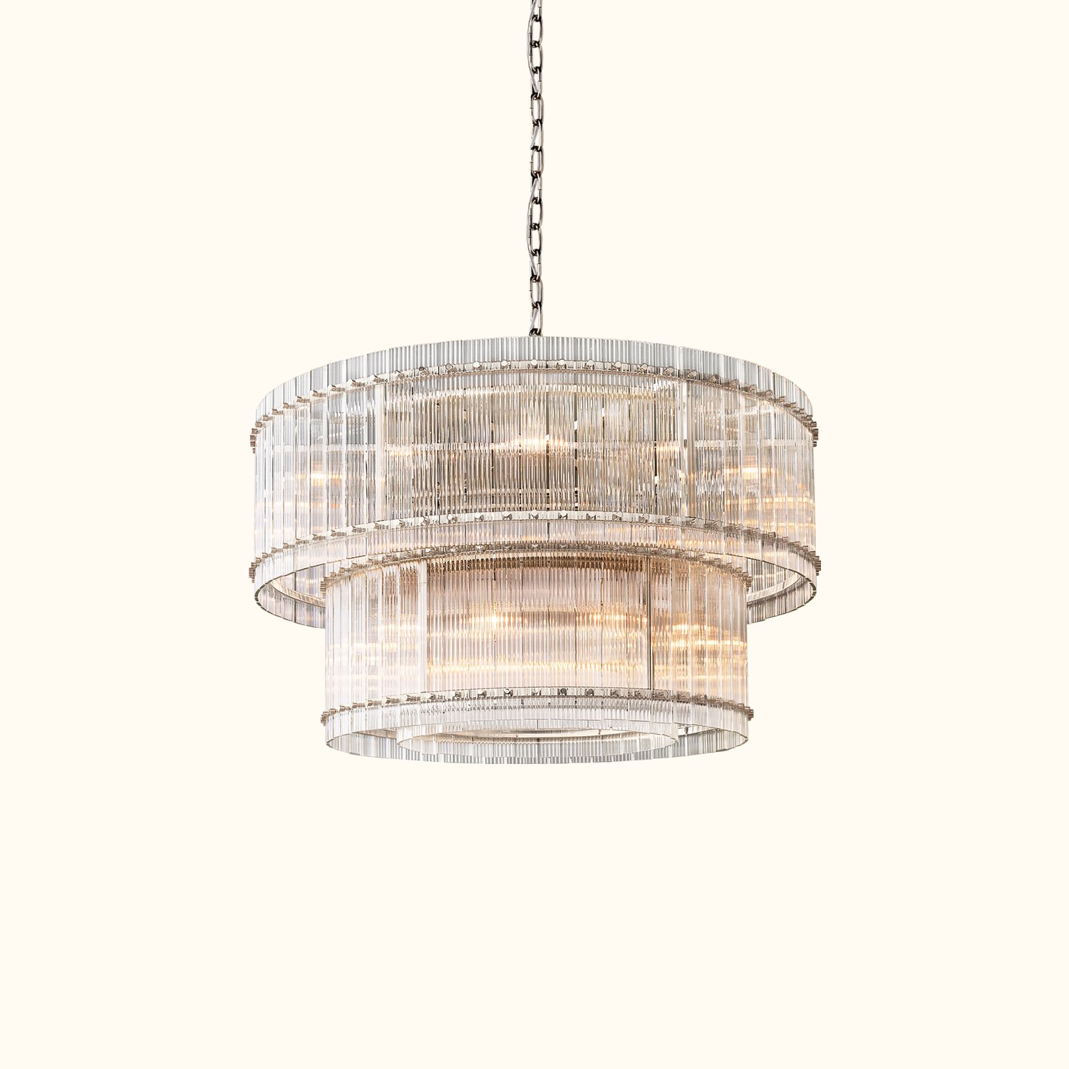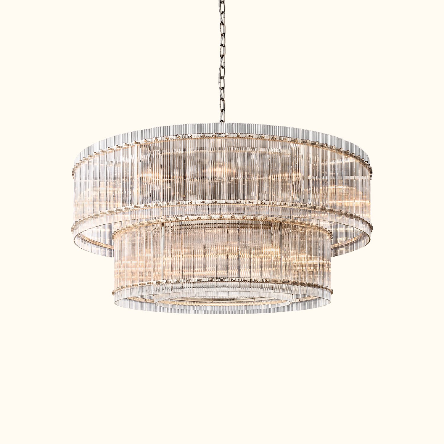 Our fixture, designed by a renowned designer, evokes the glamour of 1960s Italian glass lighting. Dozens of glass panes are arranged within a sleek metal frame, hand-raked to create a fluted texture that produces a dramatic play of light and emits a softly diffused glow.