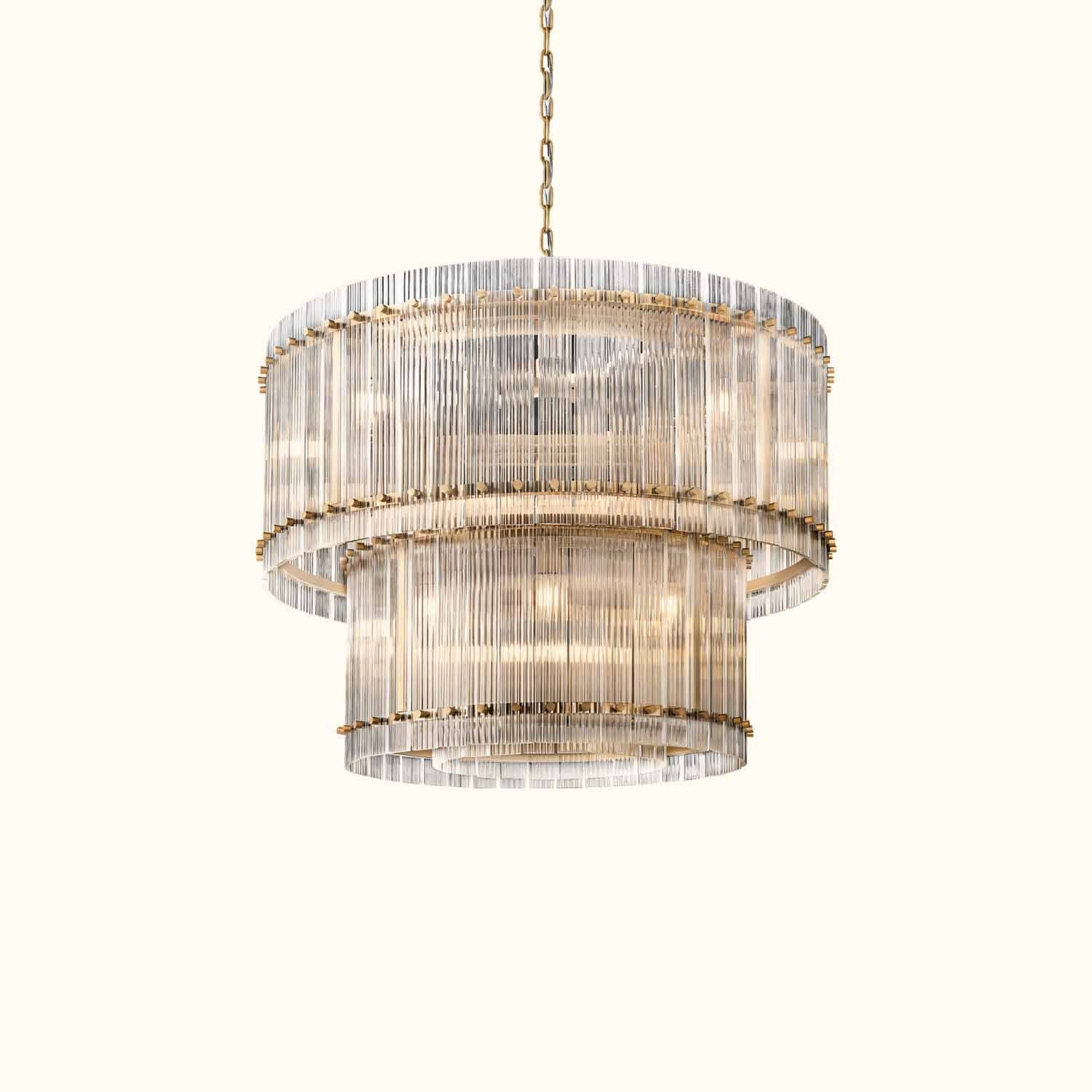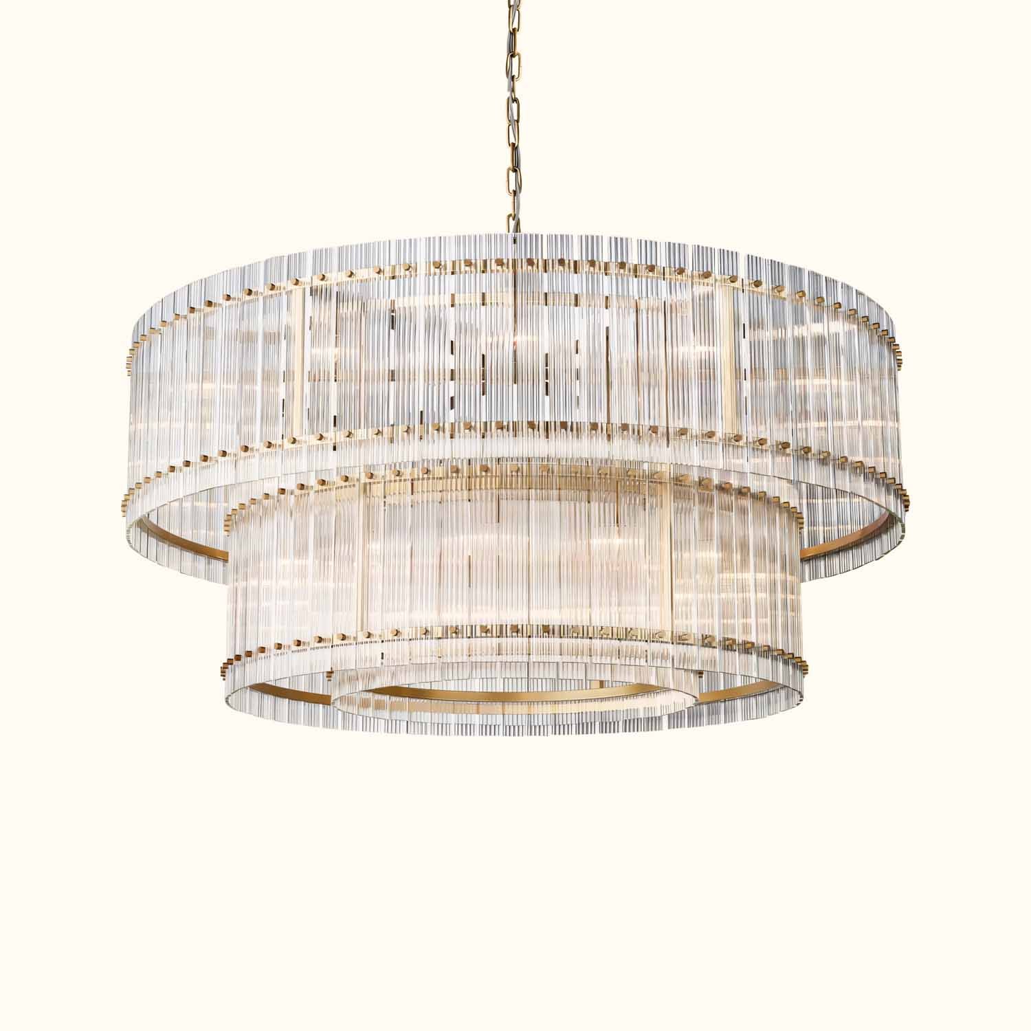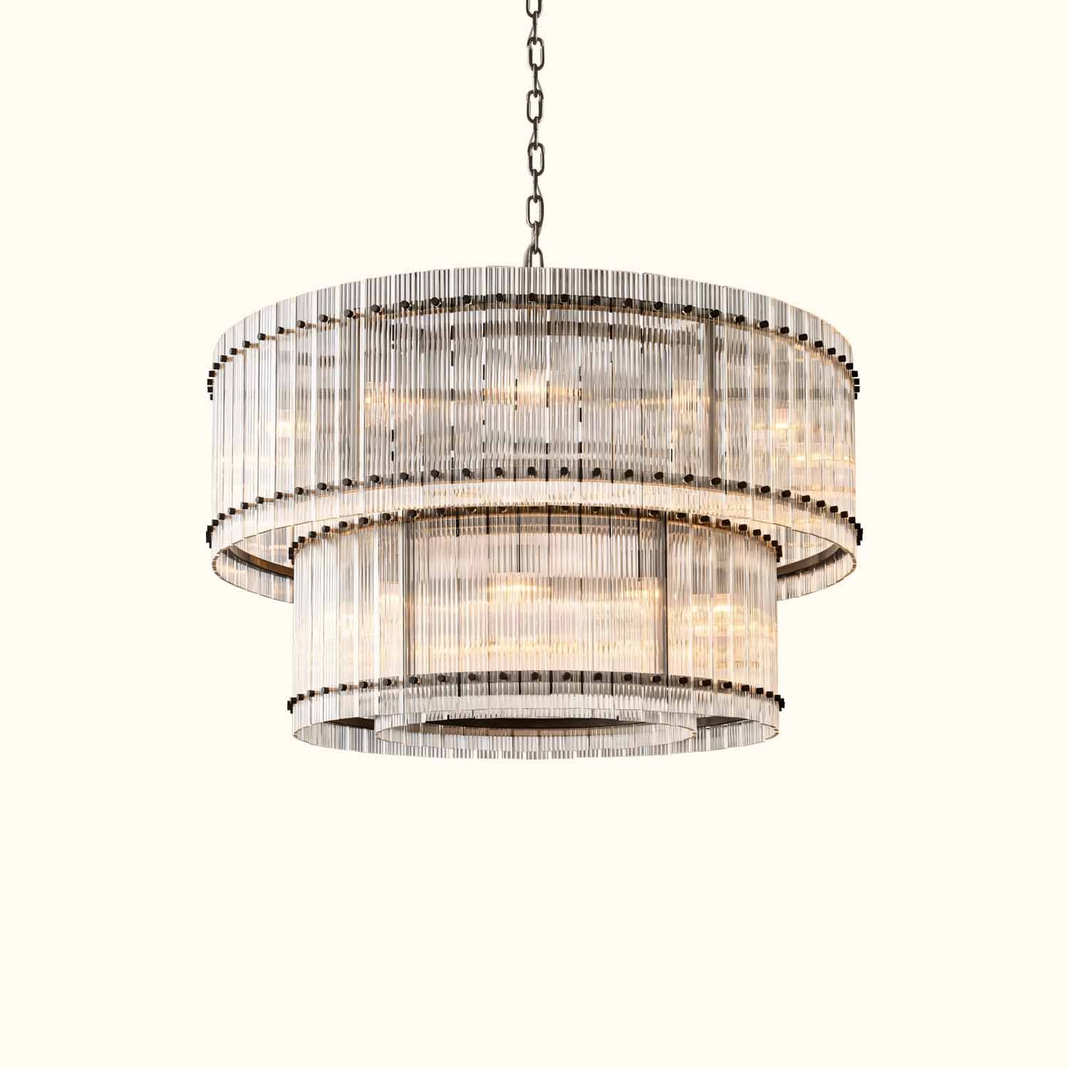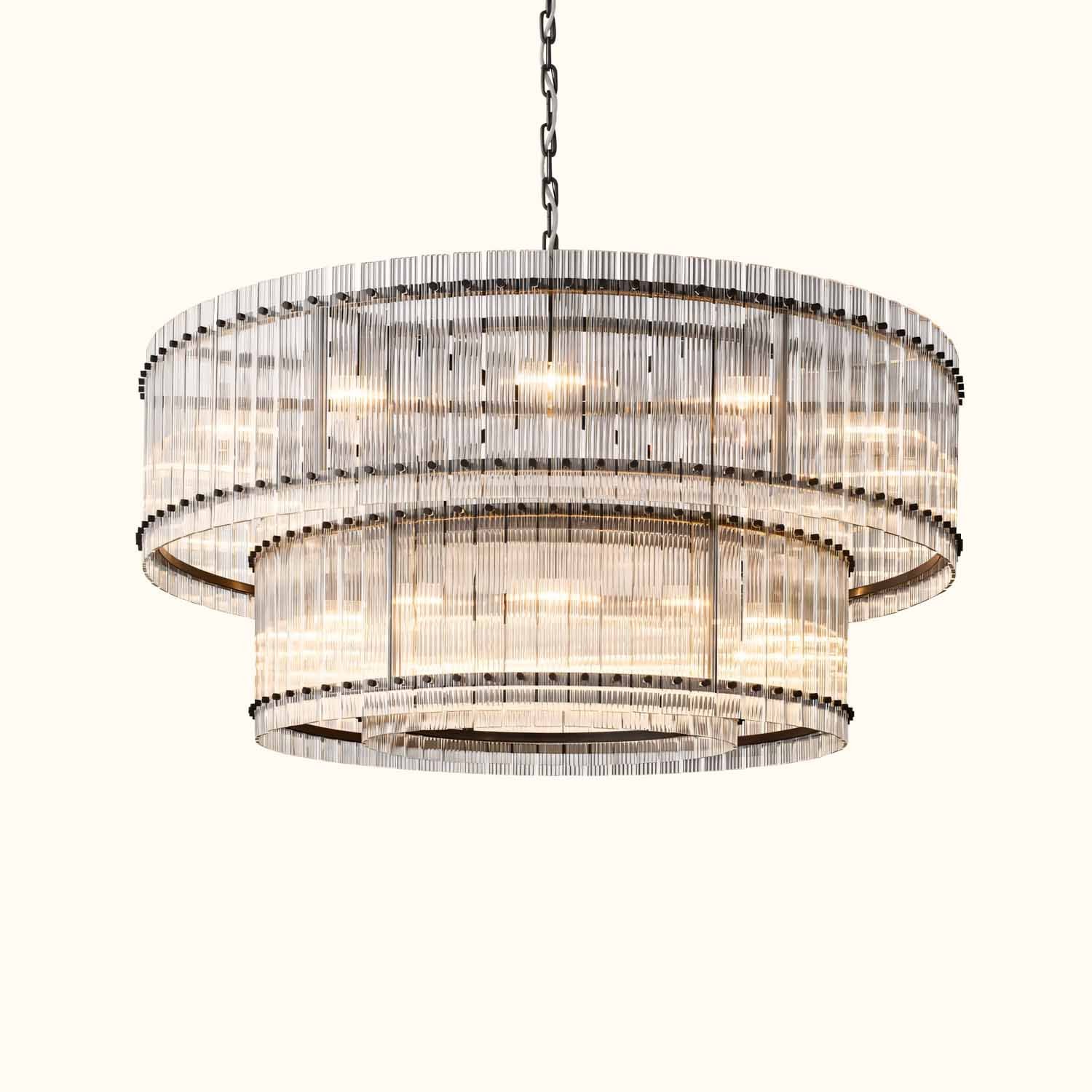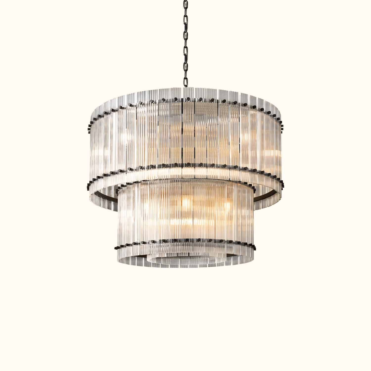 Our fixture, designed by a renowned designer, evokes the glamour of 1960s Italian glass lighting. Dozens of glass panes are arranged within a sleek metal frame, hand-raked to create a fluted texture that produces a dramatic play of light and emits a softly diffused glow.