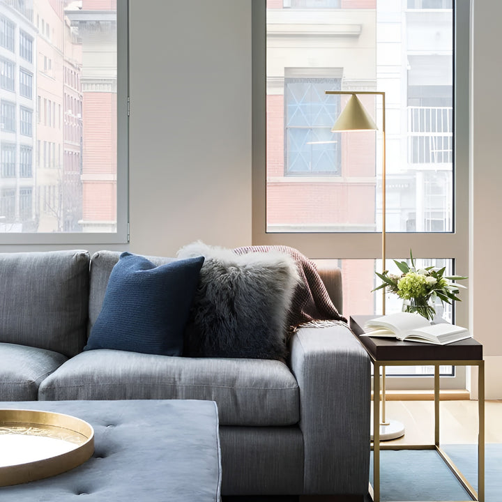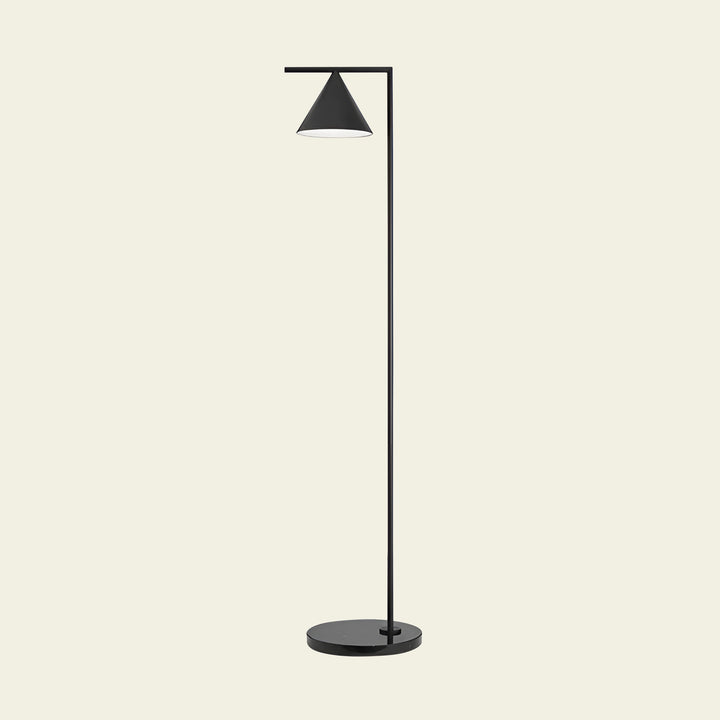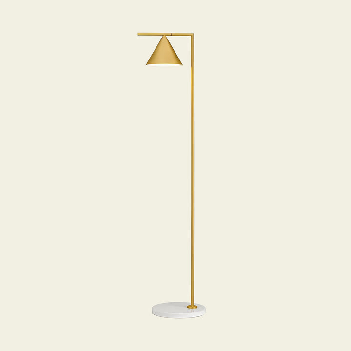 This floor lamp provides adjustable direct light. The stem is available in painted steel or brushed brass, with a metal spinning cone. It features an opal photoengraved PC diffuser made through injection molding. The base is made of white Carrara marble or black Marquina marble. The power cord is 260 cm long and comes with a foot dimmer switch that provides ON-OFF functions and 10-100% light adjustment. It includes a plug-in power supply with interchangeable plugs.