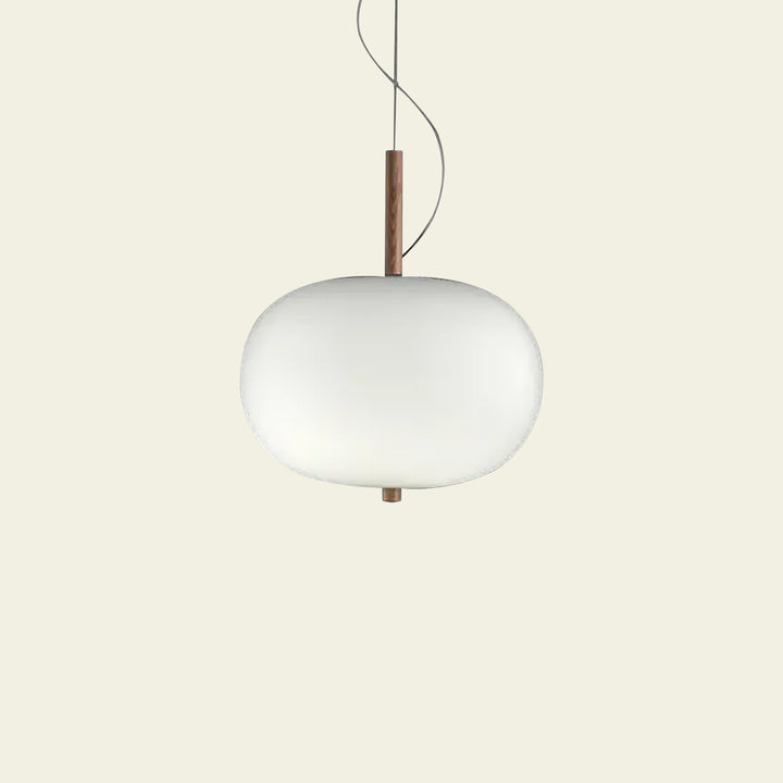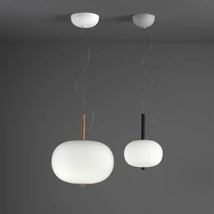 This lamp evokes the "moon" of the Basque region, featuring a subtle and minimalist design that includes a wooden stick inserted into a hand-blown glass sphere. Reminiscent of an art sculpture, the light hangs in the air, with two sizes of glass combining to create a double suspension.