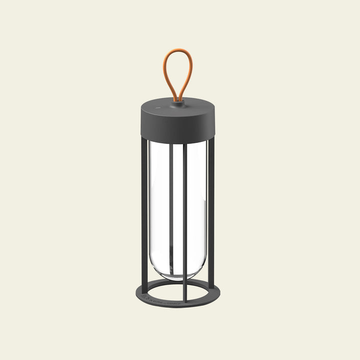 Outdoor wireless rechargeable table lamp that provides diffuse light through an integrated LED source, ensuring a uniform glow.