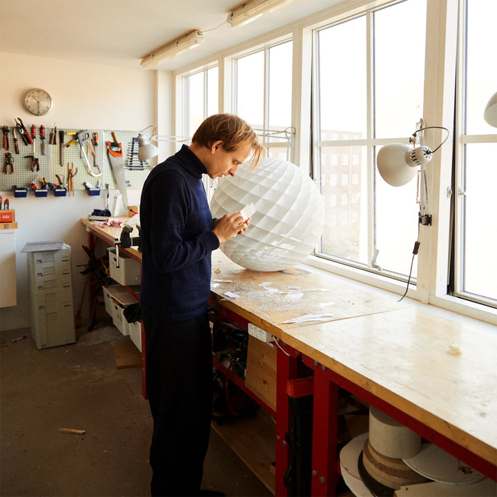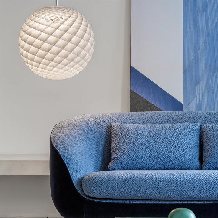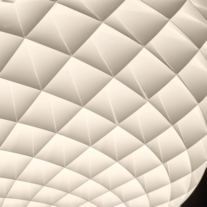This spherical pendant emits a glare-free glow, reflected by the small diamond-shaped units that make up the fixture. The structure of the lamp ensures that there is no glare when the light is above 45 degrees, while also allowing the fixture to emit light both downward and upward, illuminating the ceiling and adding more ambiance to the surrounding environment. Each unit shapes the light by creating a soft transition between direct and reflected light, highlighting the extraordinary glow of the pendant.